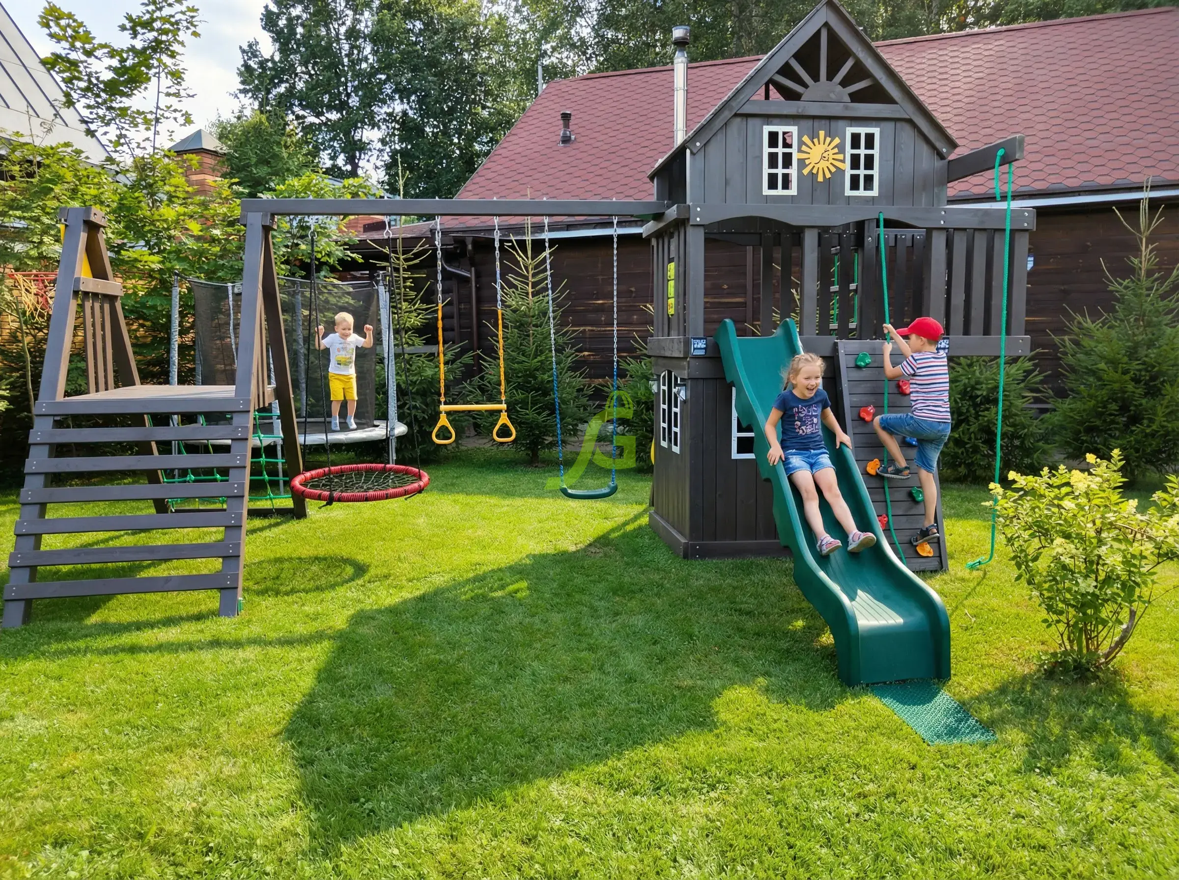 Спортивно игровой комплекс с обилием игровых зон и выбором активностей послужит украшением для вашего загородного участка.