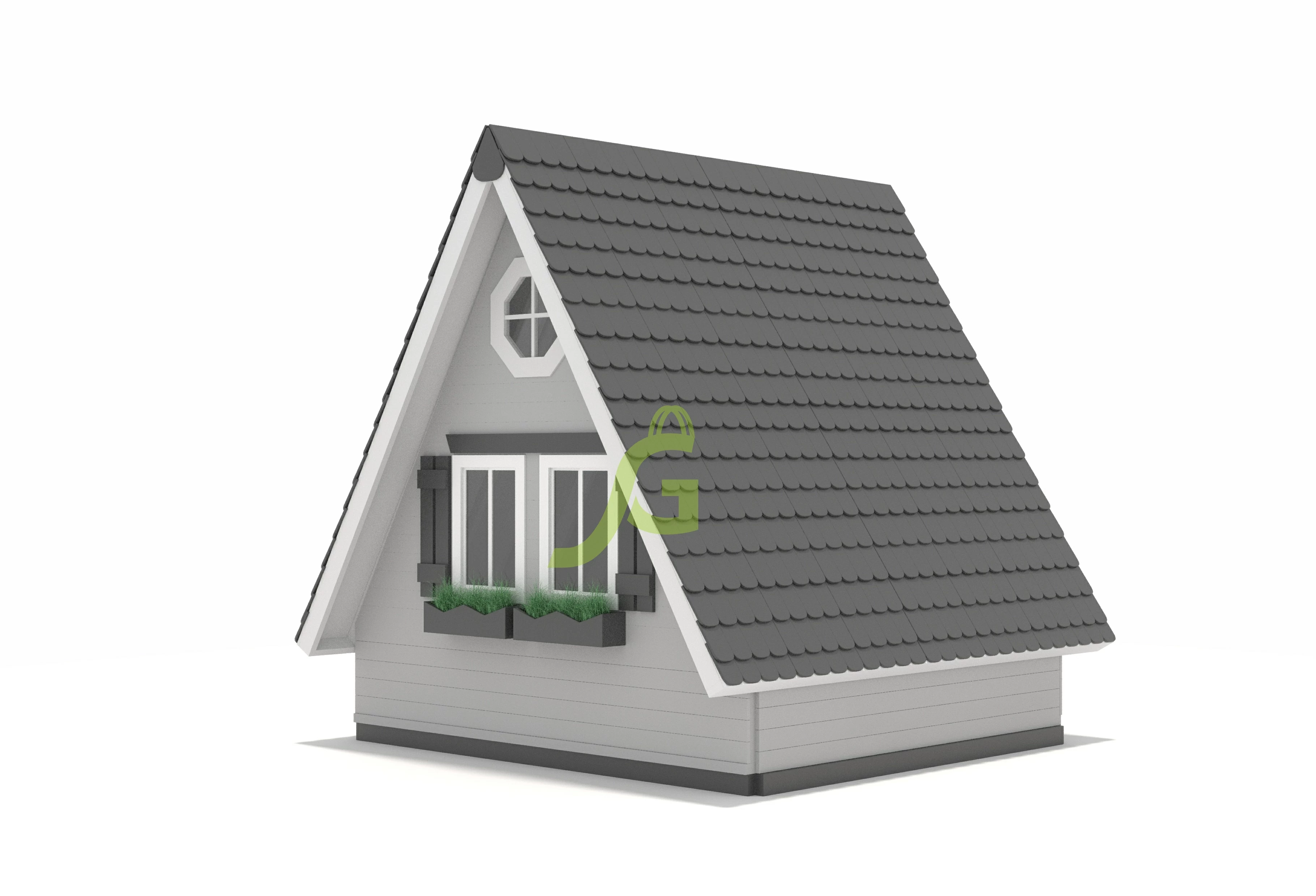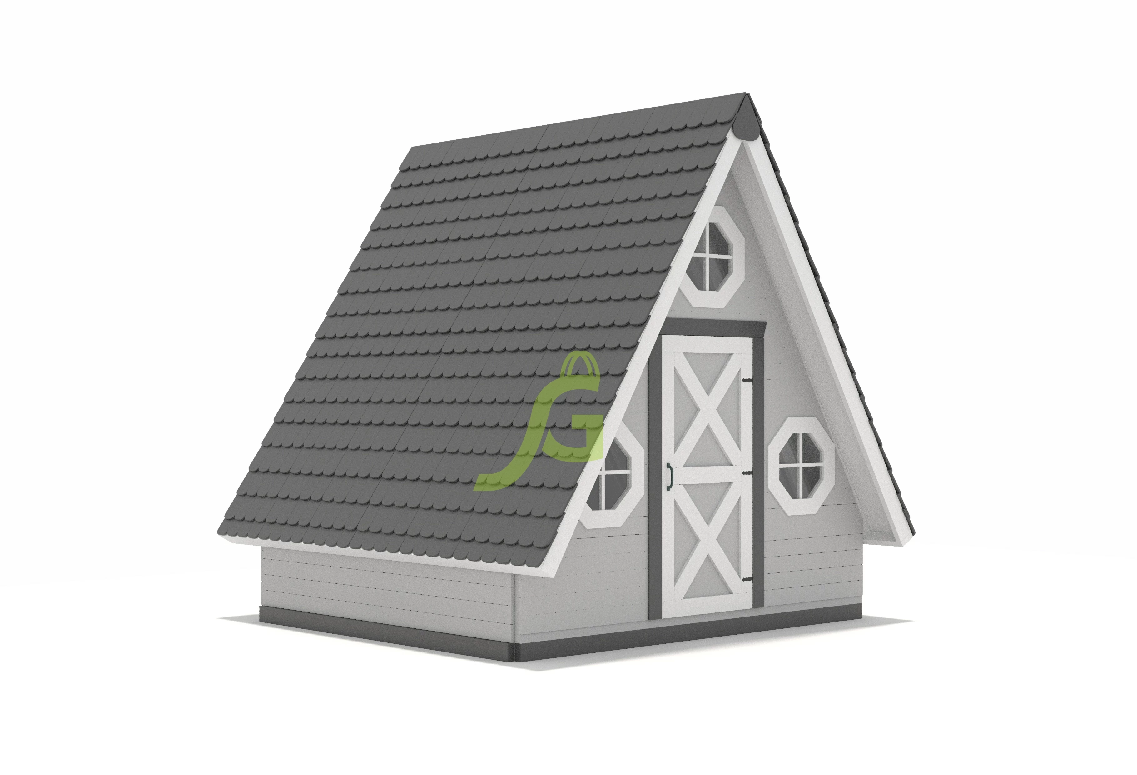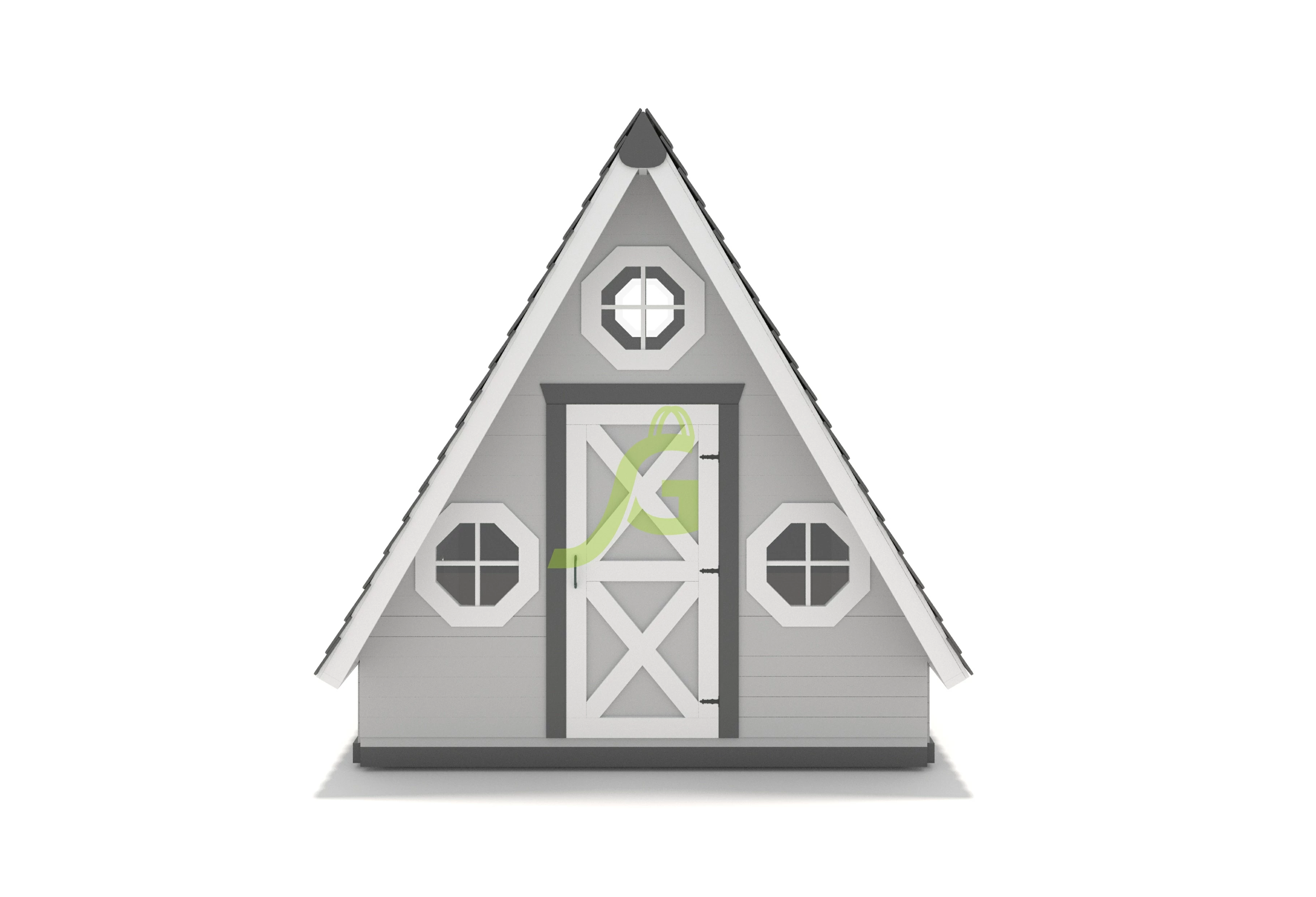 В игровой комплекс входят закрытый двухуровневый деревянный домик, оснащенный дверью, крышей, пластиковым окошком.