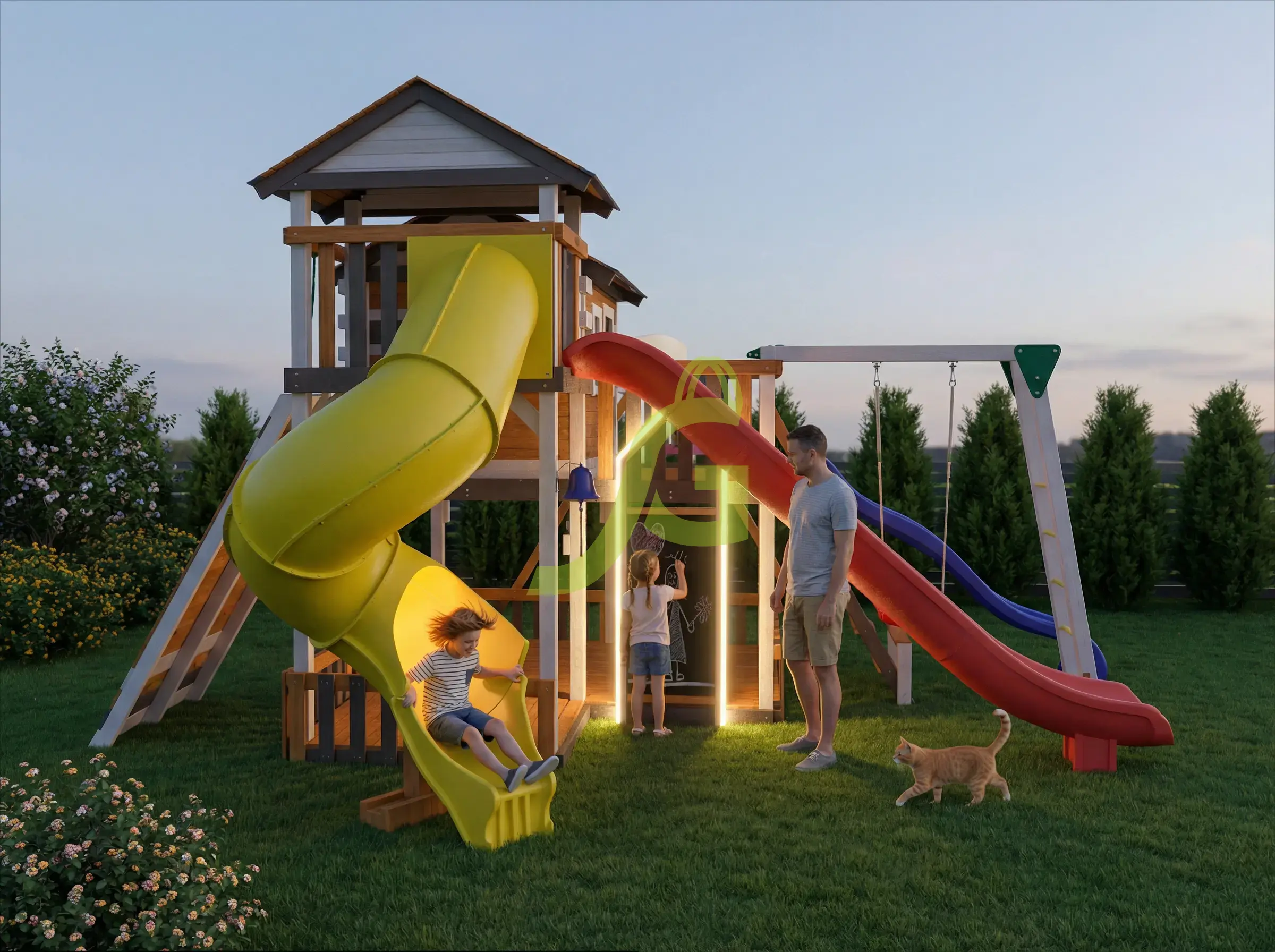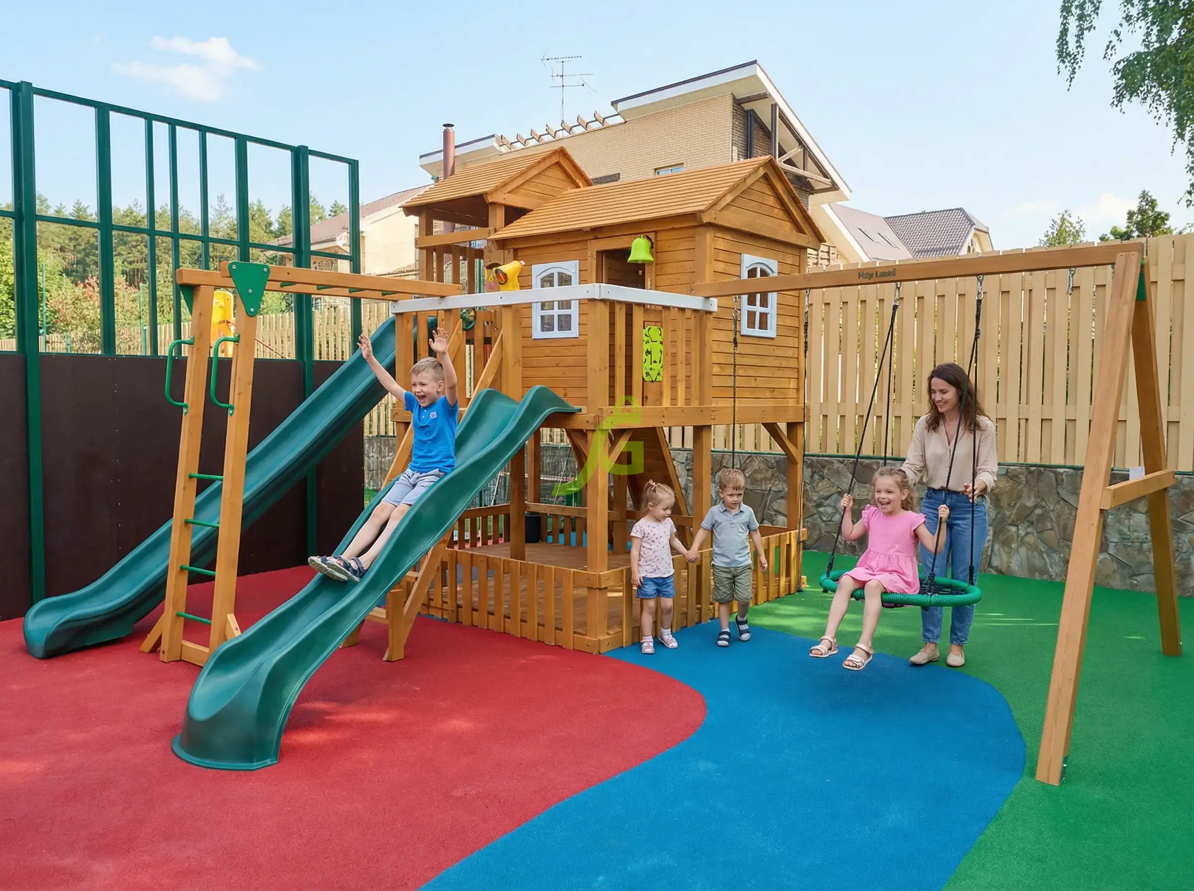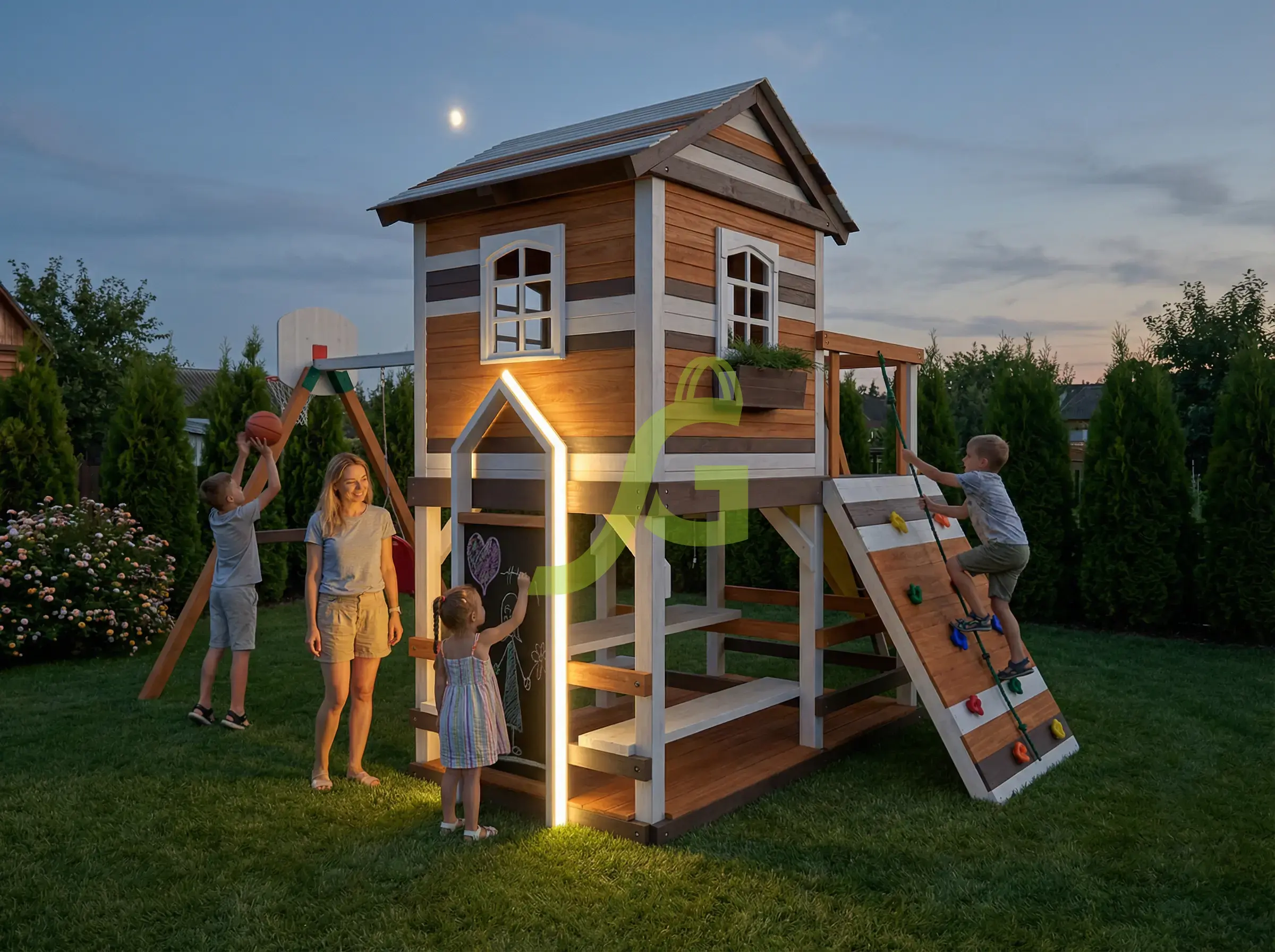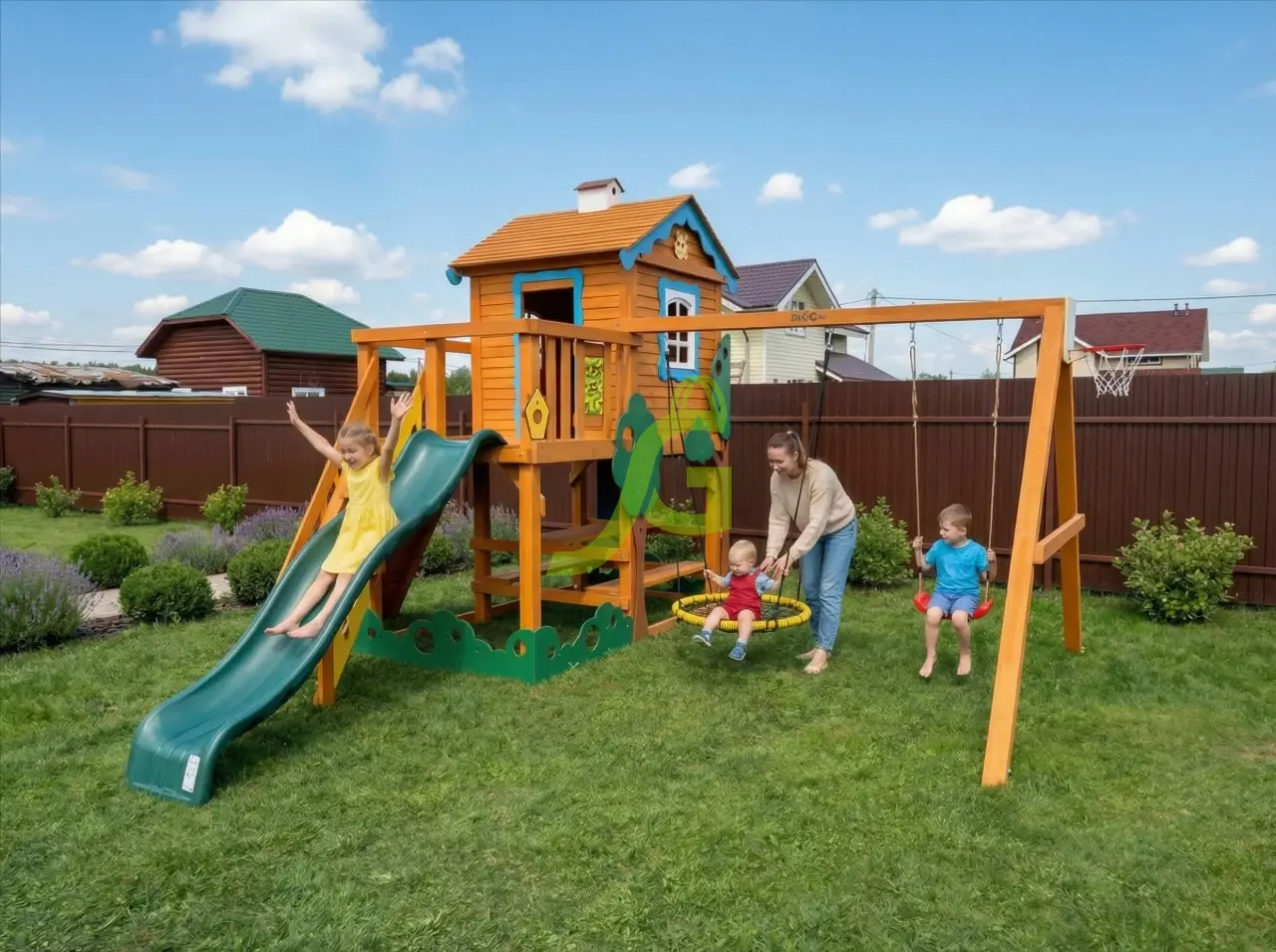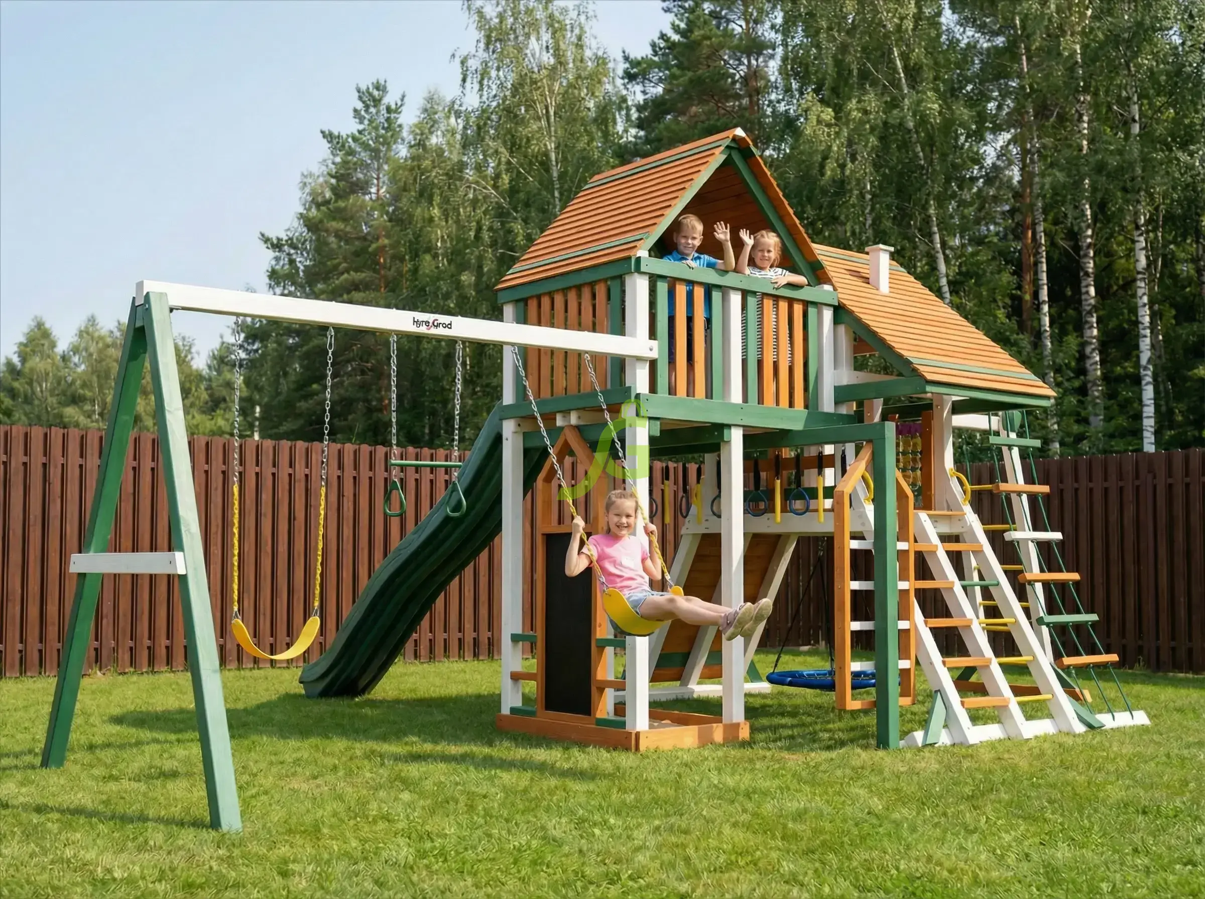 В игровой комплекс входят закрытый двухуровневый деревянный домик, оснащенный дверью, крышей, пластиковым окошком.