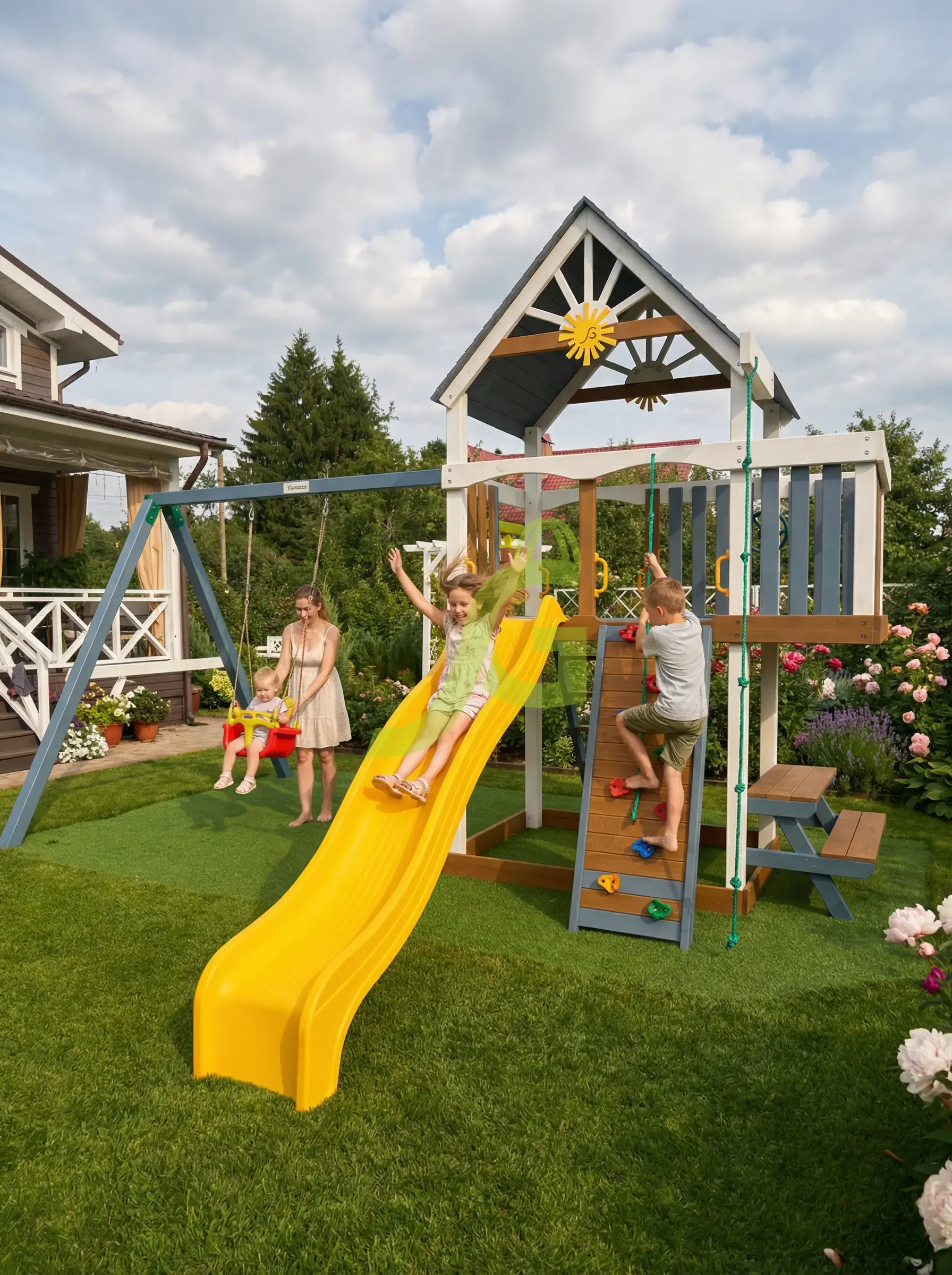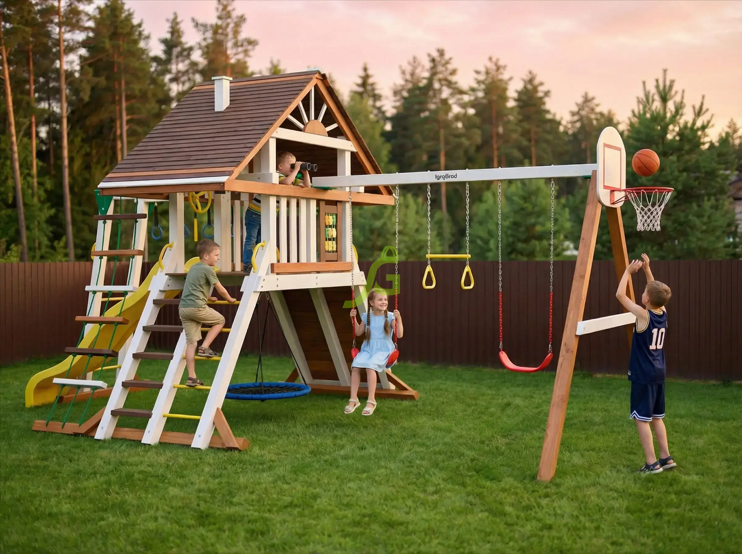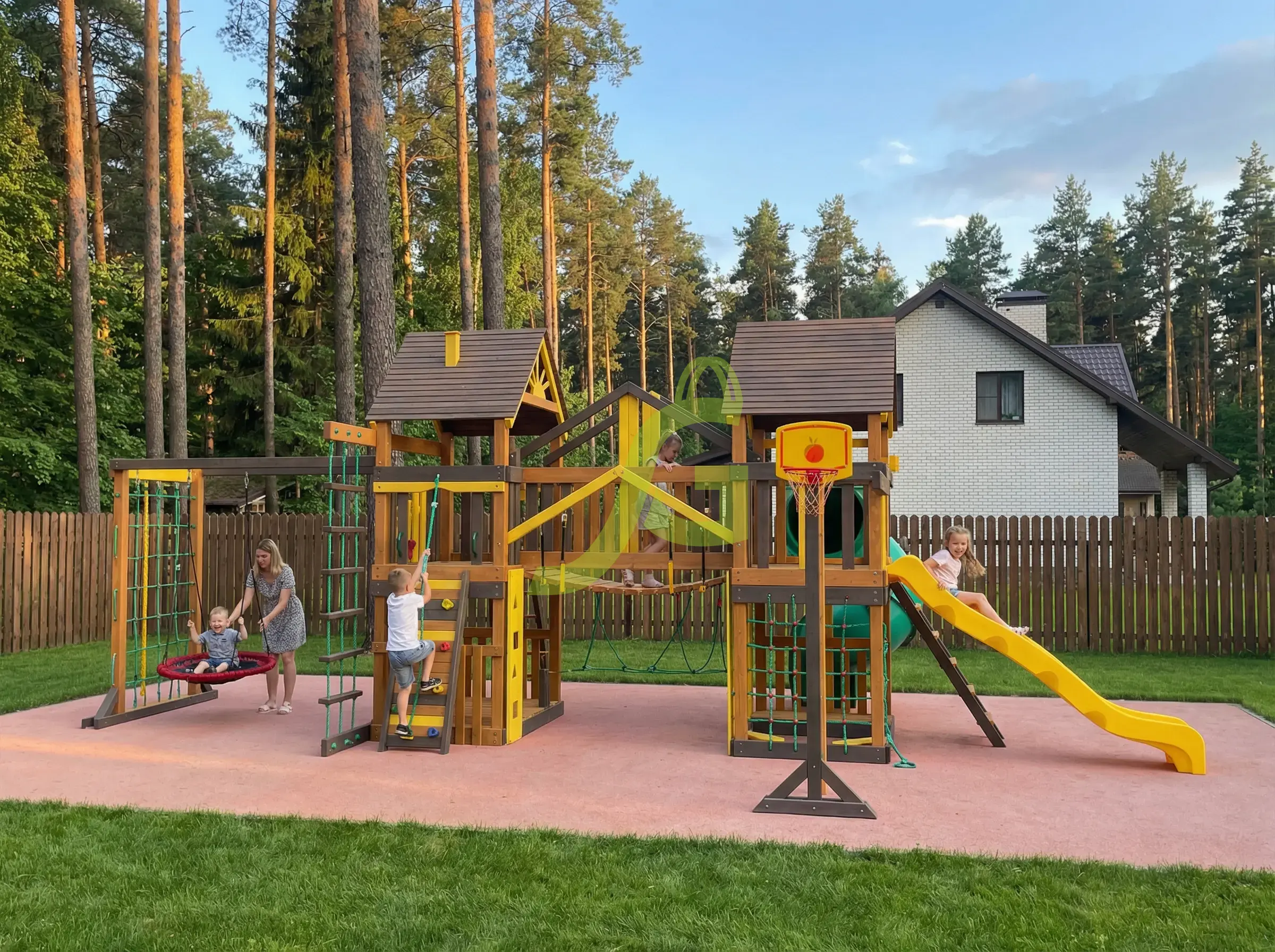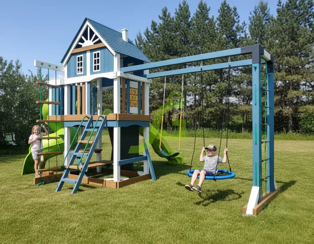Спортивно игровой комплекс с обилием игровых зон и выбором активностей послужит украшением для вашего загородного участка.