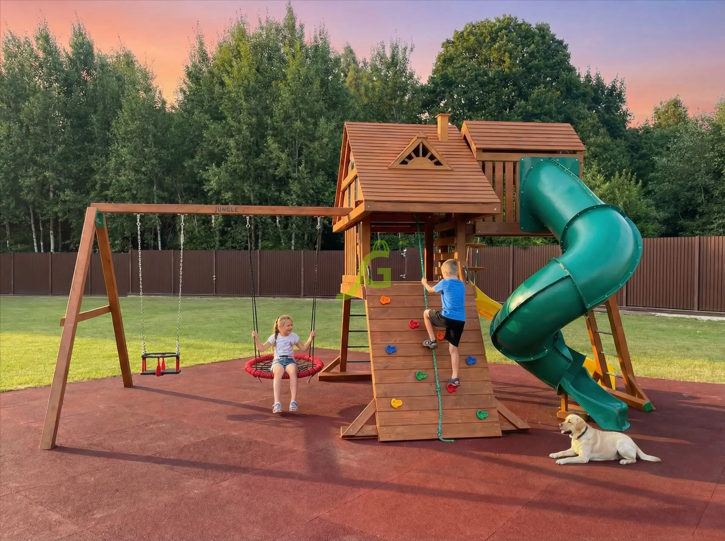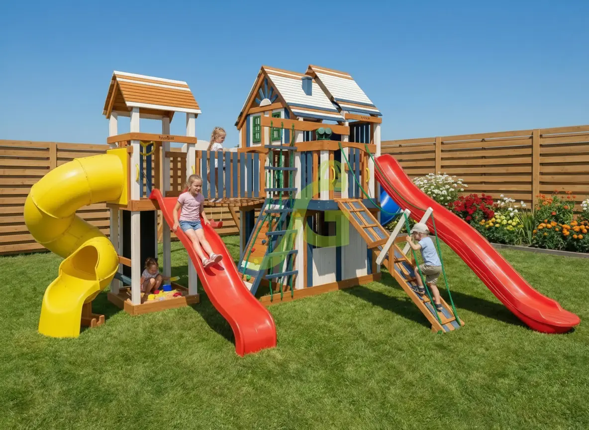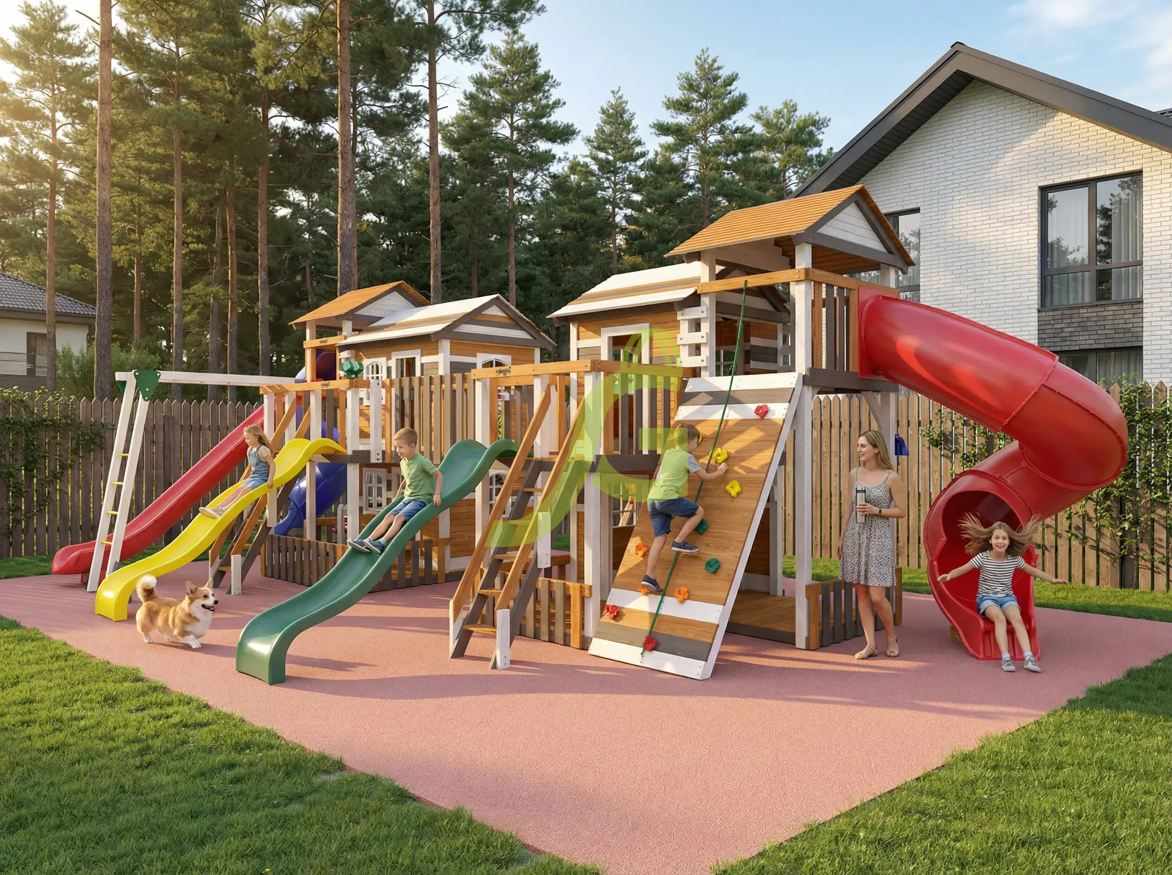 Спортивно игровой комплекс с обилием игровых зон и выбором активностей послужит украшением для вашего загородного участка.