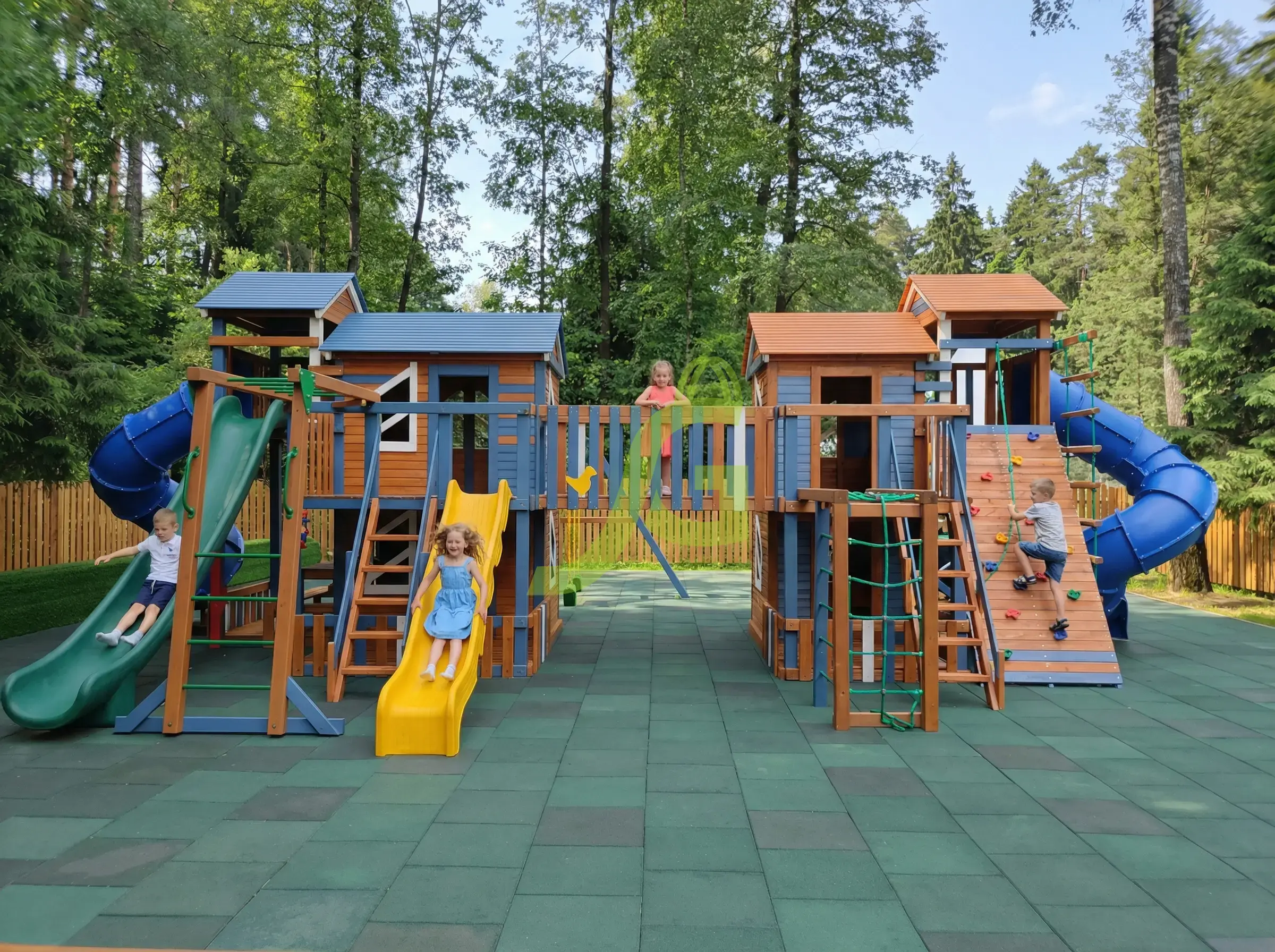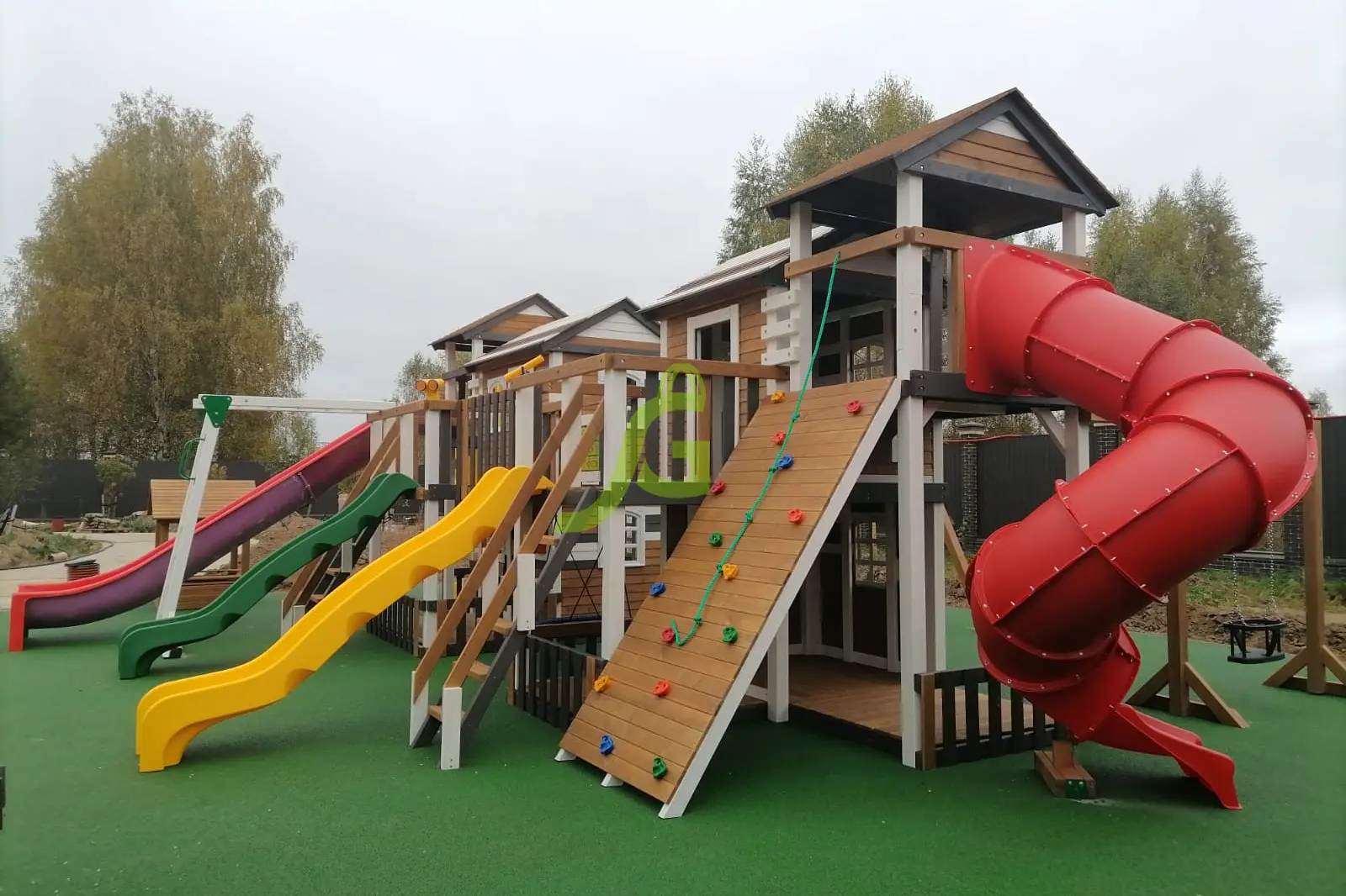 Скалолазная стена, комбинированная лестница, верёвочная лестница, скалодром, рукоход, горка-труба, дополнительный высокий двухуровневый дом