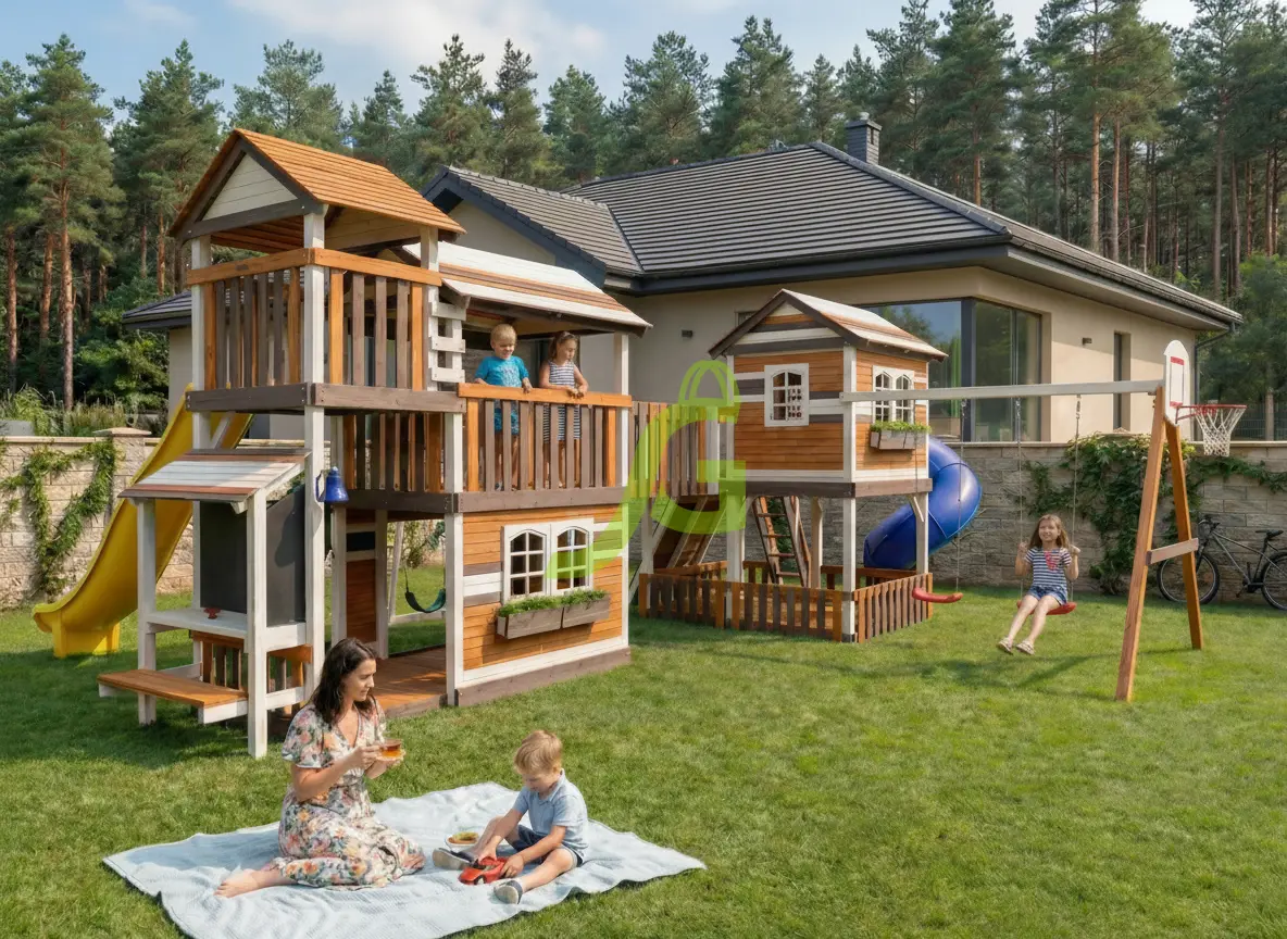 Домик с крышей на втором уровне, продуманные спортивные элементы и наборы