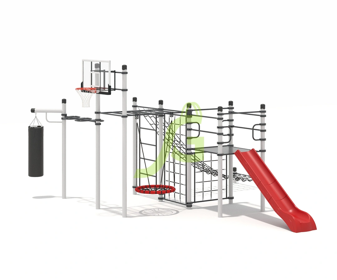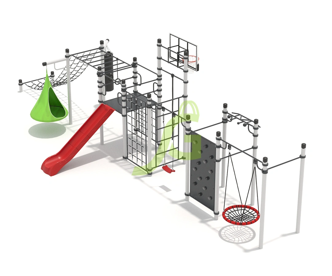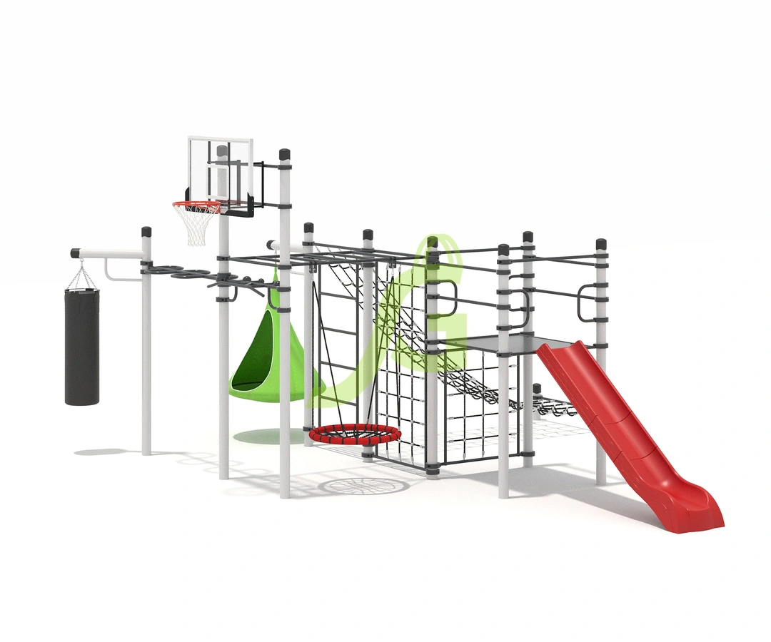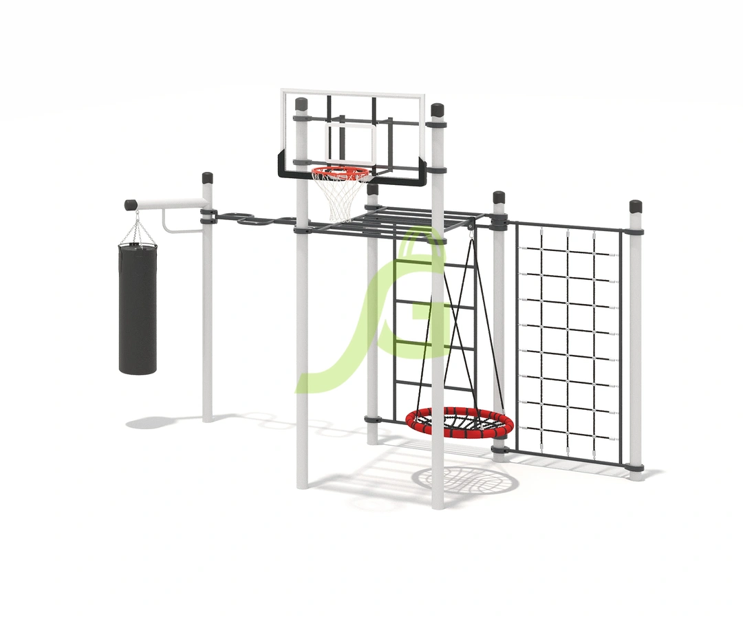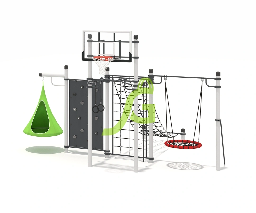 Рукоход-змейка, рукоход-прямой, шведская стенка, брусья, турник под прямой хват, баскетбольное кольцо, скалодром, боксерский мешок.