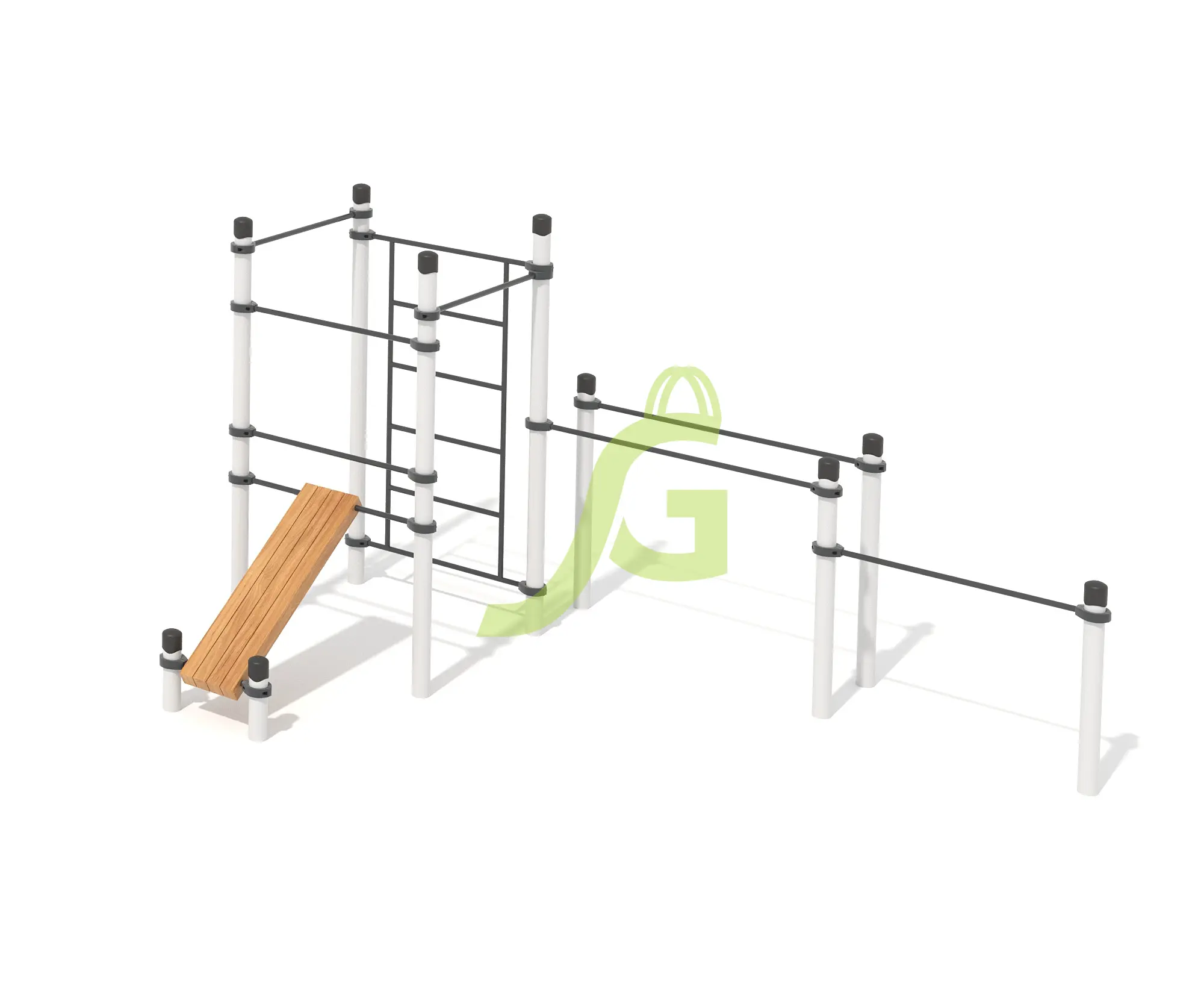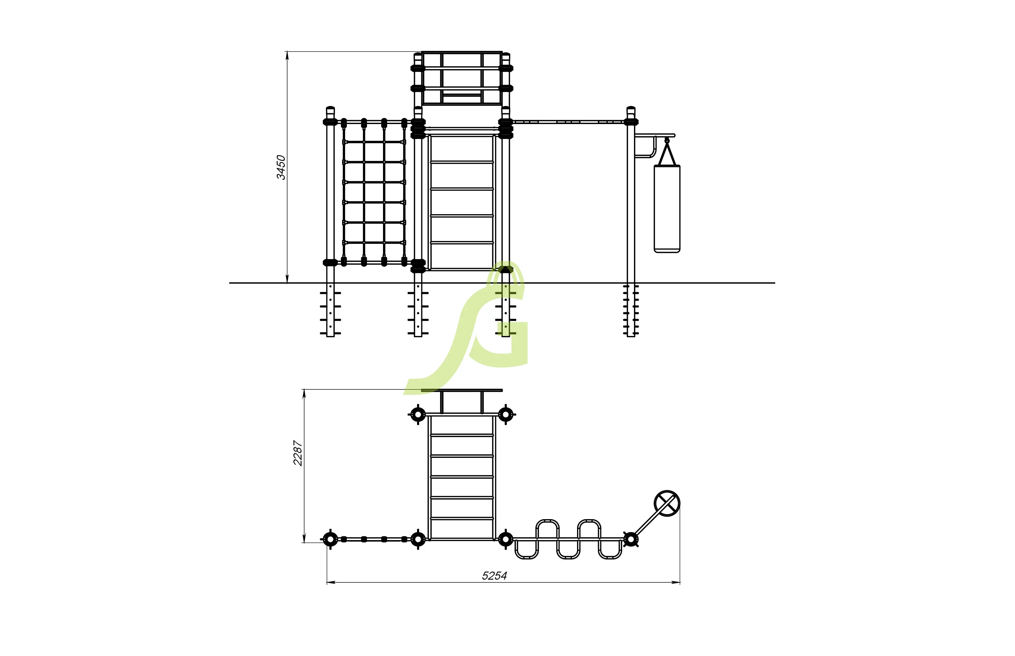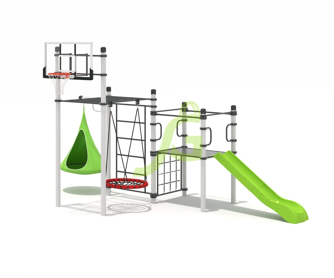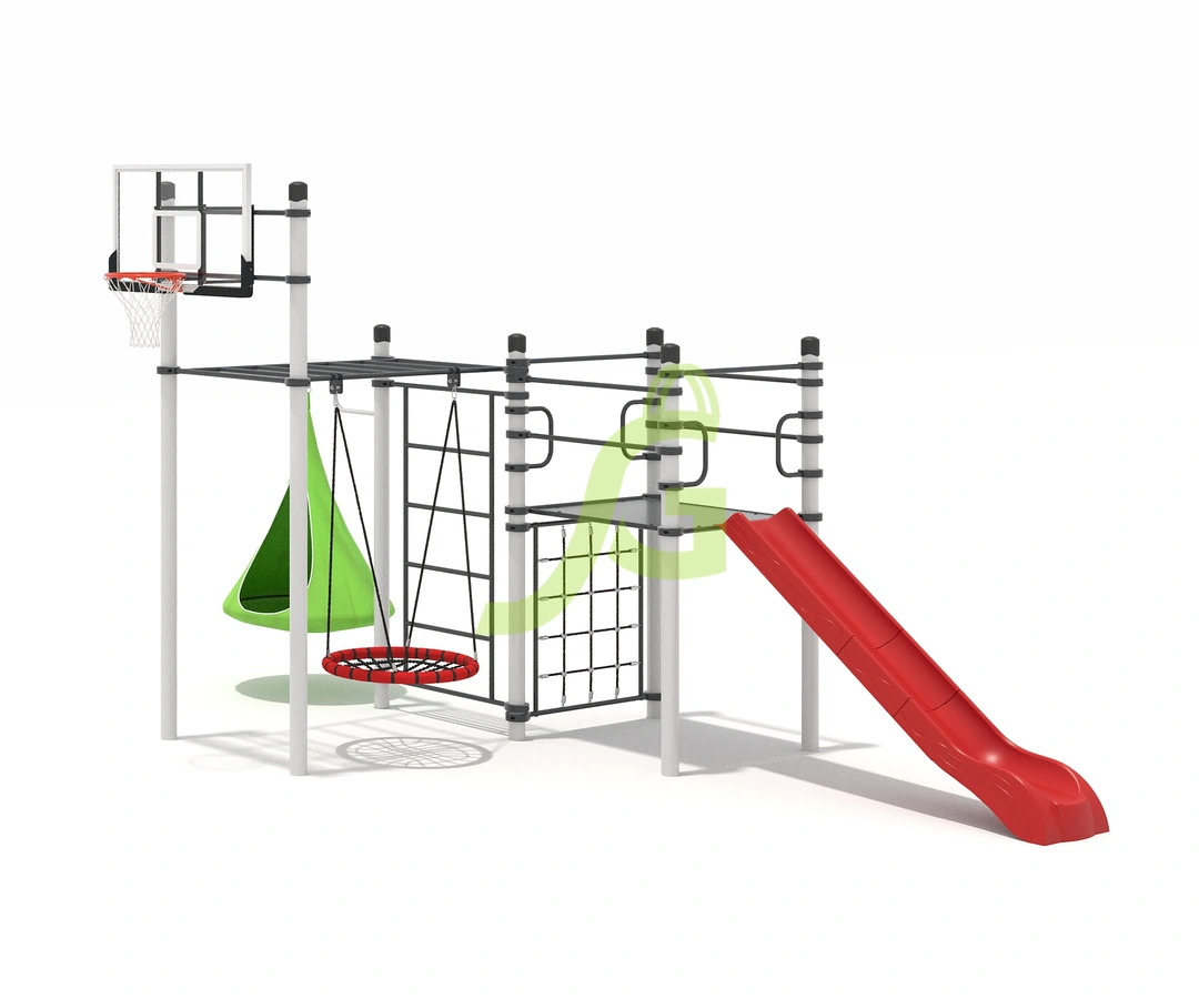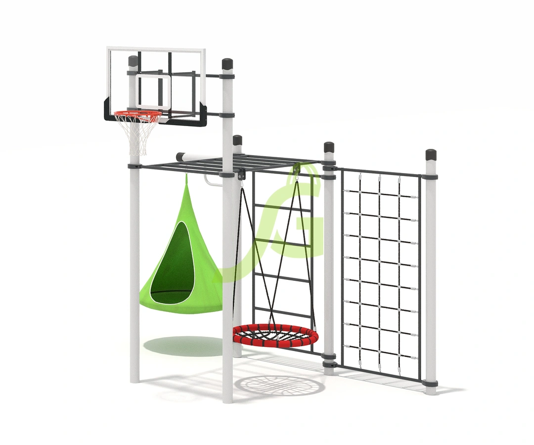 Рукоход-змейка, рукоход-прямой, шведская стенка, брусья, турник под прямой хват, баскетбольное кольцо, скалодром, боксерский мешок.