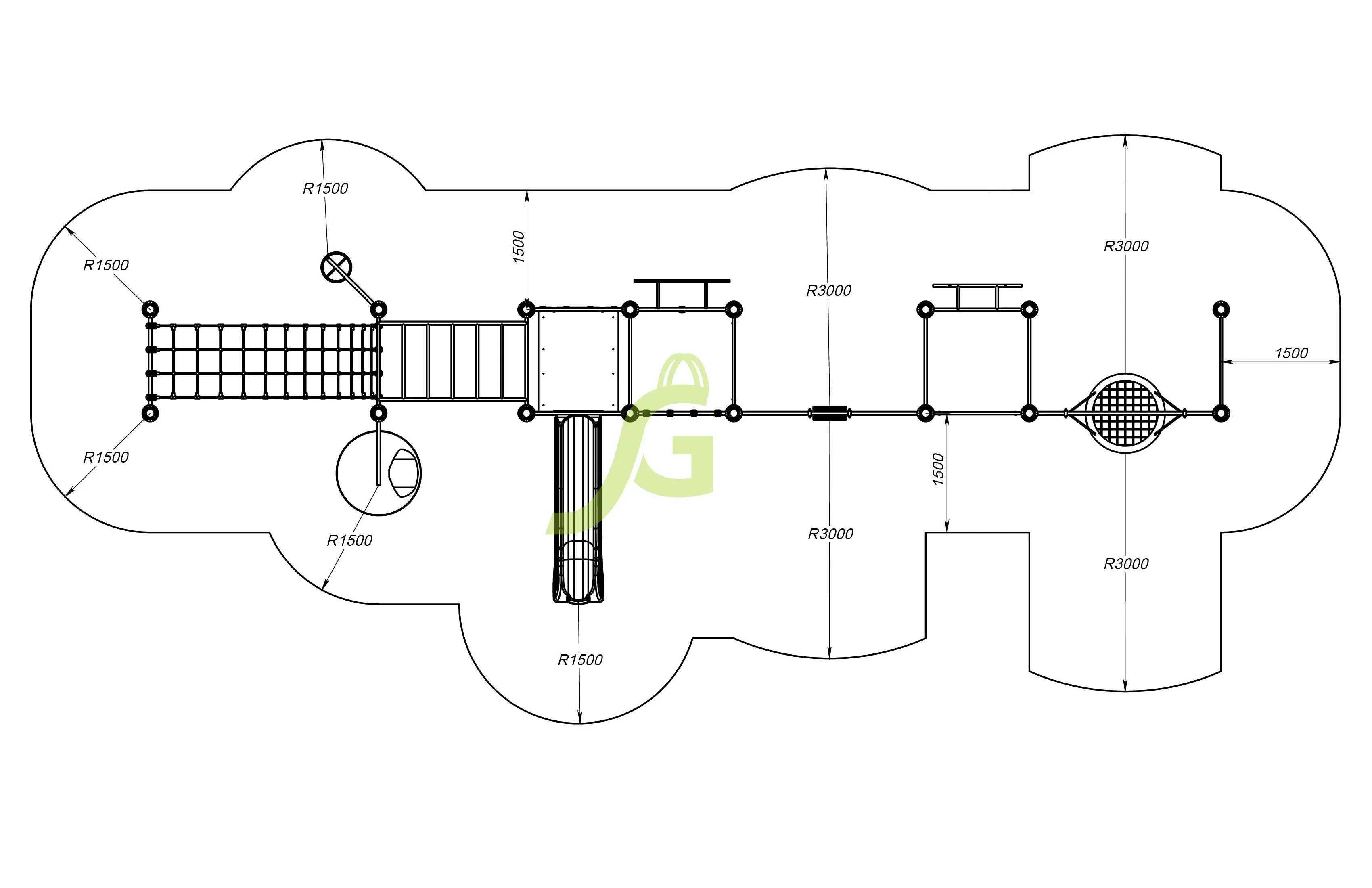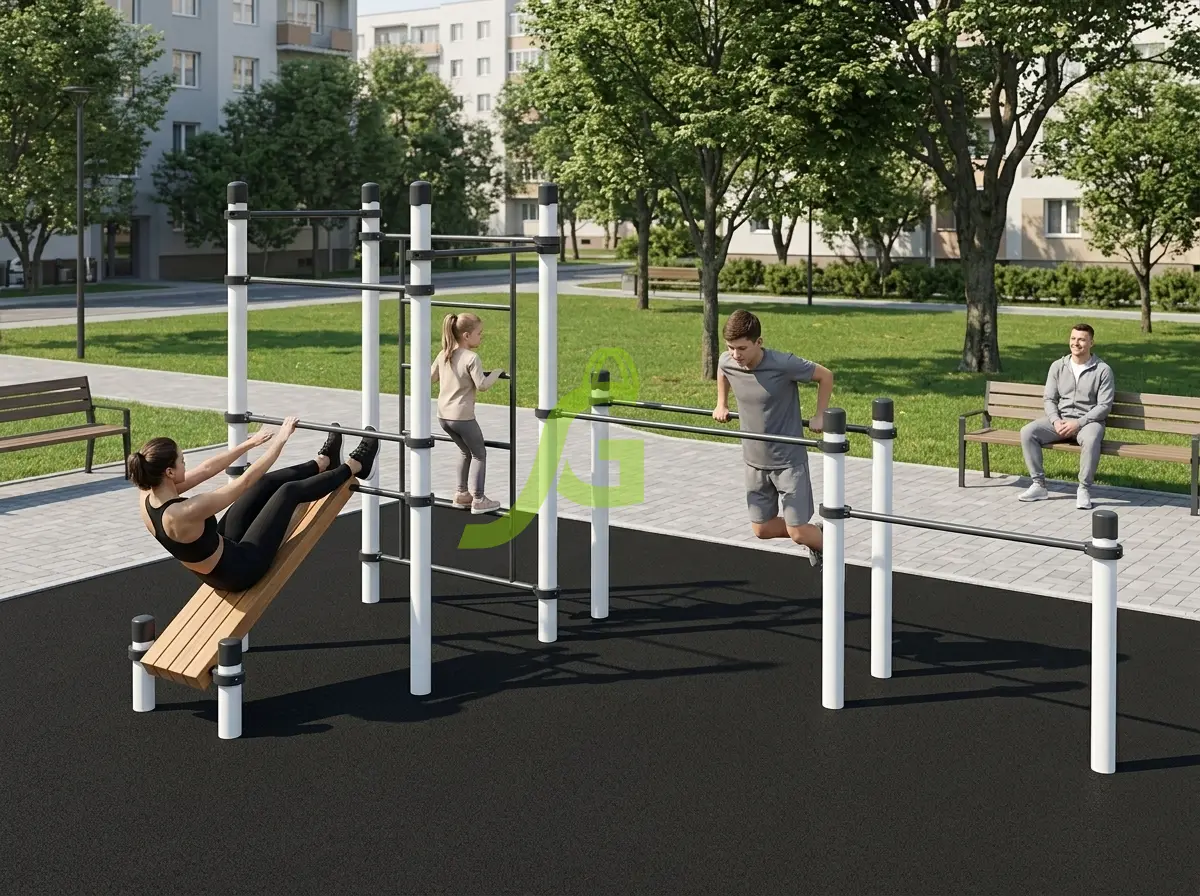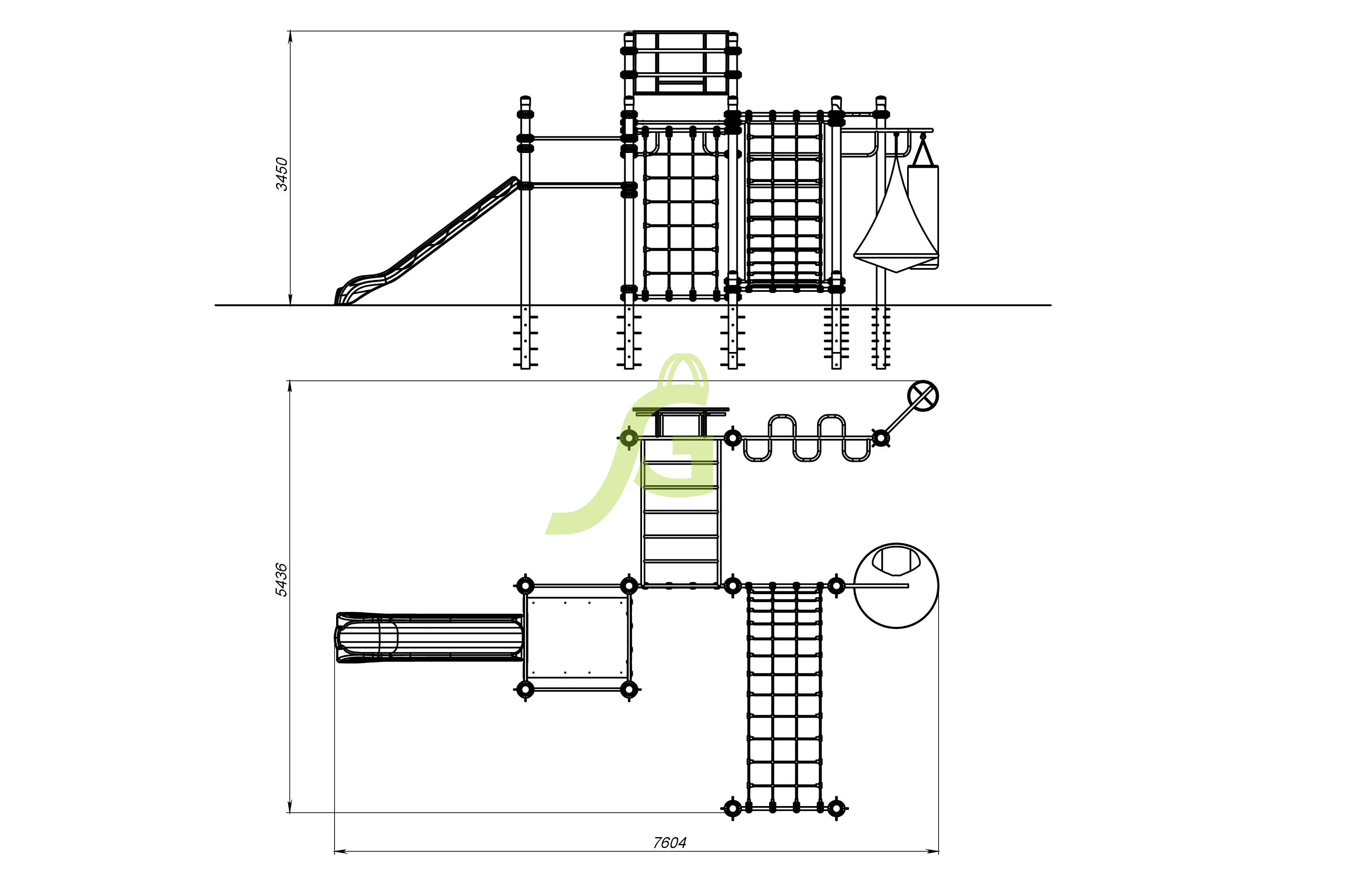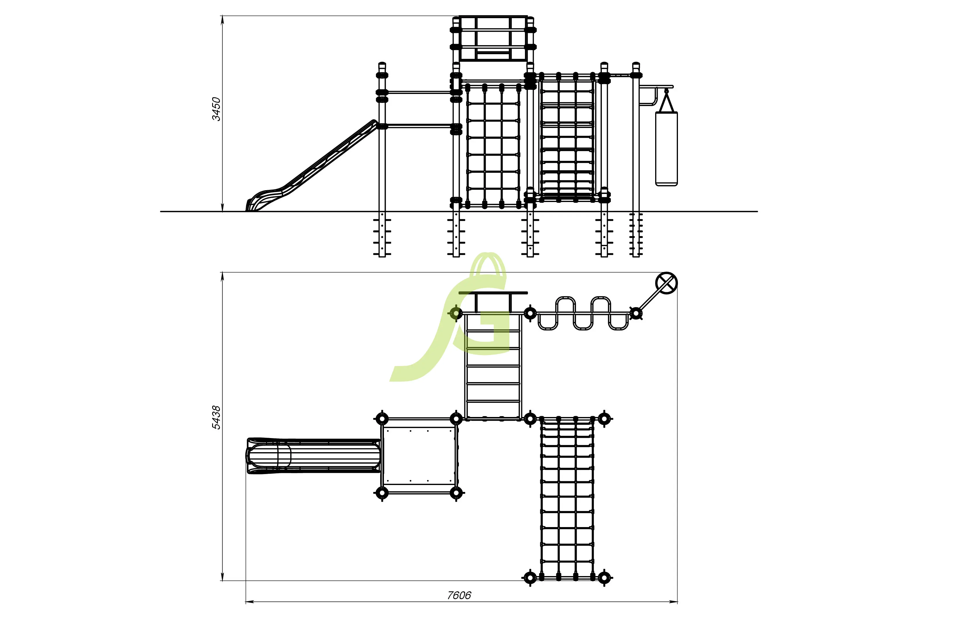 Рукоход-змейка, рукоход-прямой, шведская стенка, брусья, турник под прямой хват, баскетбольное кольцо, скалодром, боксерский мешок.