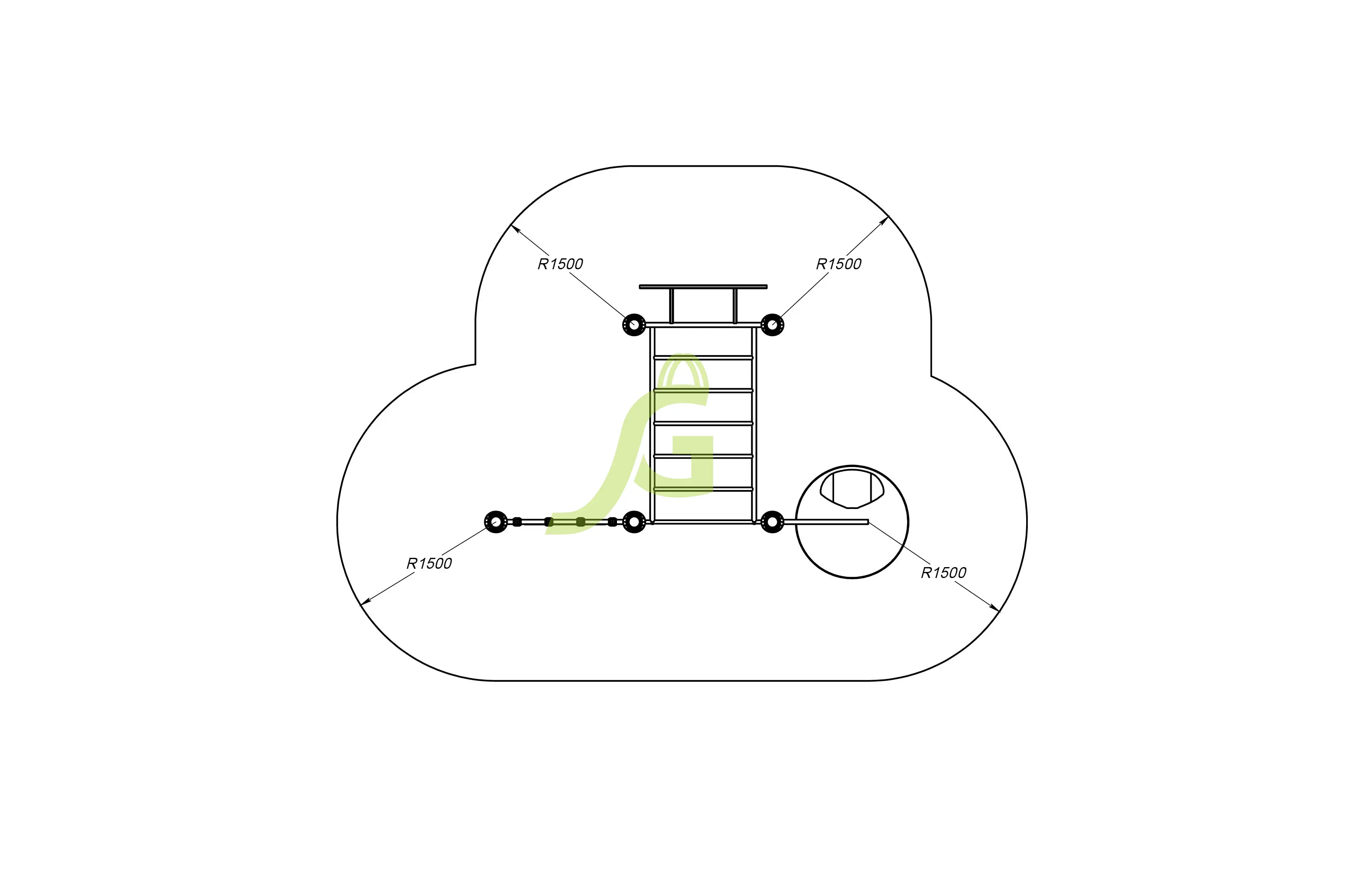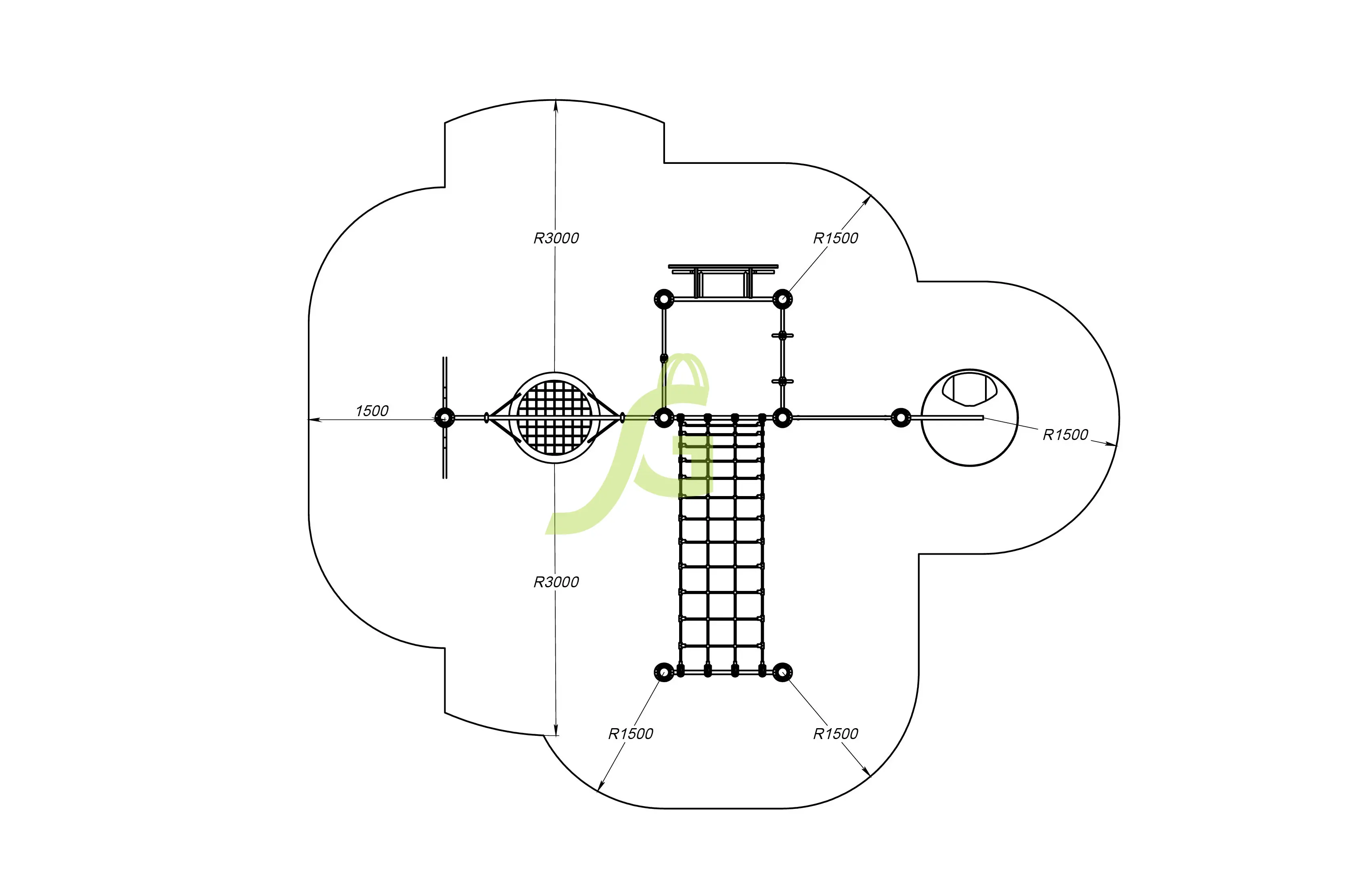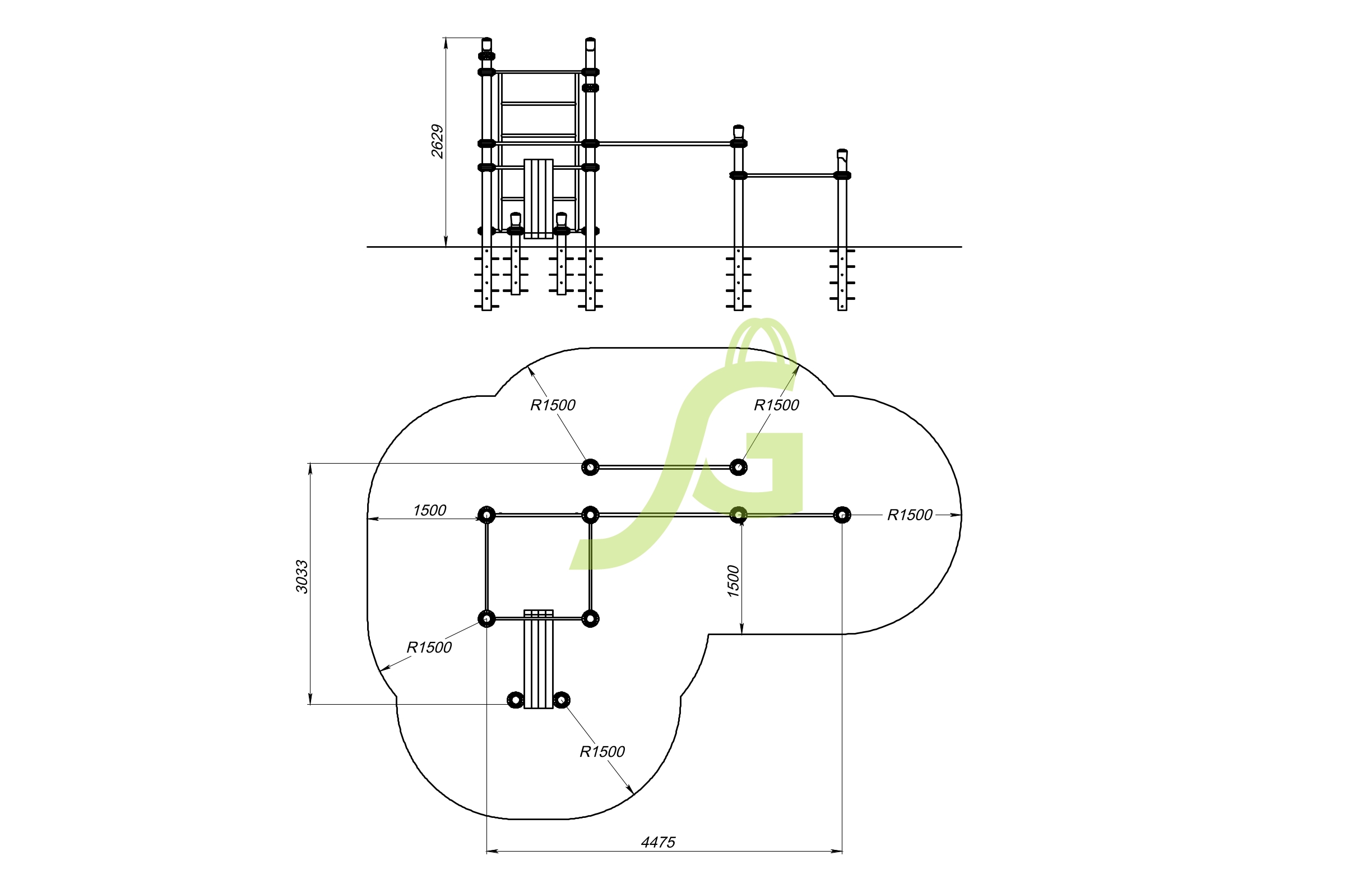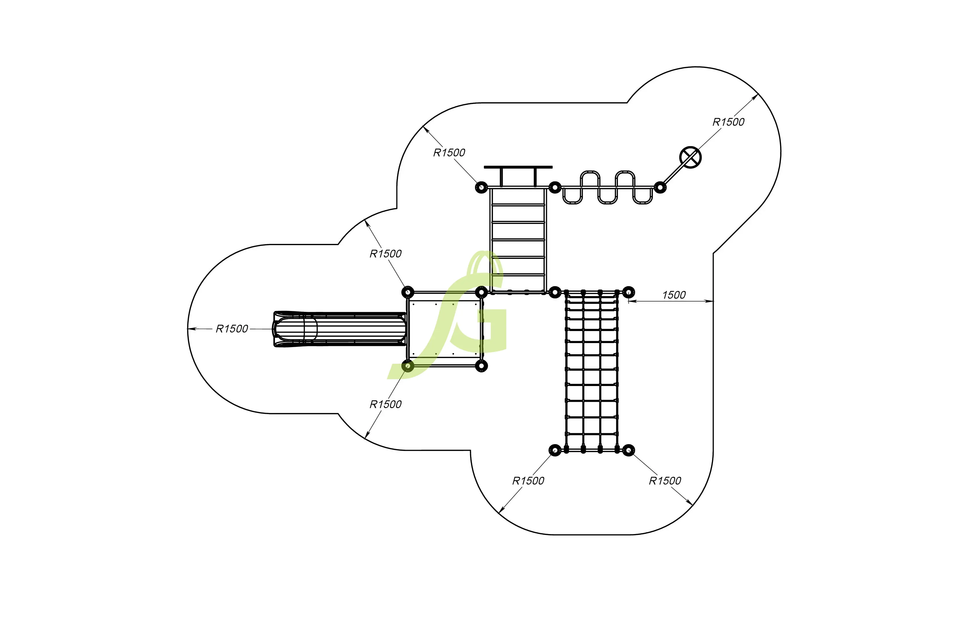 Рукоход-змейка, рукоход-прямой, шведская стенка, брусья, турник под прямой хват, баскетбольное кольцо, скалодром, боксерский мешок.