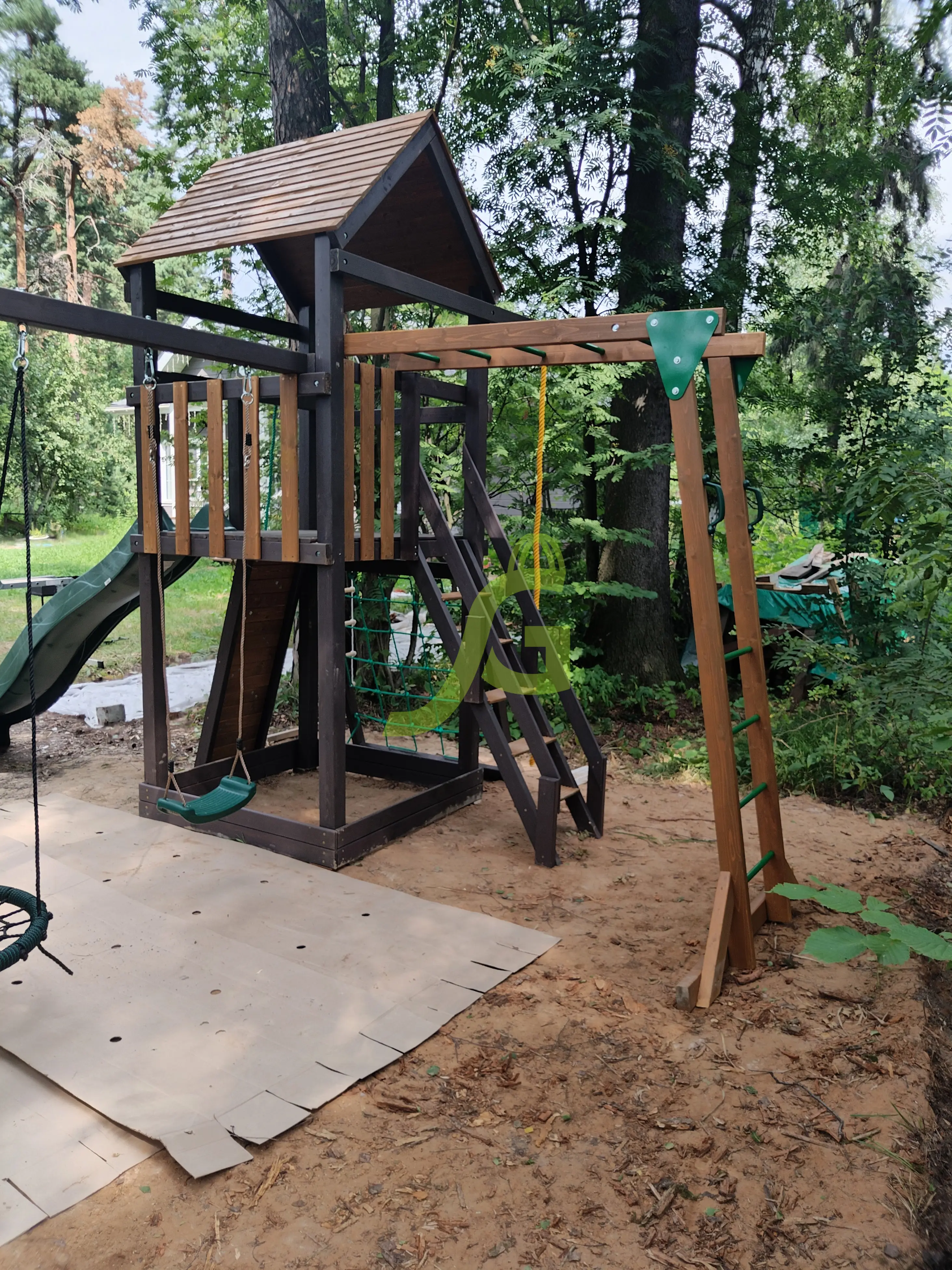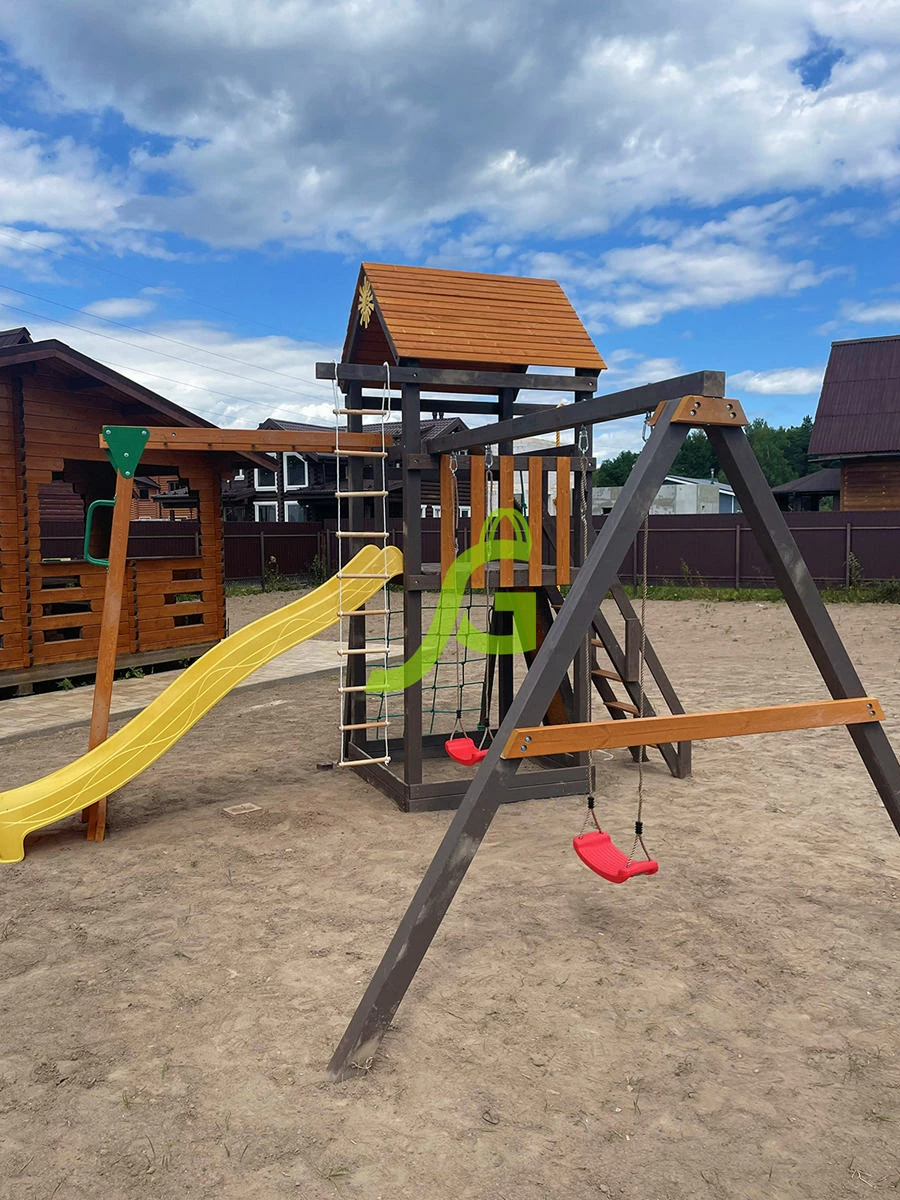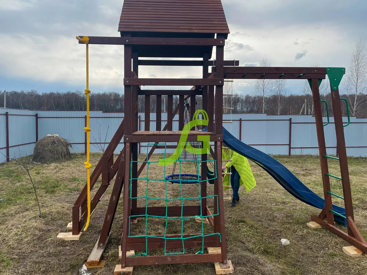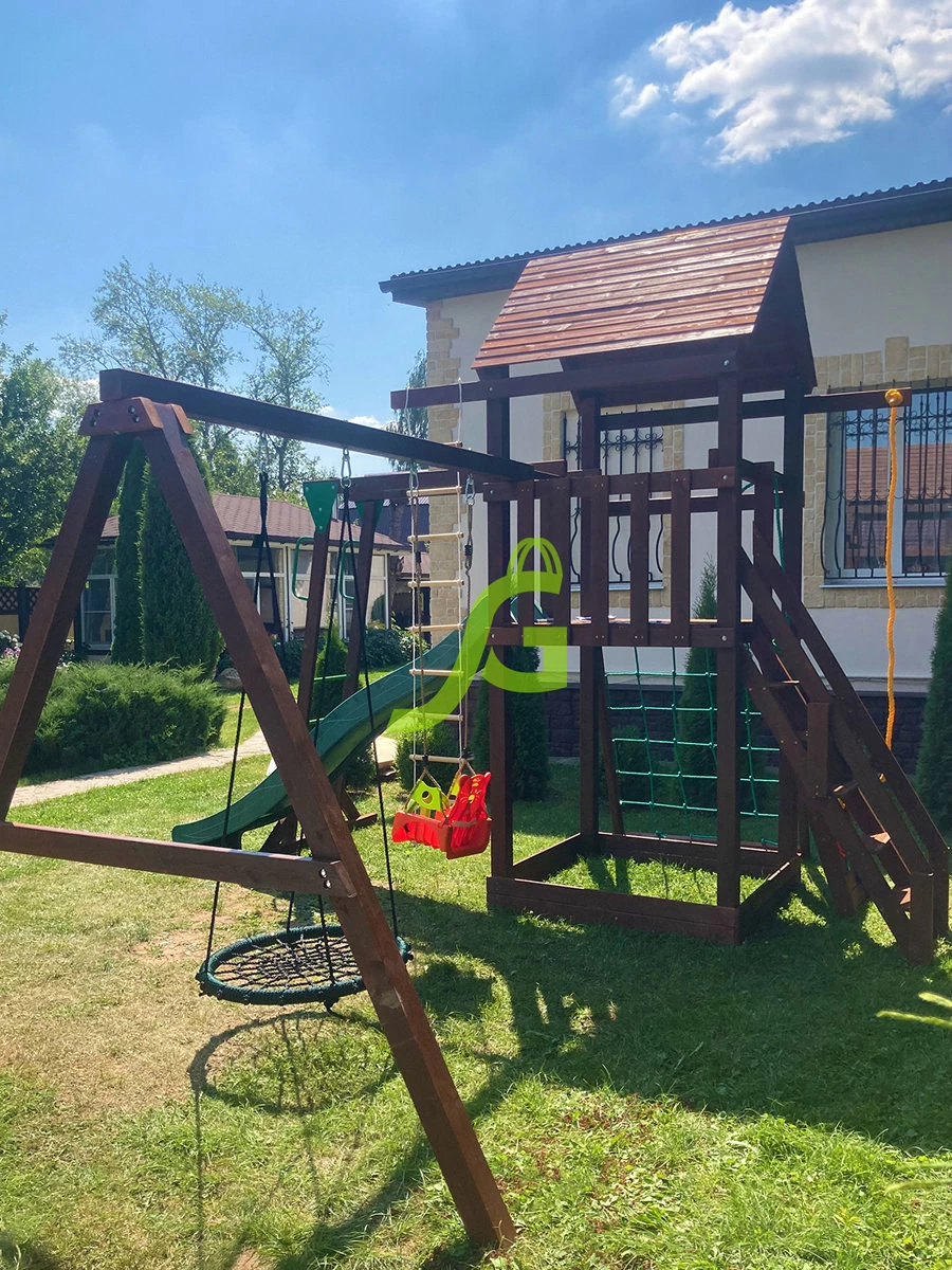 Игровой комплекс изготовлен из дерева и отвечает всем стандартам качества. Вы можете разместить площадку на своём приусадебном участке или даче. Конструкция не займёт много места и гармонично впишется в ландшафт сада.