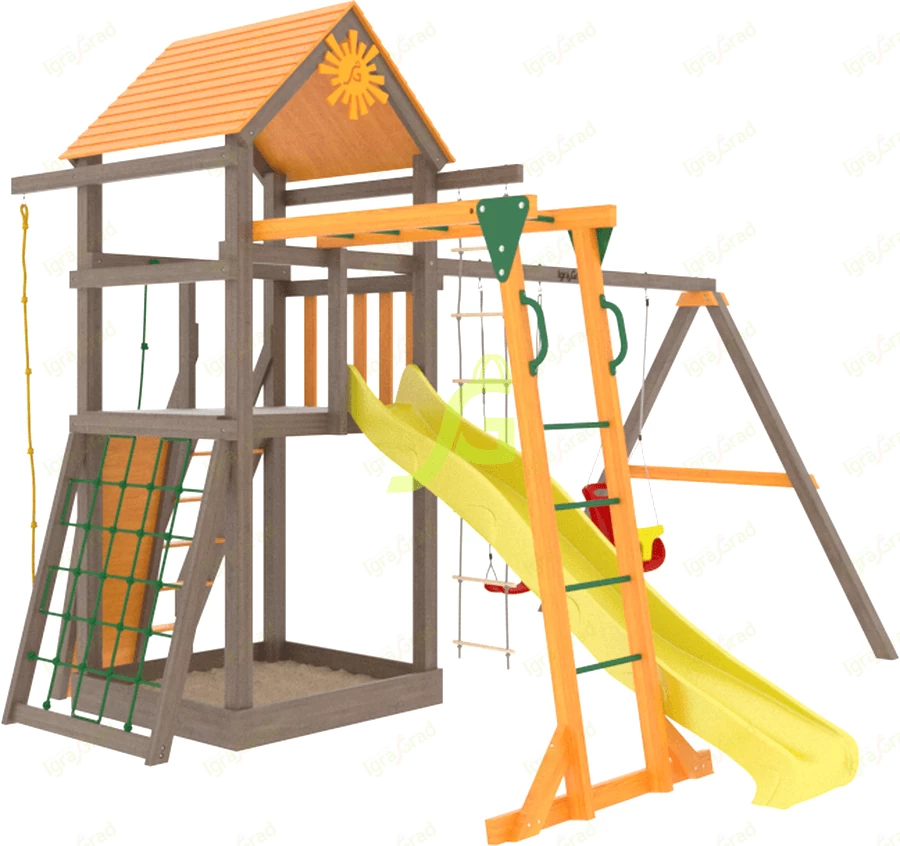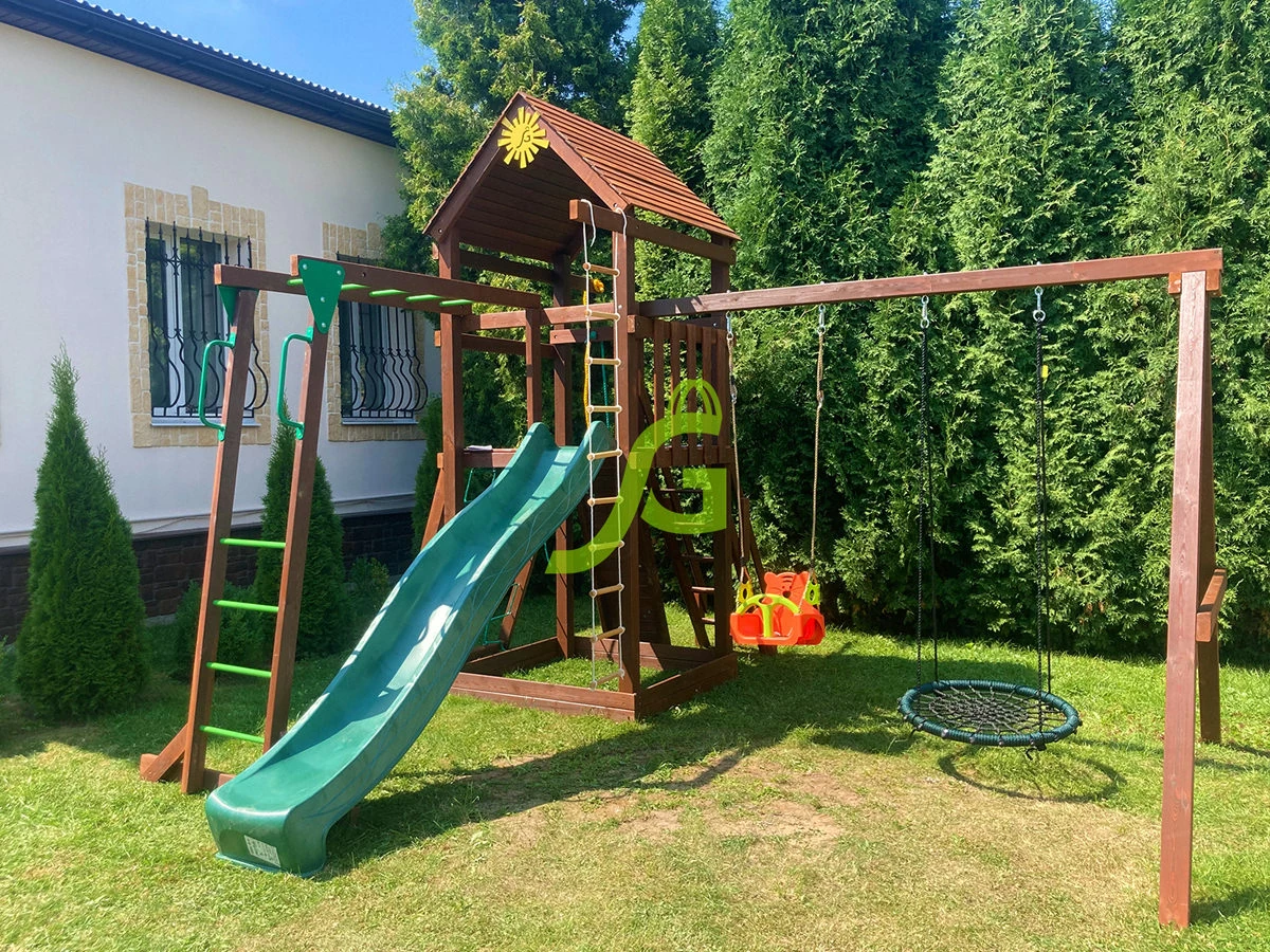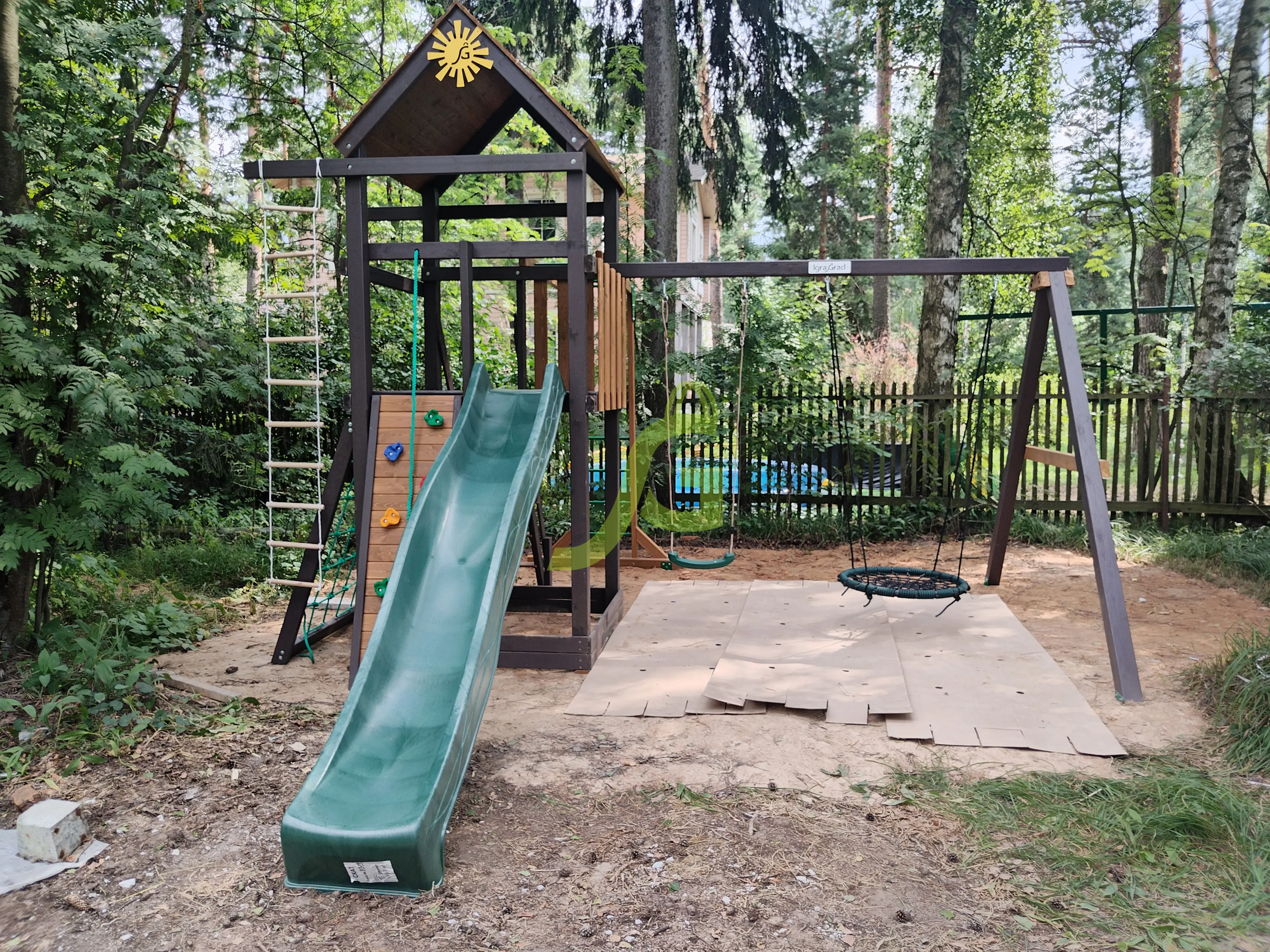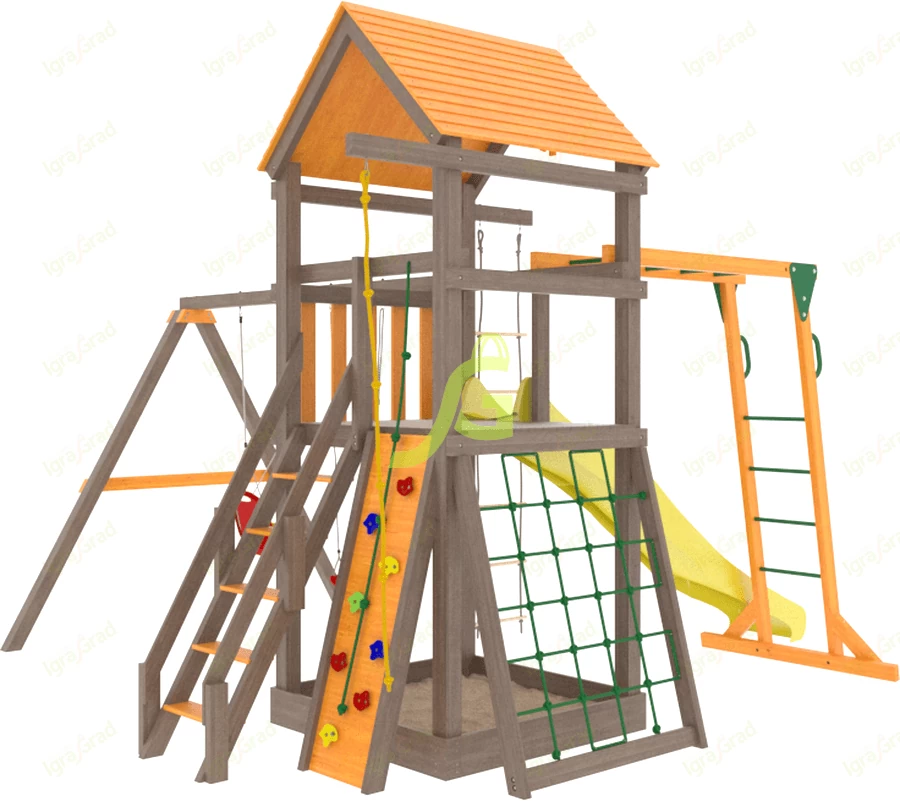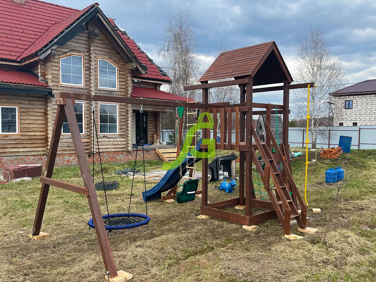 Игровой комплекс изготовлен из дерева и отвечает всем стандартам качества. Вы можете разместить площадку на своём приусадебном участке или даче. Конструкция не займёт много места и гармонично впишется в ландшафт сада.