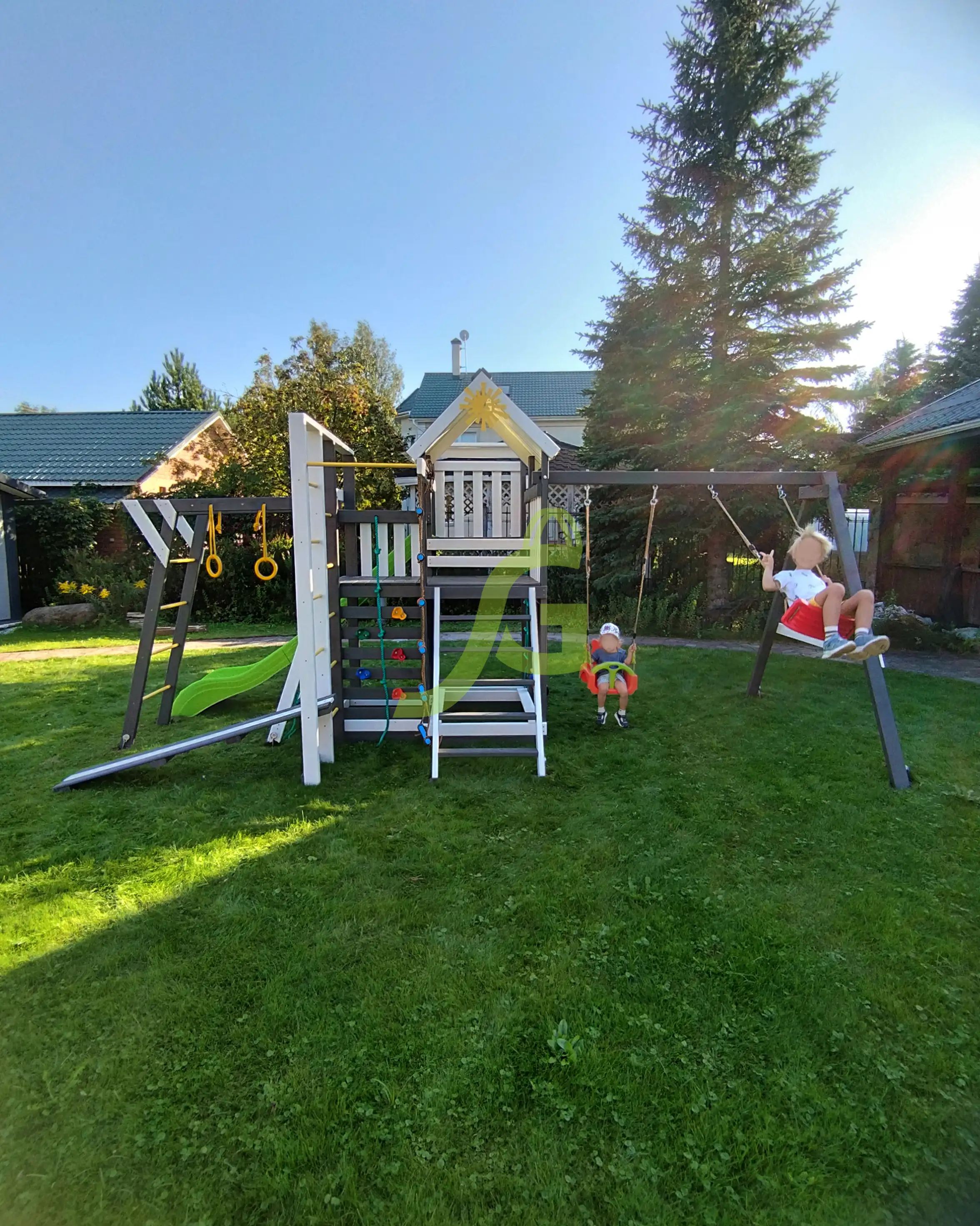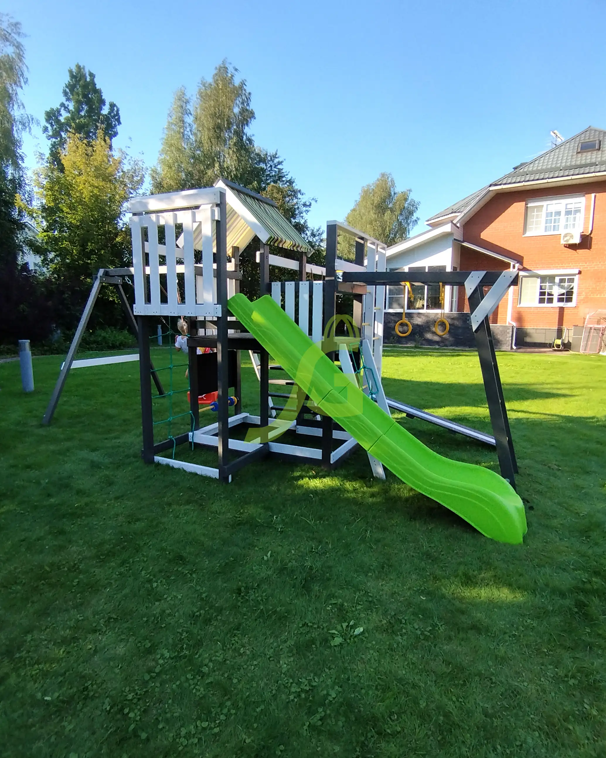 Полный Контроль и Безопасность :- - Просторная башня с тентованной крышей: Дети защищены от солнца, а родители могут всегда увидеть, где они (никаких "глухих" уголков!).