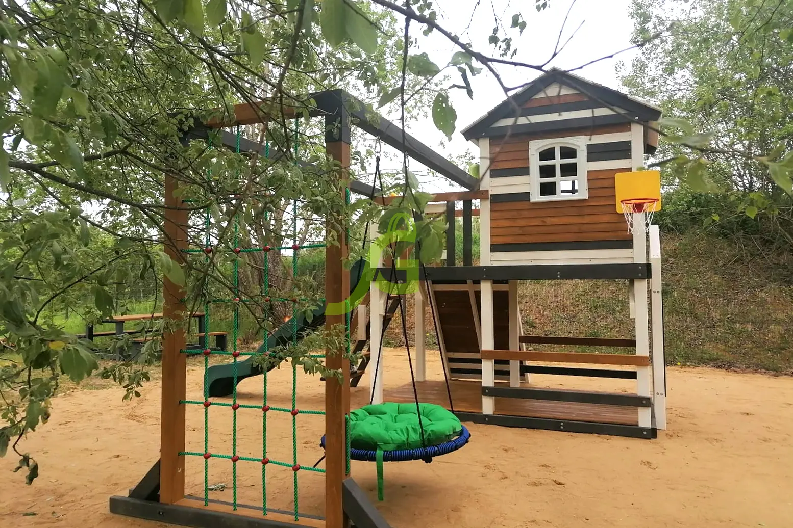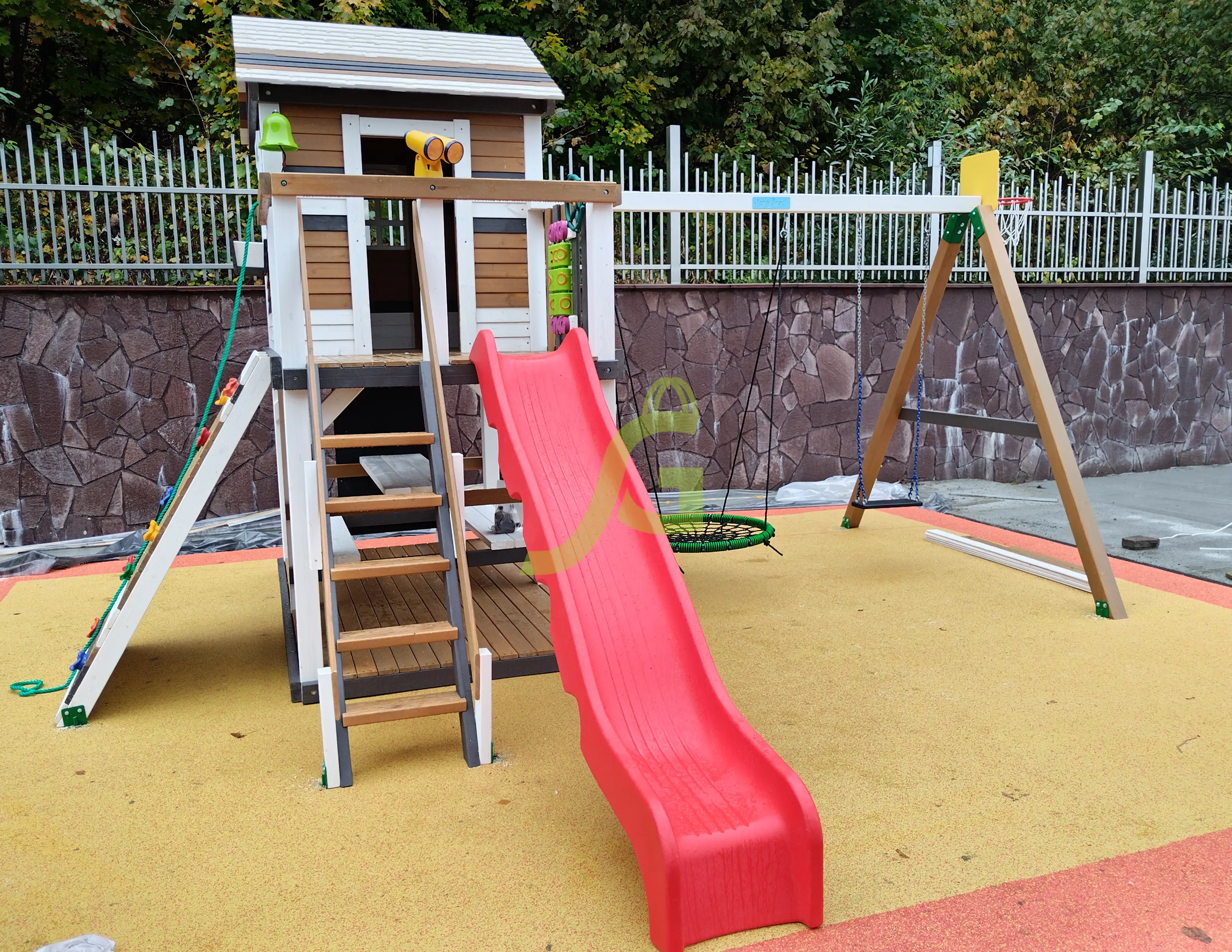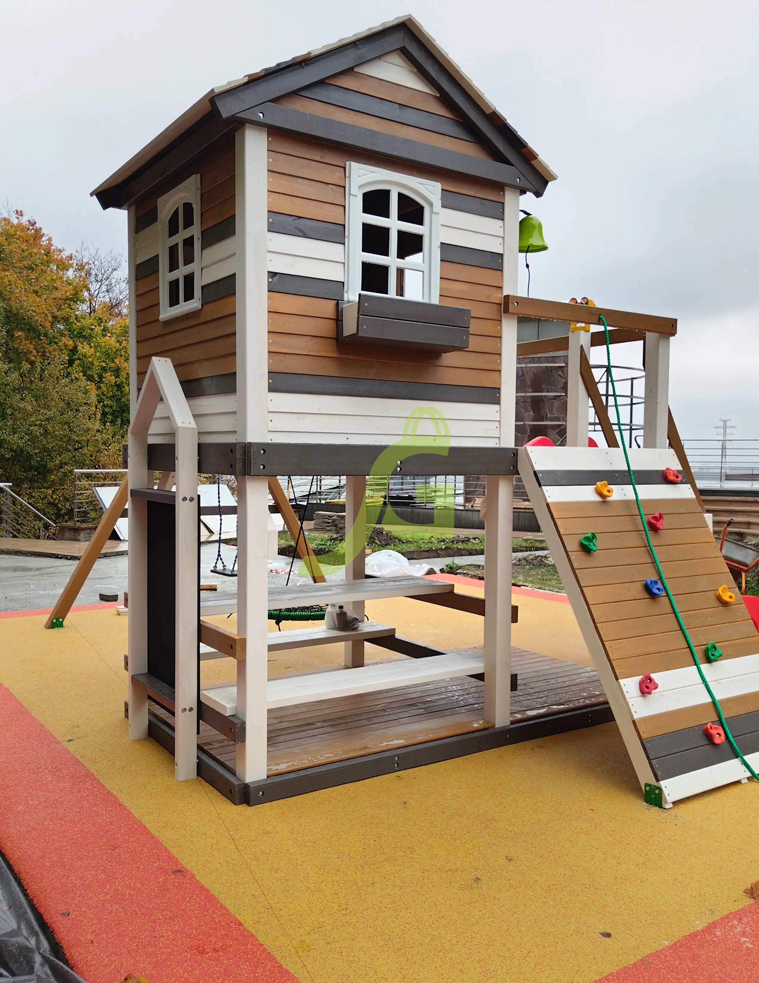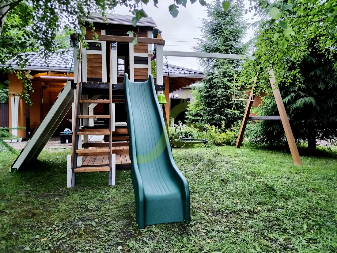 Обращаем Ваше внимание, что цвет установленной детской площадки может отличаться от представленных изображений на сайте. Специфика окраски нетоксичными пропитками допускает отклонения в цветовой гамме отгружаемых изделий вследствие различного цвета натурального природного сырья и естественных компонентов, используемых для производства площадок.