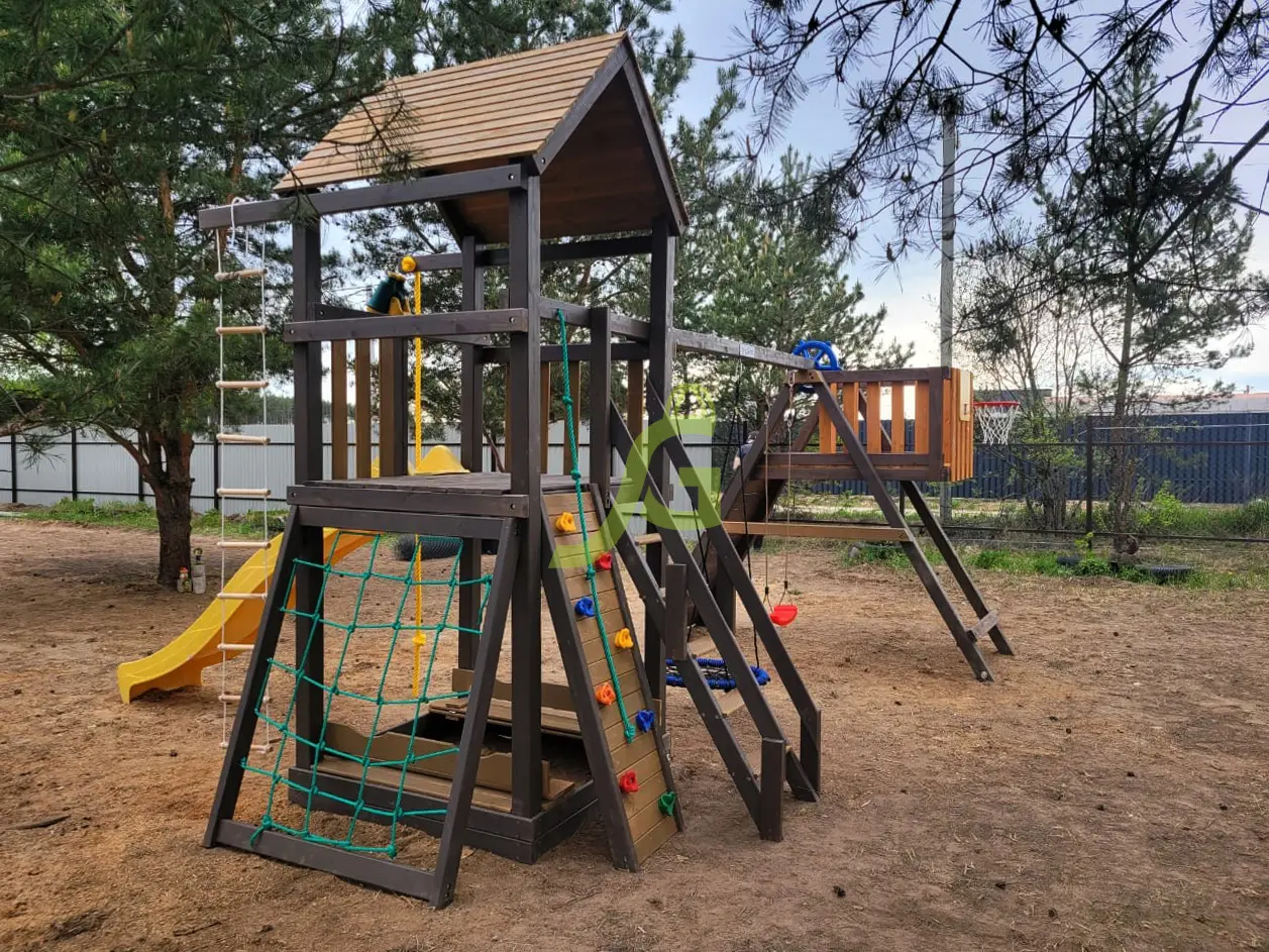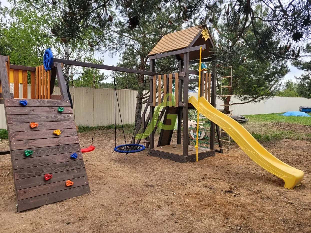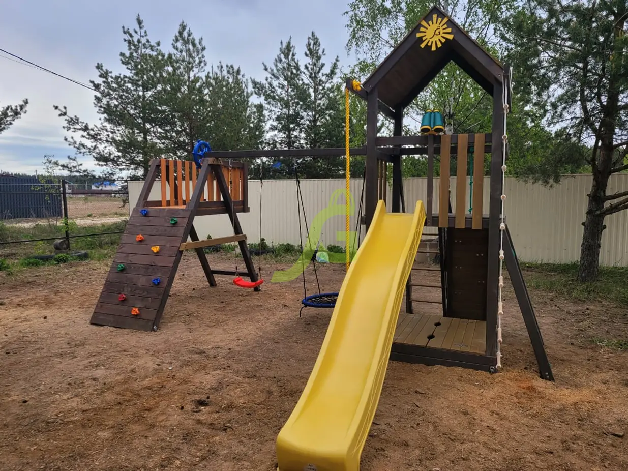 Обращаем Ваше внимание, что цвет установленной детской площадки может отличаться от представленных изображений на сайте. Специфика окраски нетоксичными пропитками допускает отклонения в цветовой гамме отгружаемых изделий вследствие различного цвета натурального природного сырья и естественных компонентов, используемых для производства площадок.