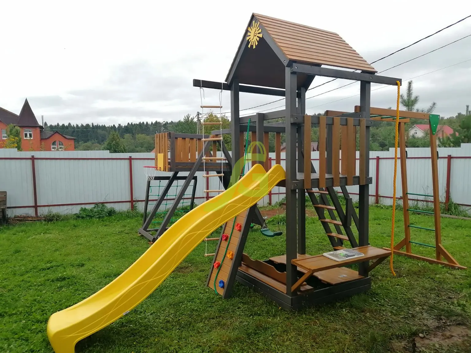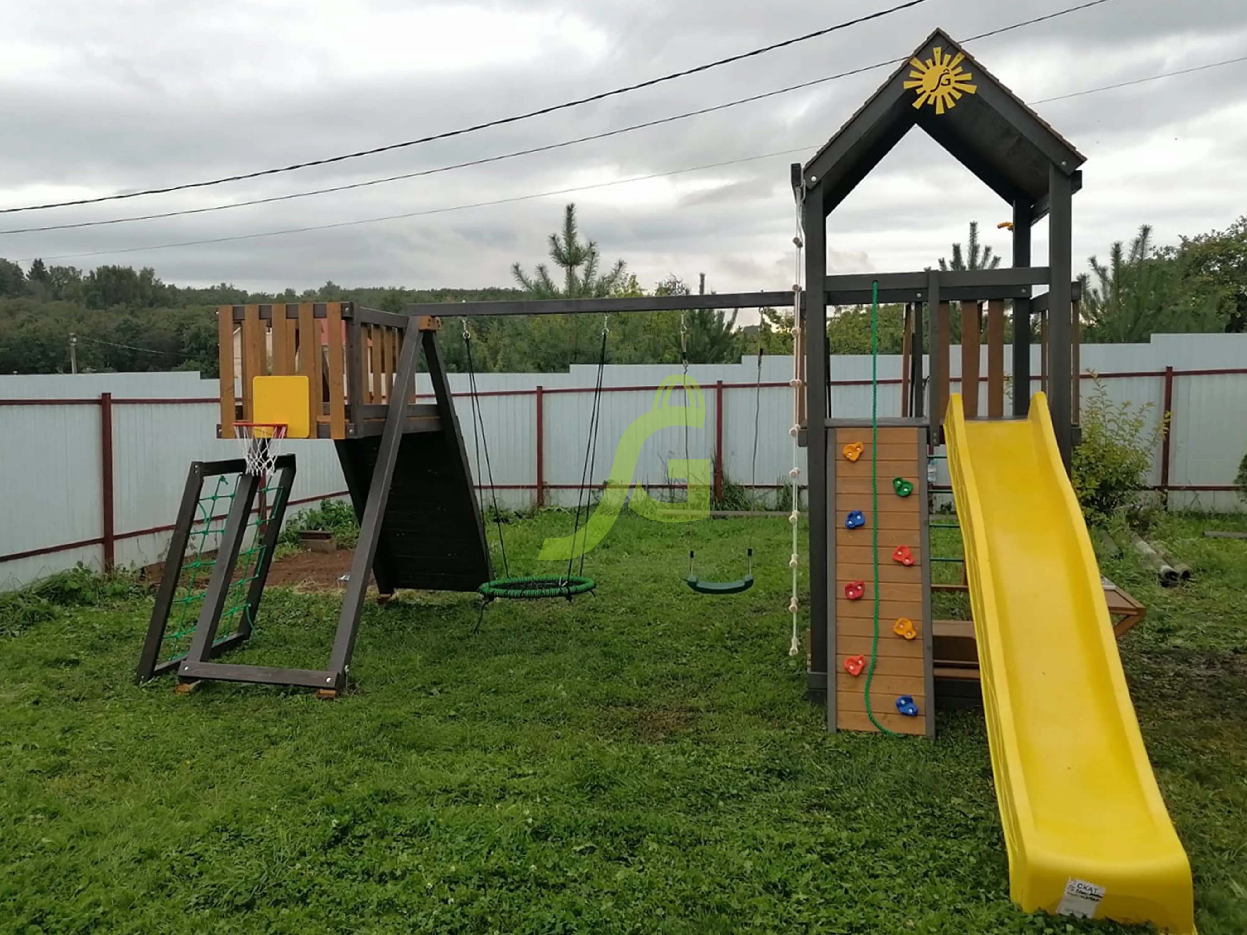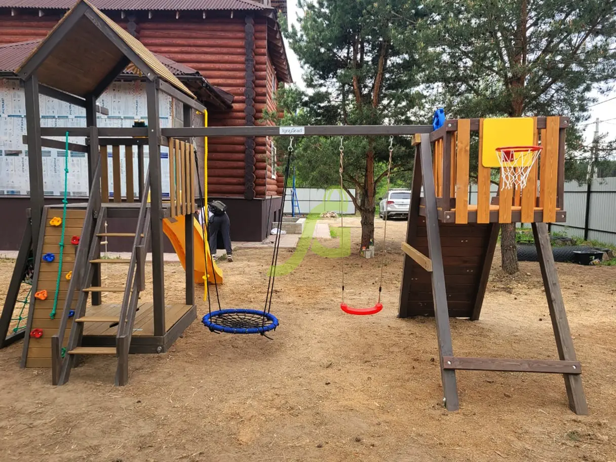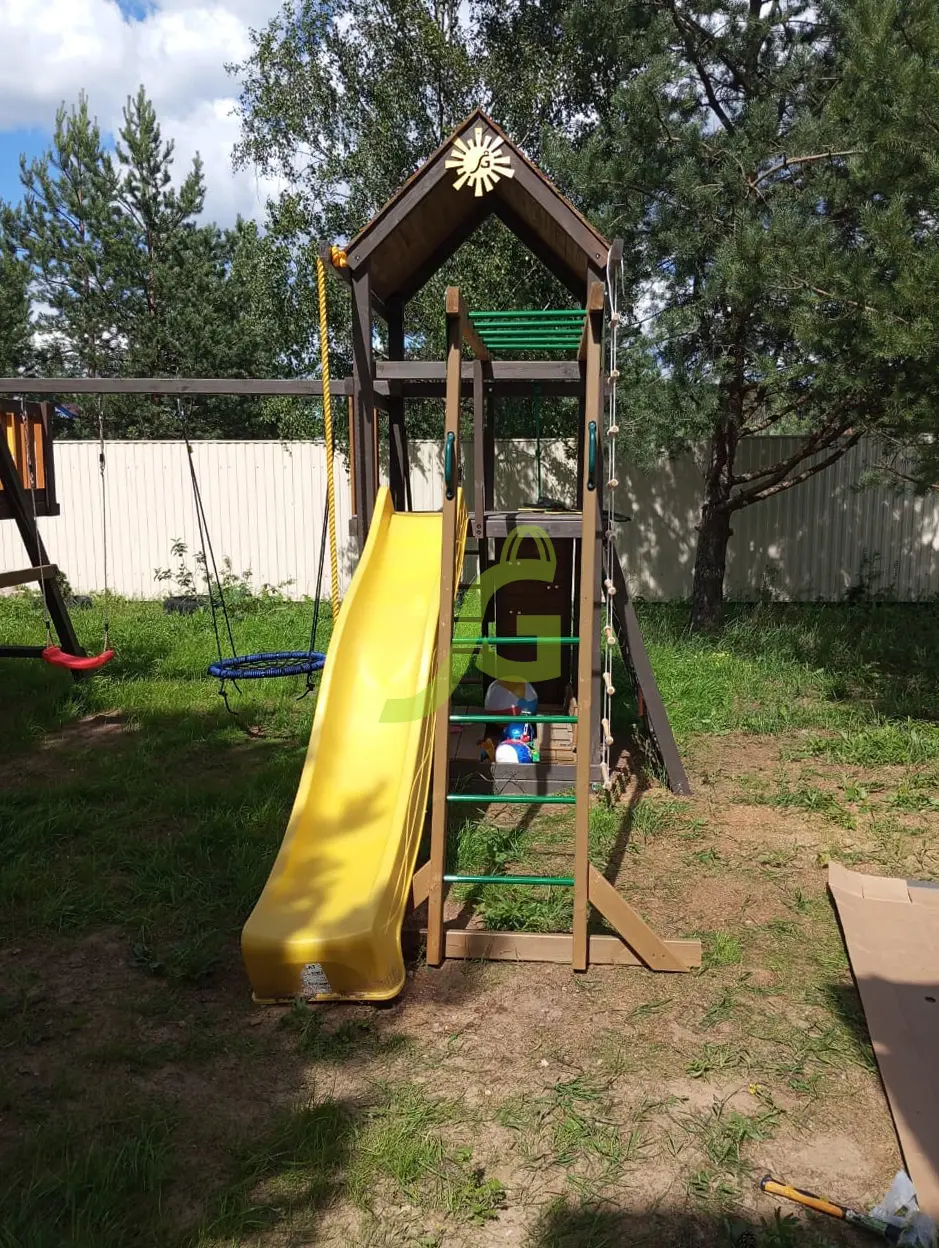 Обращаем Ваше внимание, что цвет установленной детской площадки может отличаться от представленных изображений на сайте. Специфика окраски нетоксичными пропитками допускает отклонения в цветовой гамме отгружаемых изделий вследствие различного цвета натурального природного сырья и естественных компонентов, используемых для производства площадок.