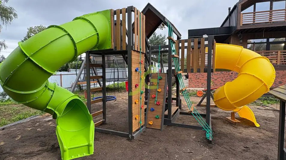 И, горки, конечно же горки, здесь их три. Волнообразный спуск и две горки-трубы на 1,5 и 2,1 метра.
