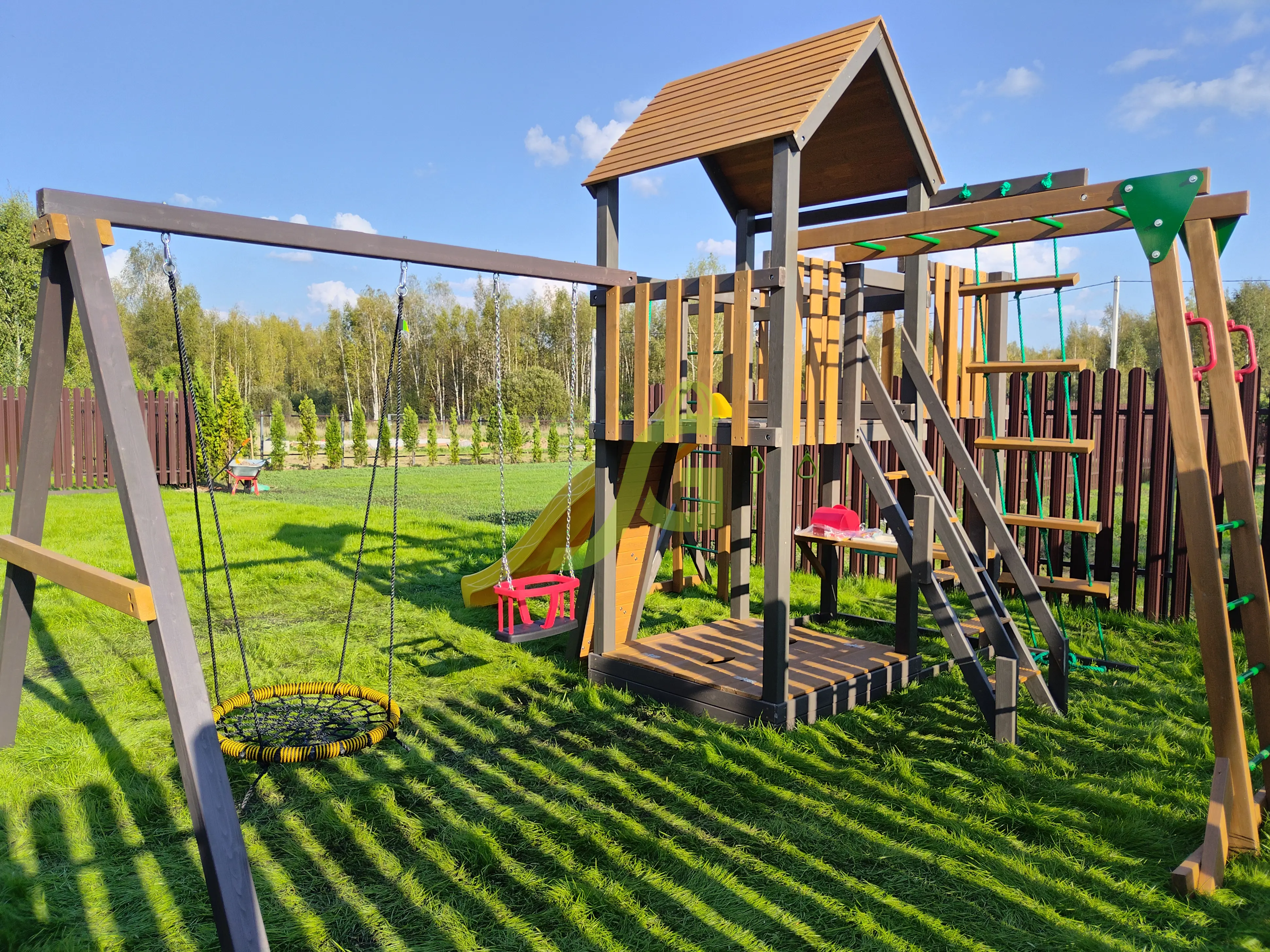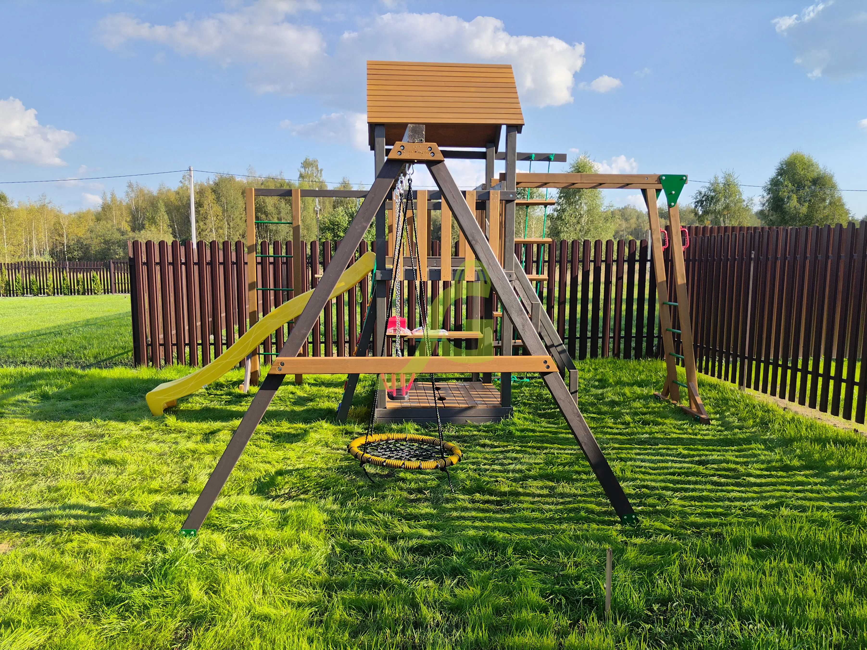 Обращаем Ваше внимание, что цвет установленной детской площадки может отличаться от представленных изображений на сайте. Специфика окраски нетоксичными пропитками допускает отклонения в цветовой гамме отгружаемых изделий вследствие различного цвета натурального природного сырья и естественных компонентов, используемых для производства площадок.