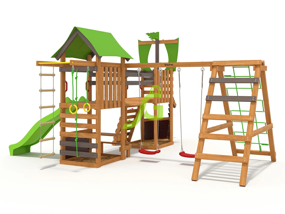 Детская игровая площадка IgraGrad W21s — это настоящая вселенная приключений для вашего ребенка, выполненная в виде корабля викингов! На первом уровне двух башен расположена песочница, причем сразу две, прилавок для быстрой продажи песочных куличиков, скамеечка и столик для рисования. Открытая для всех ветров двухэтажная башня-рубка, на нее можно взобраться по скалодрому. Подвесной мостик позволяет быстро переместиться во вторую башню с деревянной крышей, откуда так весело спускаться вниз по горке-волне.