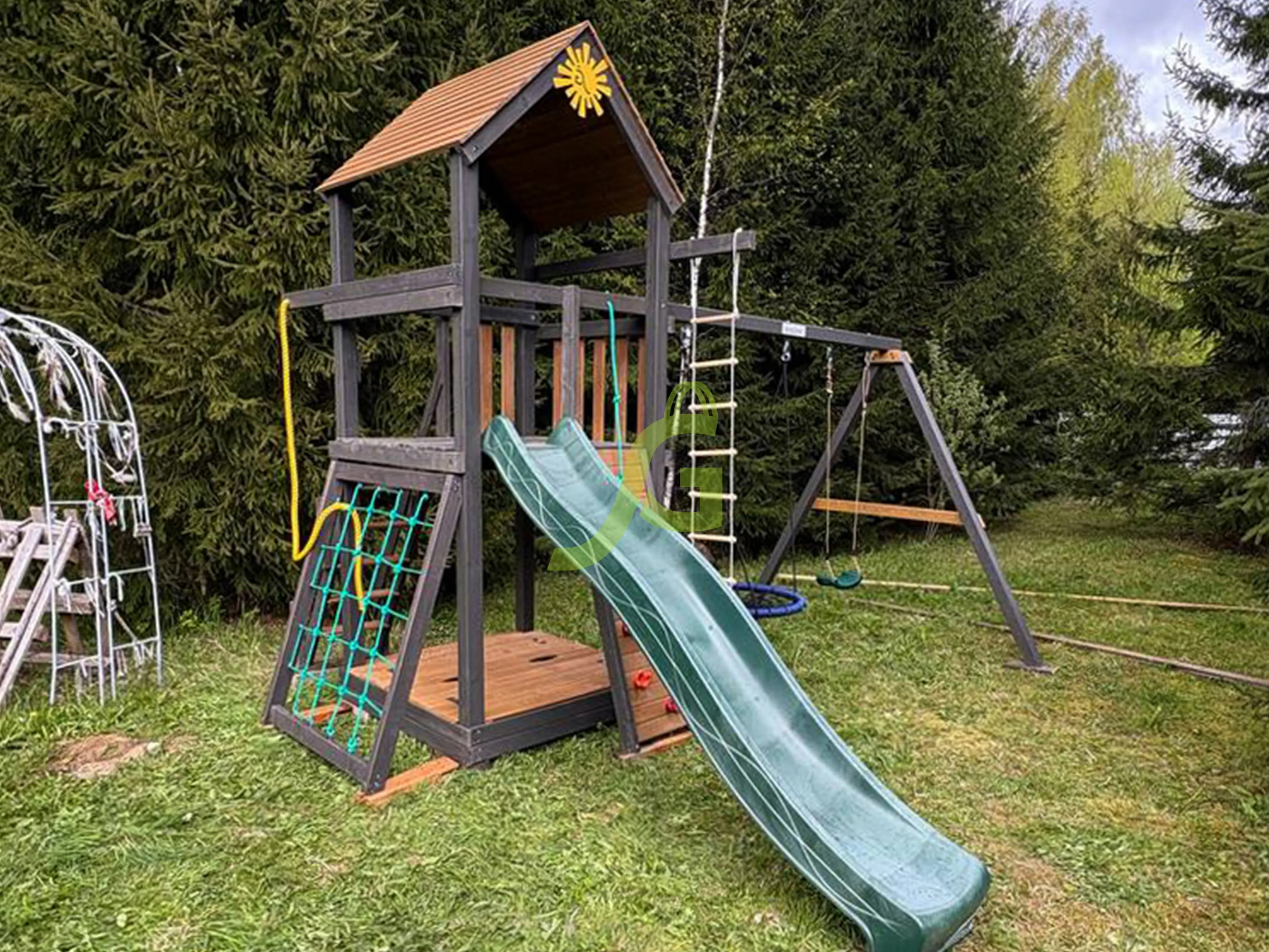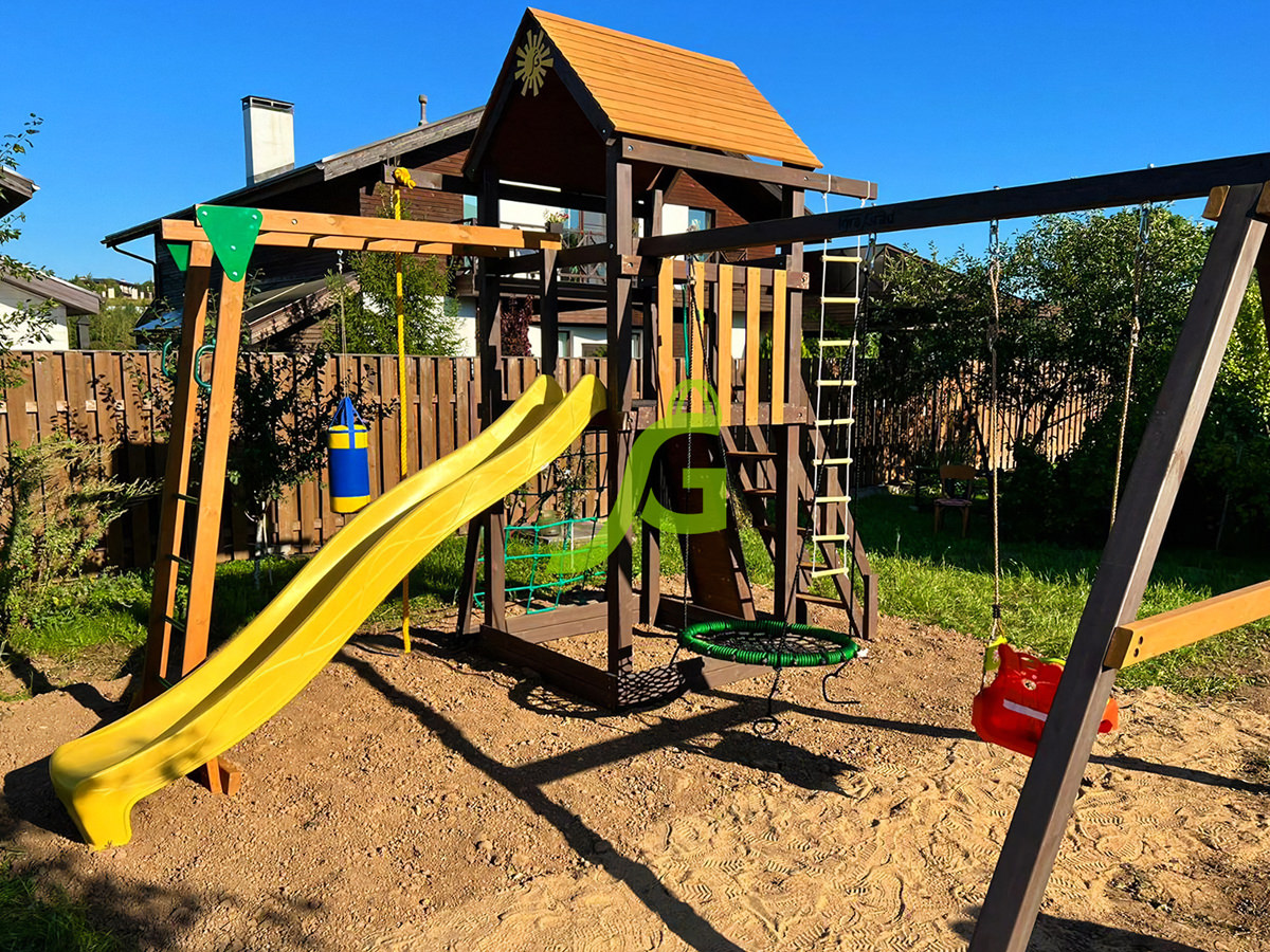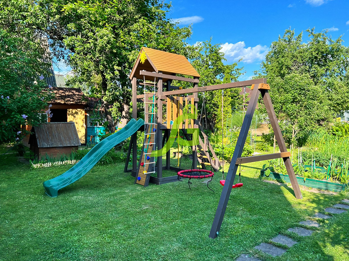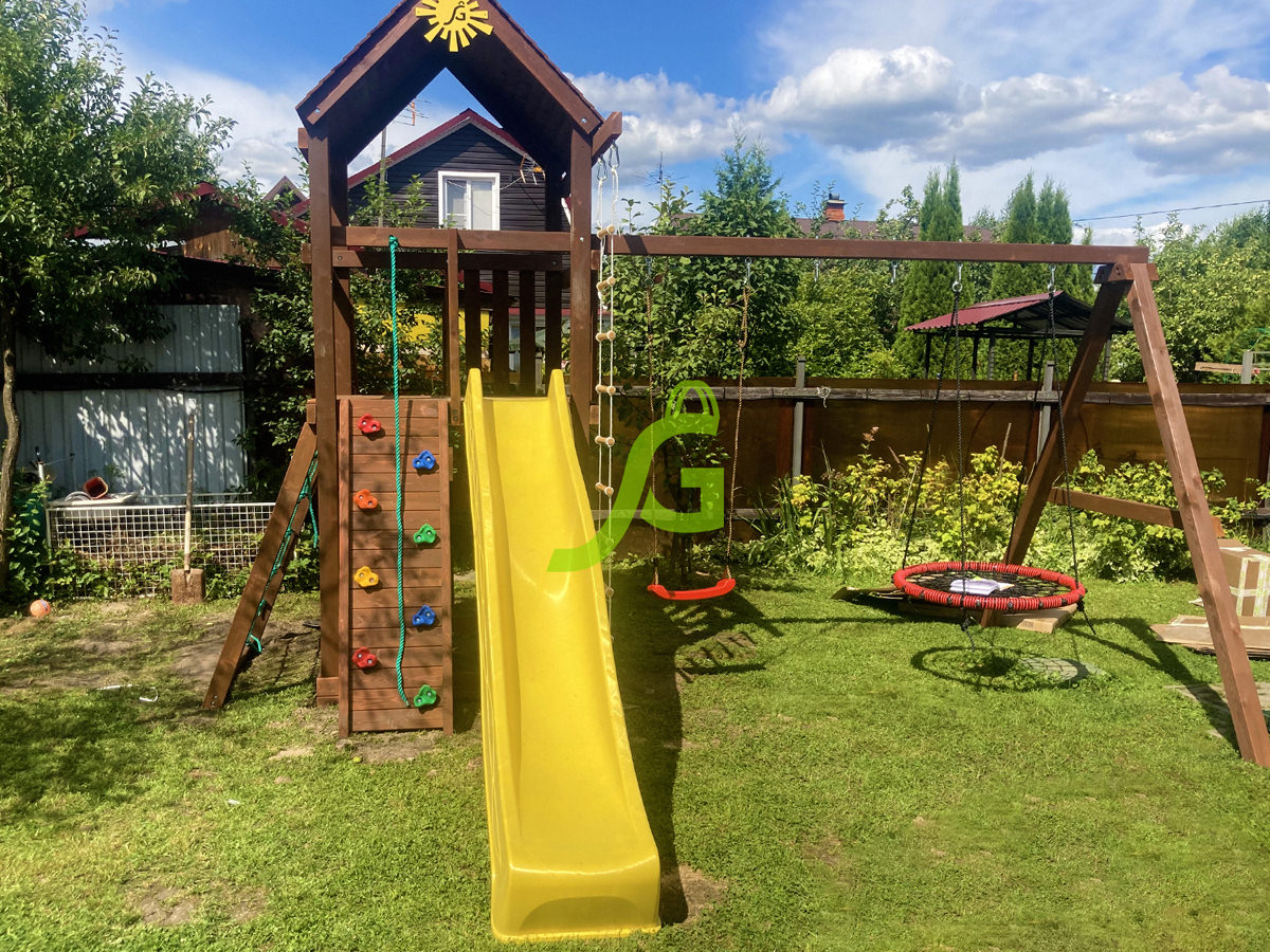Обращаем Ваше внимание, что цвет установленной детской площадки может отличаться от представленных изображений на сайте. Специфика окраски нетоксичными пропитками допускает отклонения в цветовой гамме отгружаемых изделий вследствие различного цвета натурального природного сырья и естественных компонентов, используемых для производства площадок.
