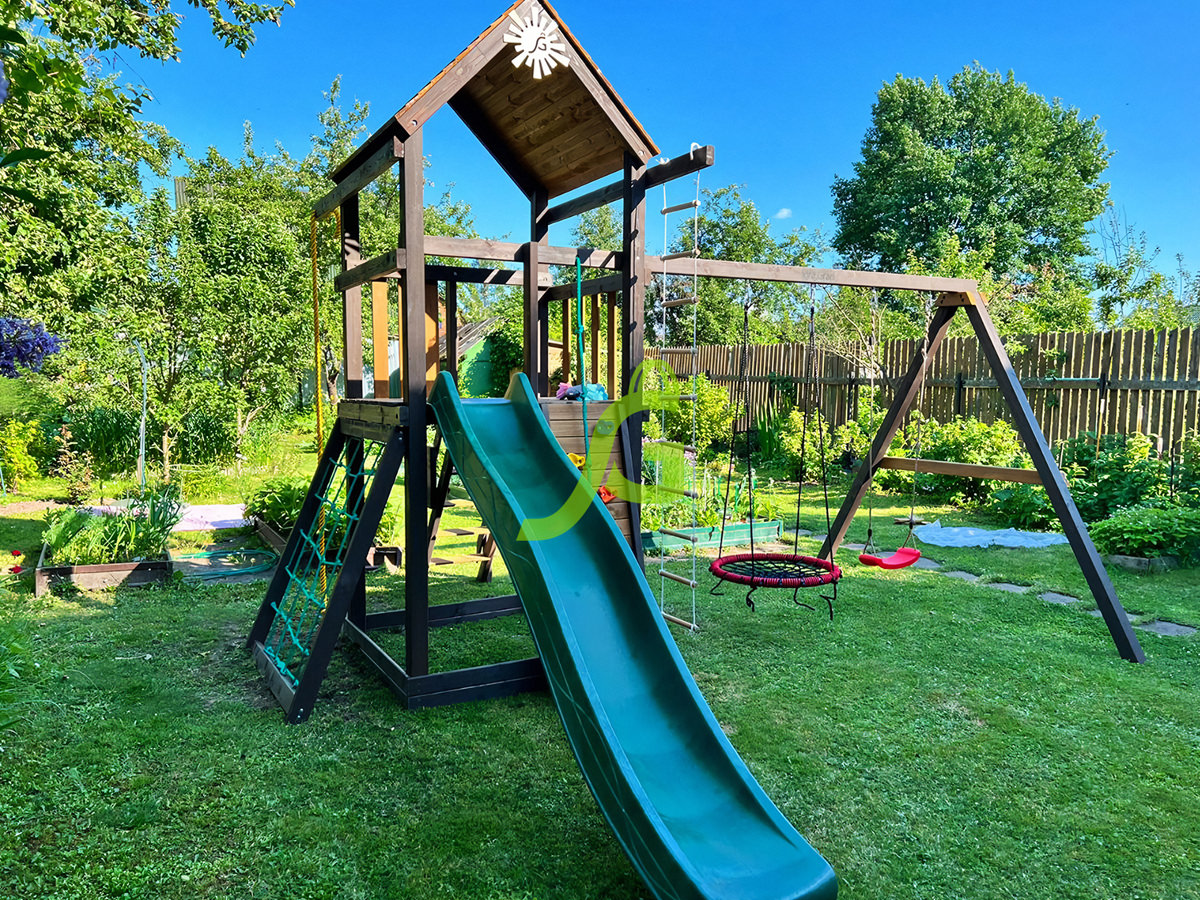 Создавая продукцию для детей, мы понимаем, насколько важны качество и безопасность конструкции. Именно поэтому детские площадки для дачи изготовлены из натурального дерева и покрыты специальной нетоксичной пропиткой.