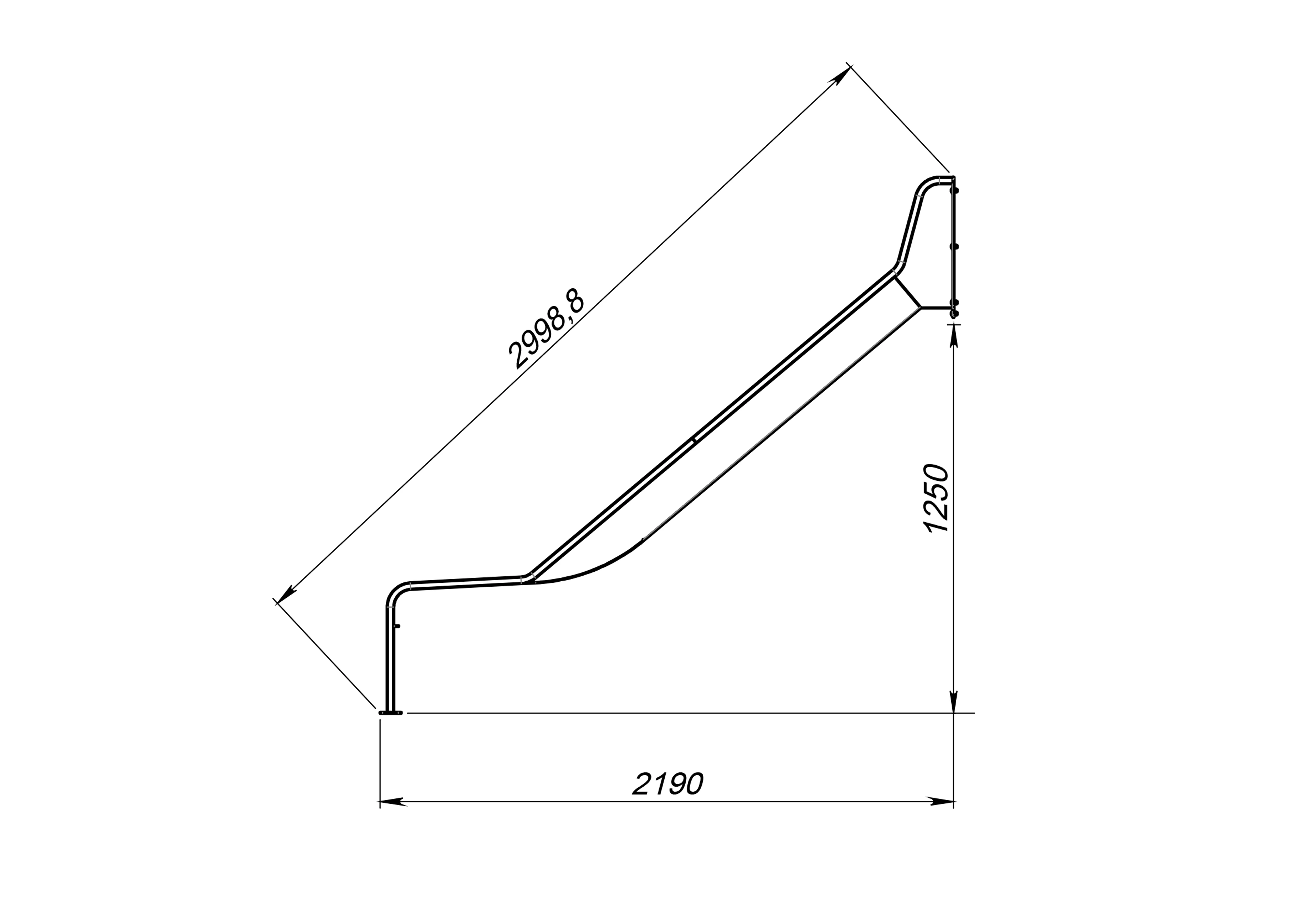 Встраиваемая горка из нержавеющей стали AISI 304 толщиной 2 мм. Ширина гладкого ската — 500 мм. Загиб в конце обеспечивает плавное и безопасное торможение. Конструкция оснащена защитными бортиками и устанавливается под углом 40°. Идеальный вариант для детей младшего возраста. Высота стартового участка — 1250 мм. Прочная цельносварная конструкция устойчива к любым погодным условиям.