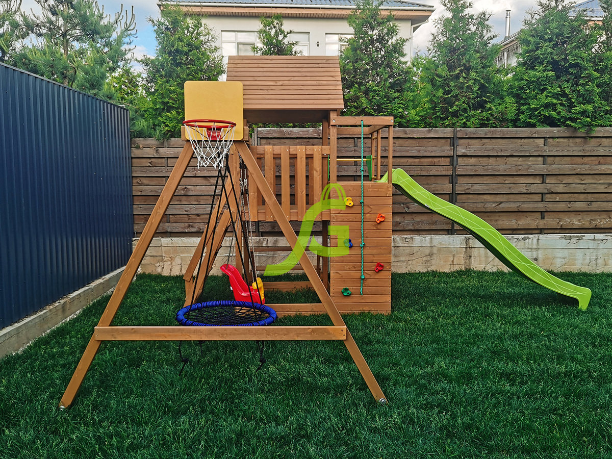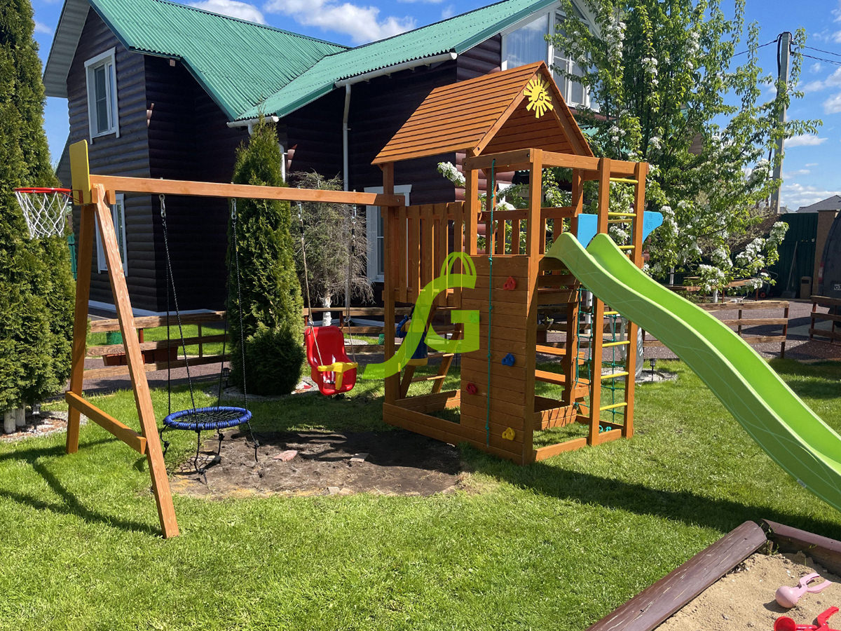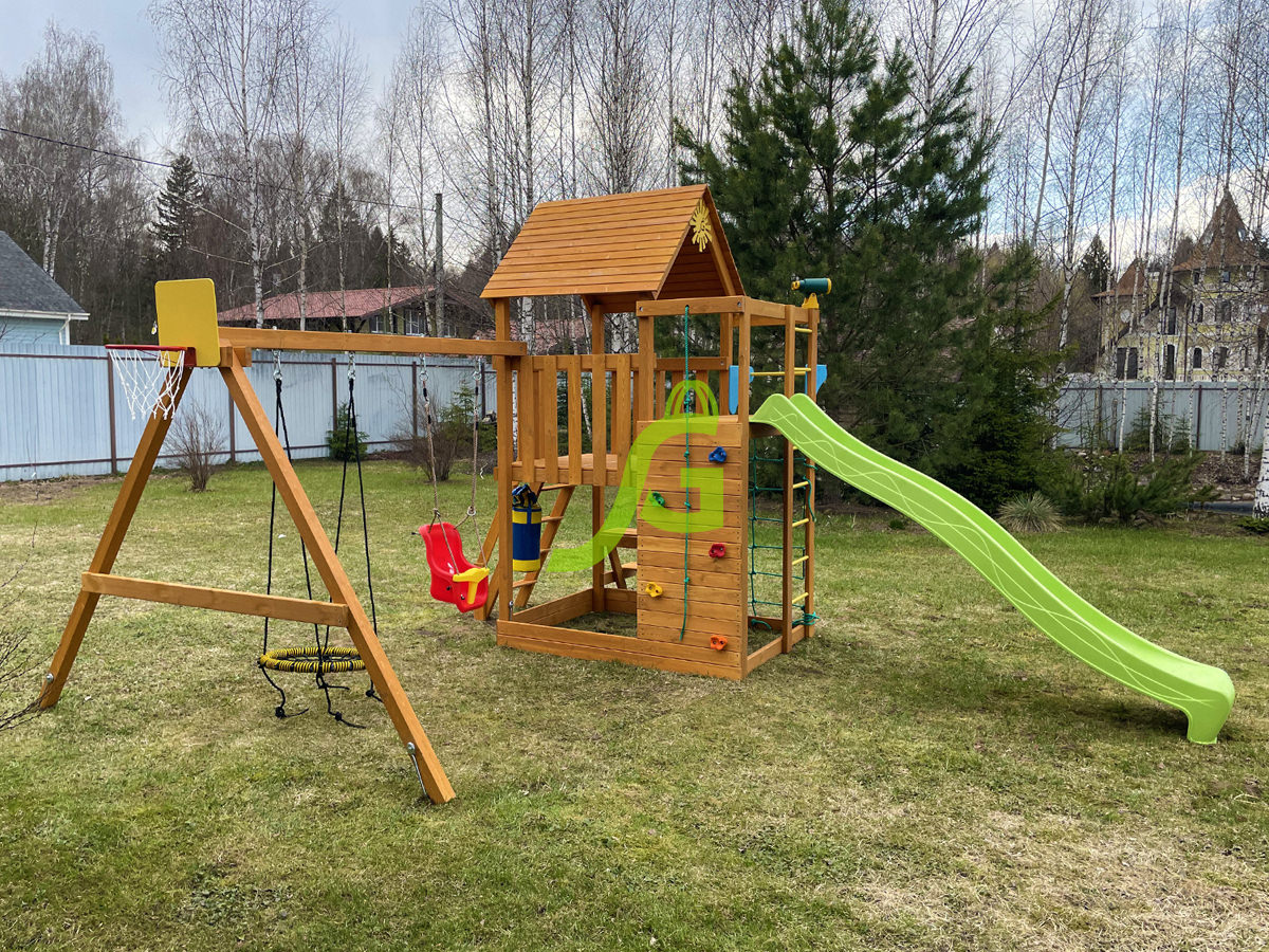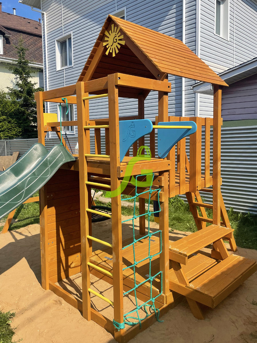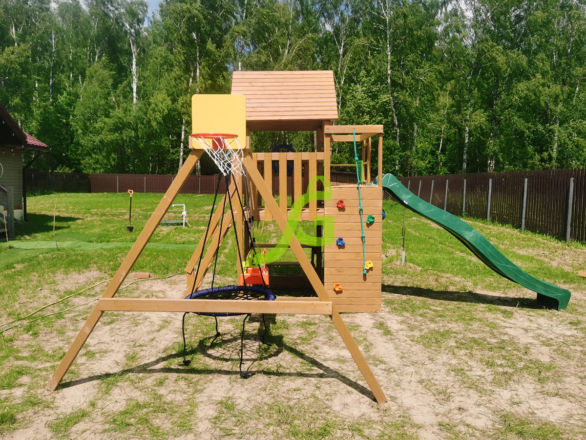Обращаем Ваше внимание, что цвет установленной детской площадки может отличаться от представленных изображений на сайте. Специфика окраски нетоксичными пропитками допускает отклонения в цветовой гамме отгружаемых изделий вследствие различного цвета натурального природного сырья и естественных компонентов, используемых для производства площадок.