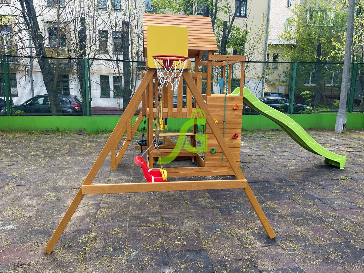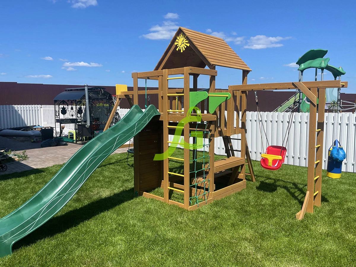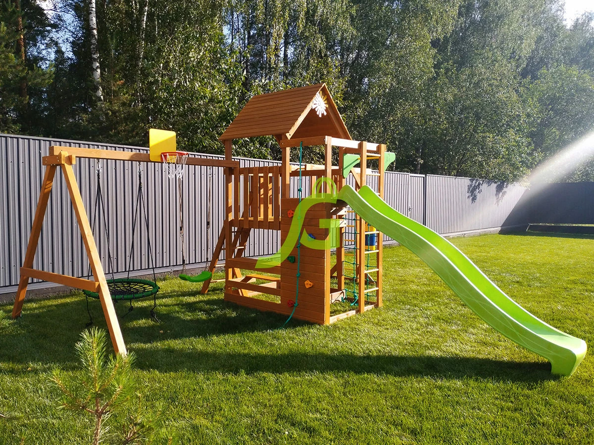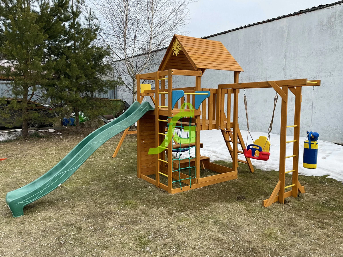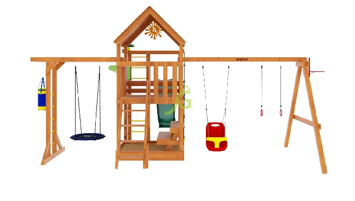 Обращаем Ваше внимание, что цвет установленной детской площадки может отличаться от представленных изображений на сайте. Специфика окраски нетоксичными пропитками допускает отклонения в цветовой гамме отгружаемых изделий вследствие различного цвета натурального природного сырья и естественных компонентов, используемых для производства площадок.