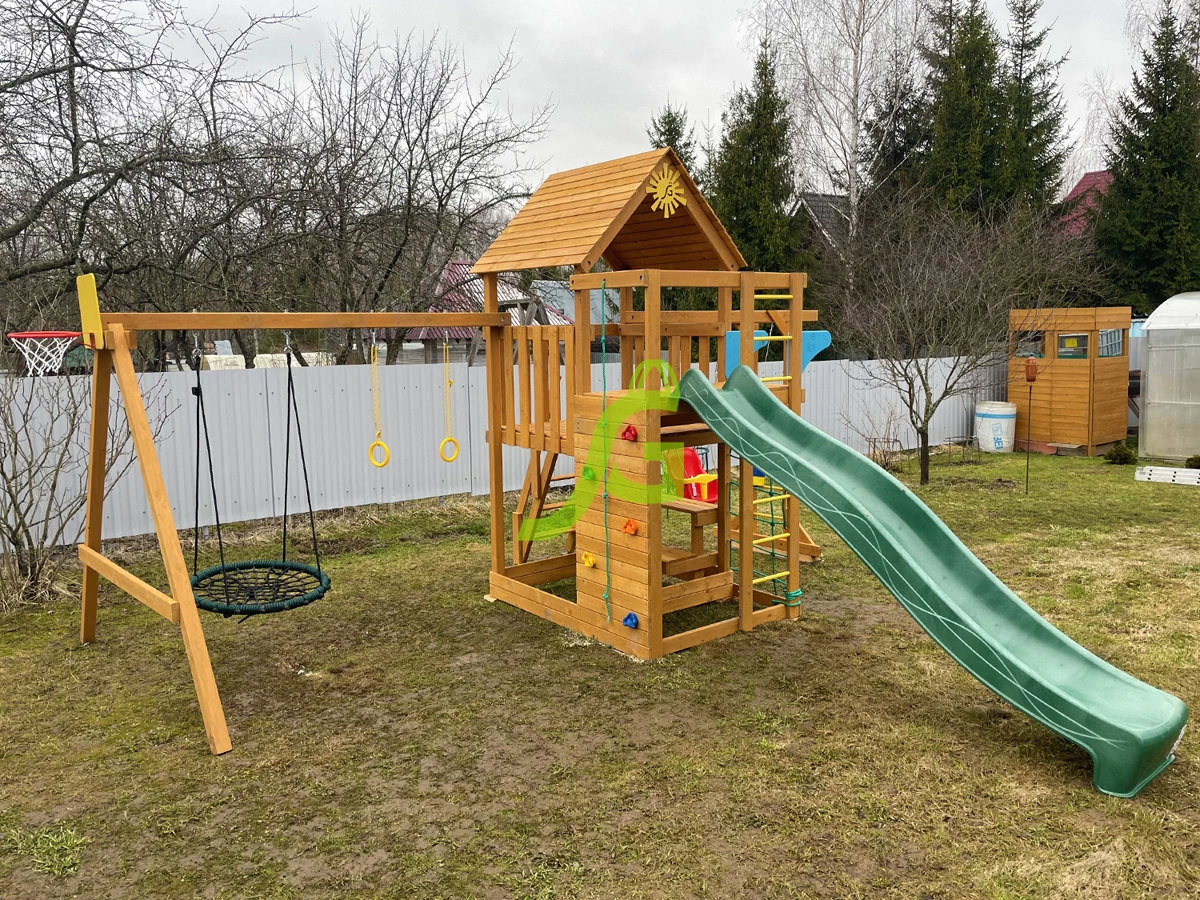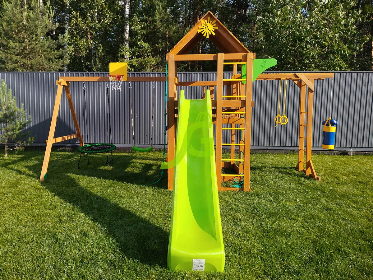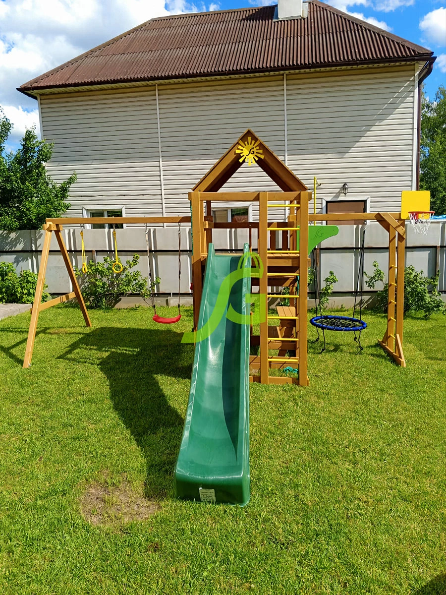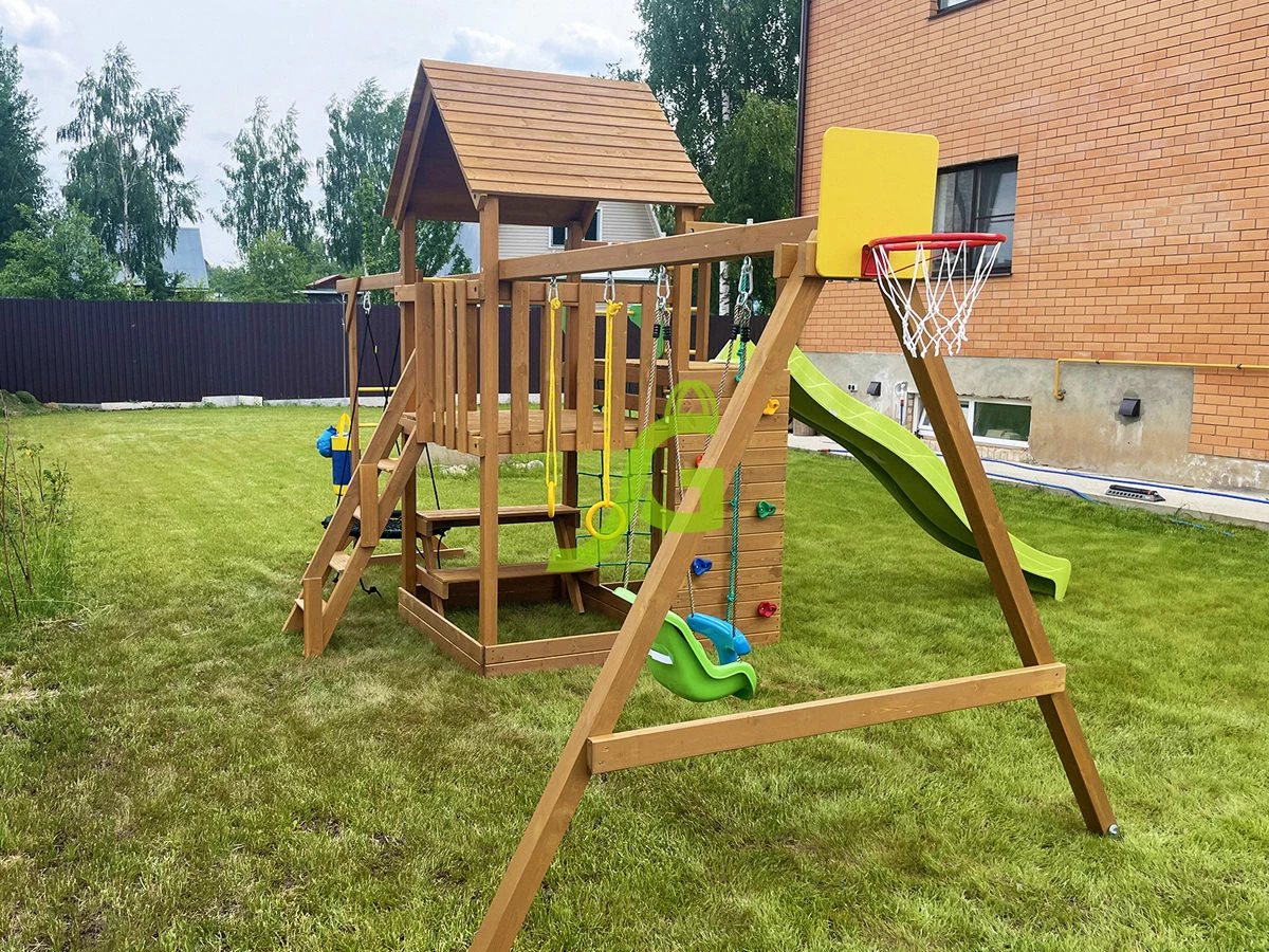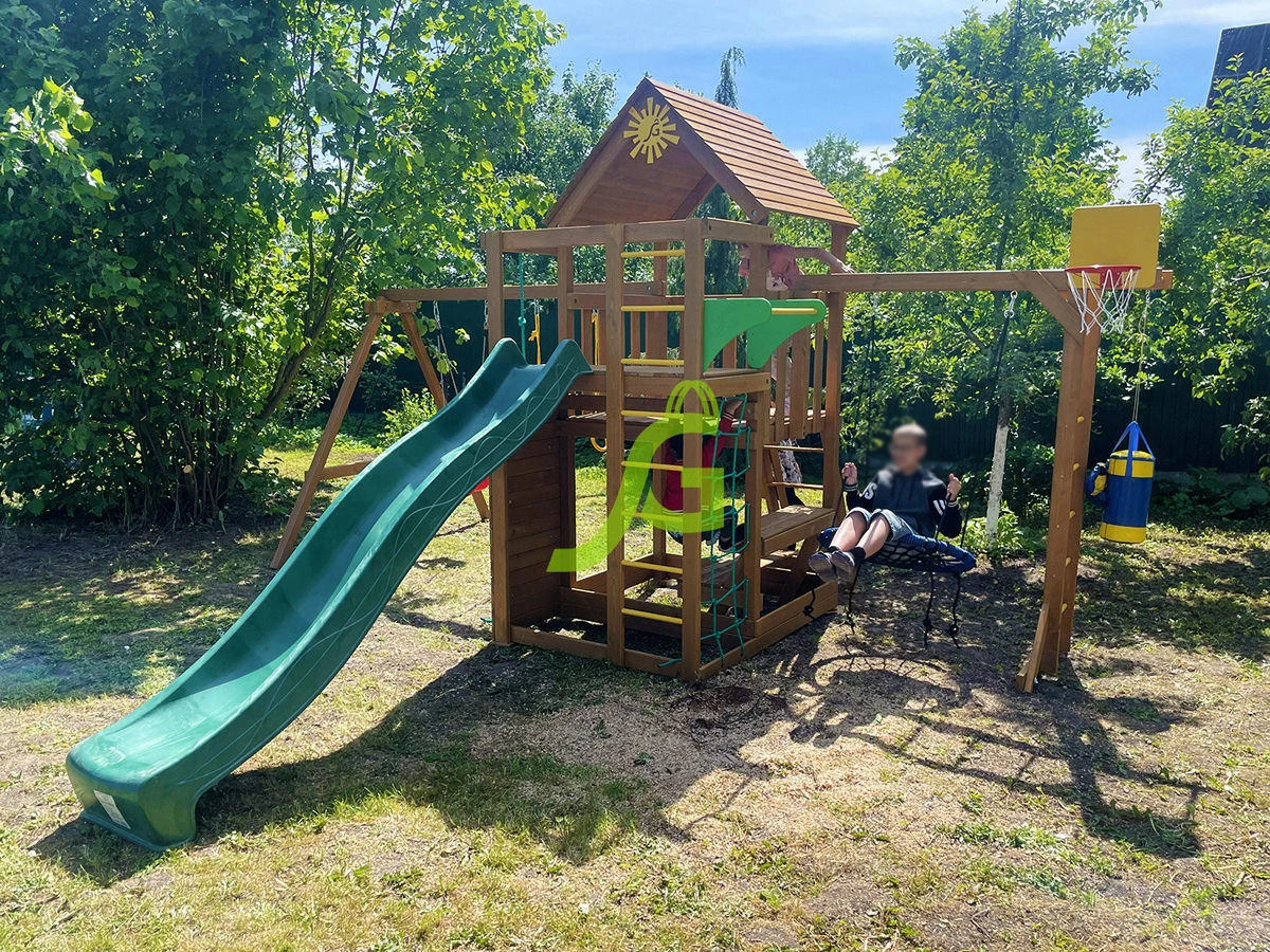 Обращаем Ваше внимание, что цвет установленной детской площадки может отличаться от представленных изображений на сайте. Специфика окраски нетоксичными пропитками допускает отклонения в цветовой гамме отгружаемых изделий вследствие различного цвета натурального природного сырья и естественных компонентов, используемых для производства площадок.