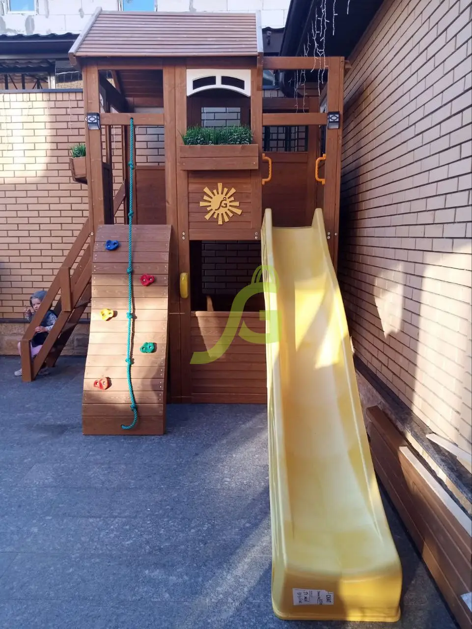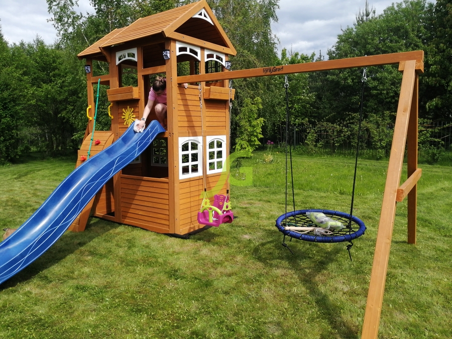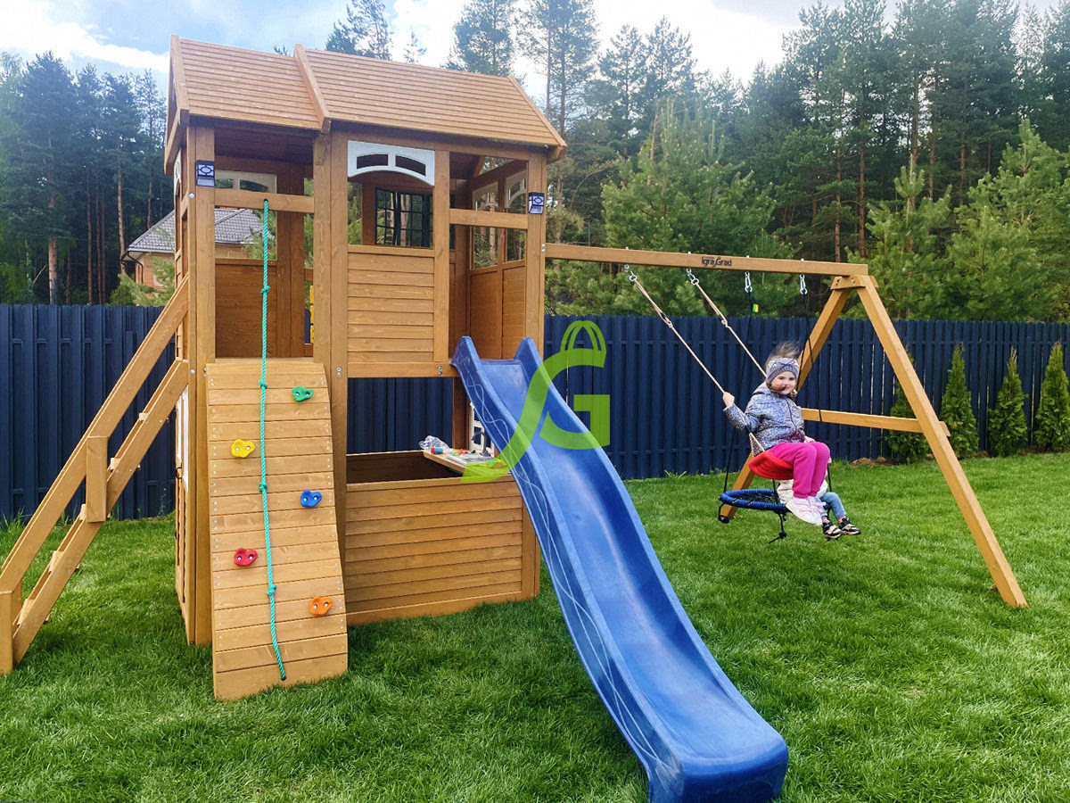 Детская площадка для дачи "Клубный домик 2 Luxe" включает в себя комплекс спортивно-развлекательных элементов: двухуровневый домик оснащен деревянной крышей и дверью, деревянной лестницей и скалодромом. Занимательная трехметровая волновая горка и качели не оставят равнодушными любителей скоростных спусков и полетов. Развитию физической силы способствуют канат и трапеция с кольцами. Для будущих мыслителей предусмотрена игровая доска "Крестики-нолики". И все это вместилось в компактный вариант детской игровой площадки «Клубный домик 2».