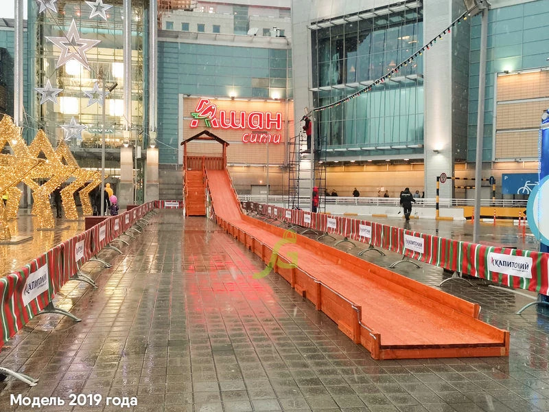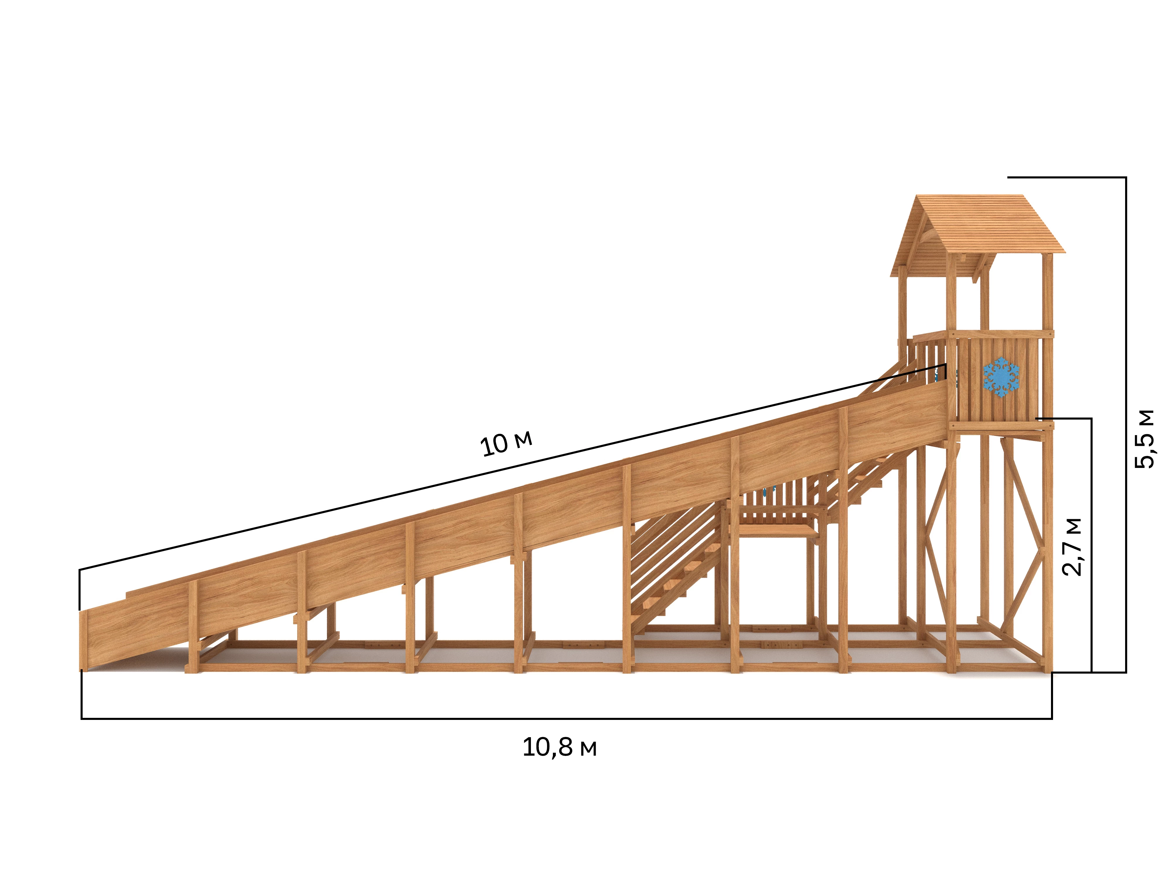 10-ти метровый скат безопасен для катания детей дошкольного возраста, потому что он имеет оптимальную высоту. Дети могут подниматься вверх по удобной лестнице, держась за перила. Площадка в верхней части достаточно просторная и оборудована деревянной крышей. Она позволит ребятам укрыться от обильных осадков, ветра, весело общаясь друг с другом.