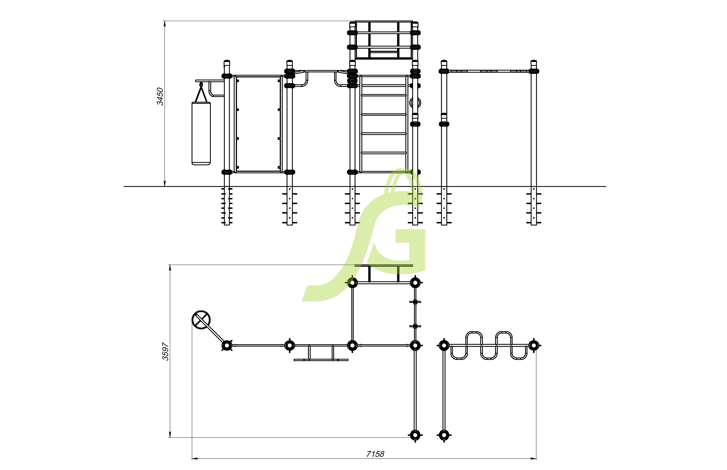 Это настоящий тренажёрный зал под открытым небом, который подойдёт как для профессиональных атлетов, так и для семейного активного отдыха. Все элементы смонтированы на надёжных опорах диаметром 108 мм с обязательным бетонированием в грунт, что гарантирует абсолютную устойчивость и безопасность даже при самых интенсивных нагрузках. Конструкция выполнена в антивандальном, всепогодном исполнении и рассчитана на долгие годы эксплуатации.