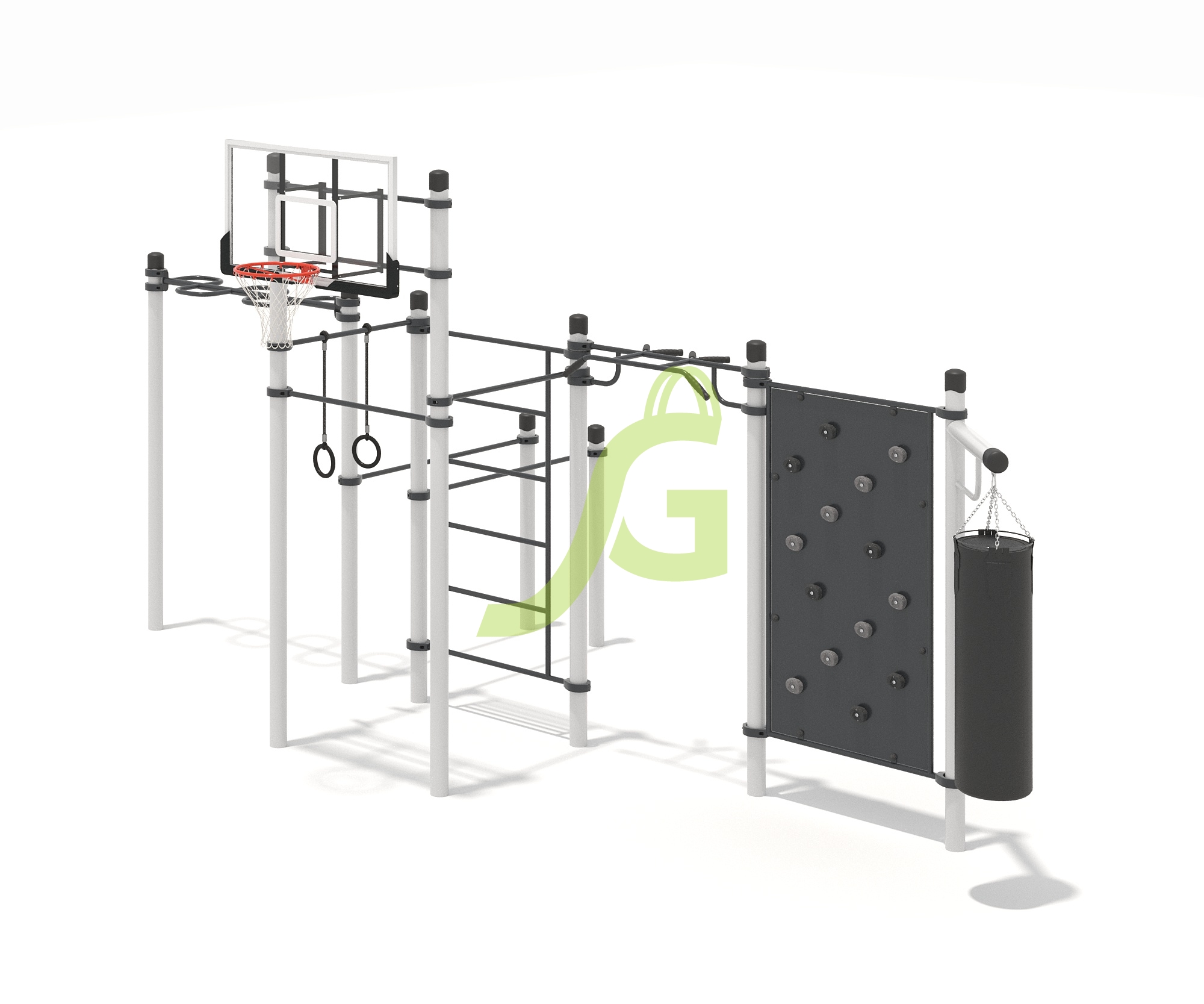 Баскетбольное кольцо — Позволяет отрабатывать броски мяча, играть в стритбол и проводить баскетбольные тренировки. Ключевые особенности и преимущества: Всепогодность: Все несущие элементы (опоры, перекладины) выполнены из стали с многослойным порошковым покрытием, устойчивым к коррозии, ультрафиолету, перепадам температур. Конструкция не боится дождя, снега и мороза. Безопасность: Проектирование и изготовление соответствуют ГОСТ Модульность и универсальность: Комплекс легко адаптируется под конкретные задачи — можно добавлять или заменять модули. Подходит для всех возрастных групп: дети осваивают скалодром, рукоходы и кольца в игровой форме, взрослые проводят полноценные силовые и кардиотренировки. Продуманная эргономика: Диаметр перекладин оптимизирован для комфортного и надёжного хвата. Высота расположения элементов регулируется на этапе монтажа. Привлекательный дизайн: Современный внешний вид, возможность выбора цвета опор по каталогу RAL позволяет вписать комплекс в любой архитектурный стиль. Для кого этот комплекс? Для застройщиков и девелоперов жилых кварталов — оптимальное решение для оснащения дворовых спортивных зон. Комплекс повышает привлекательность жилого комплекса, способствует формированию здорового сообщества жителей и полностью соответствует современным требованиям к благоустройству территорий. Для владельцев частных домов и дач — возможность создать на участке полноценный уличный спортзал для всей семьи. Для организаторов спортивных площадок (парки, зоны отдыха, фитнес-клубы под открытым небом, гостиничные комплексы, школы, детские лагеря, спортивные секции). Для всех, кто ценит активный образ жизни и хочет тренироваться на свежем воздухе с максимальным комфортом и разнообразием. Комплектация: Модуль рукохода «Змейка» в сборе. Модуль брусьев. Модуль разнохватового турника. Два модуля прямых турников. Модуль шведской стенки. Гимнастические кольца с креплением. Боксерский мешок со стойкой 108 мм и кронштейном. Модуль скалодрома с комплектом зацепов. Баскетбольное кольцо с креплением. Крепёжные элементы, заглушки, анкерные выпуски. Инструкция по монтажу и эксплуатации. Важно: Изделие предназначено для стационарной установки методом бетонирования опор в грунт. Монтаж должен производиться в соответствии с инструкцией для обеспечения безопасности и долговечности. Комплекс рассчитан на интенсивную эксплуатацию в любых погодных условиях, не требует дополнительной защиты от атмосферных воздействий. При использовании боксерского мешка необходимо соблюдать технику безопасности и применять защитную экипировку Оборудование соответствует требованиям безопасности для использования на открытых спортивных площадках.