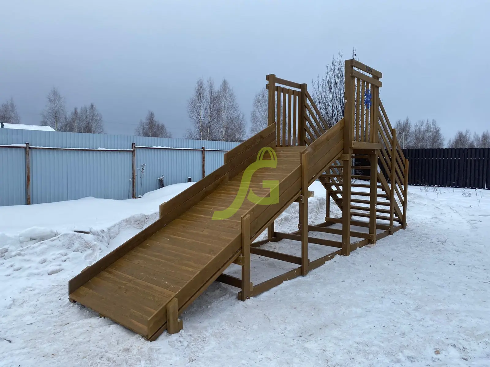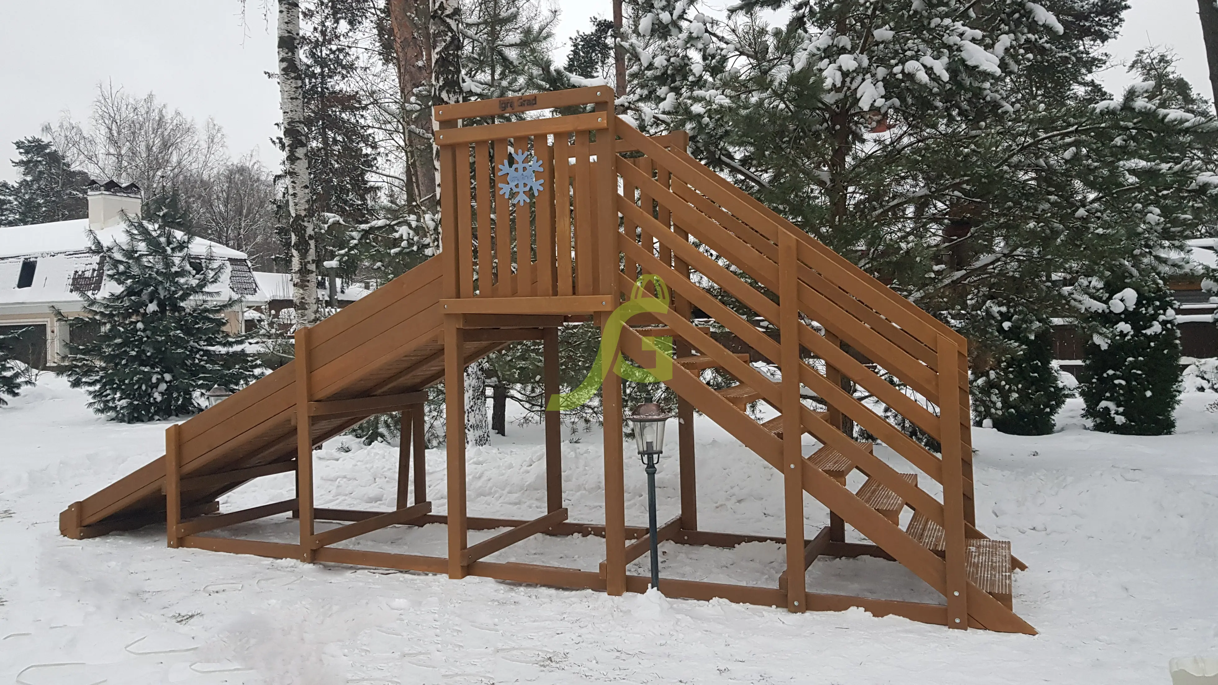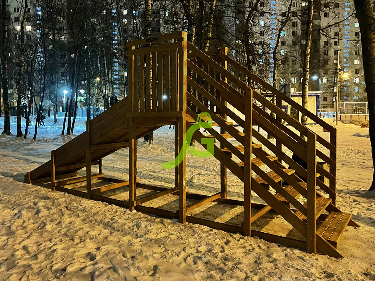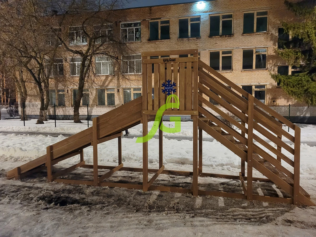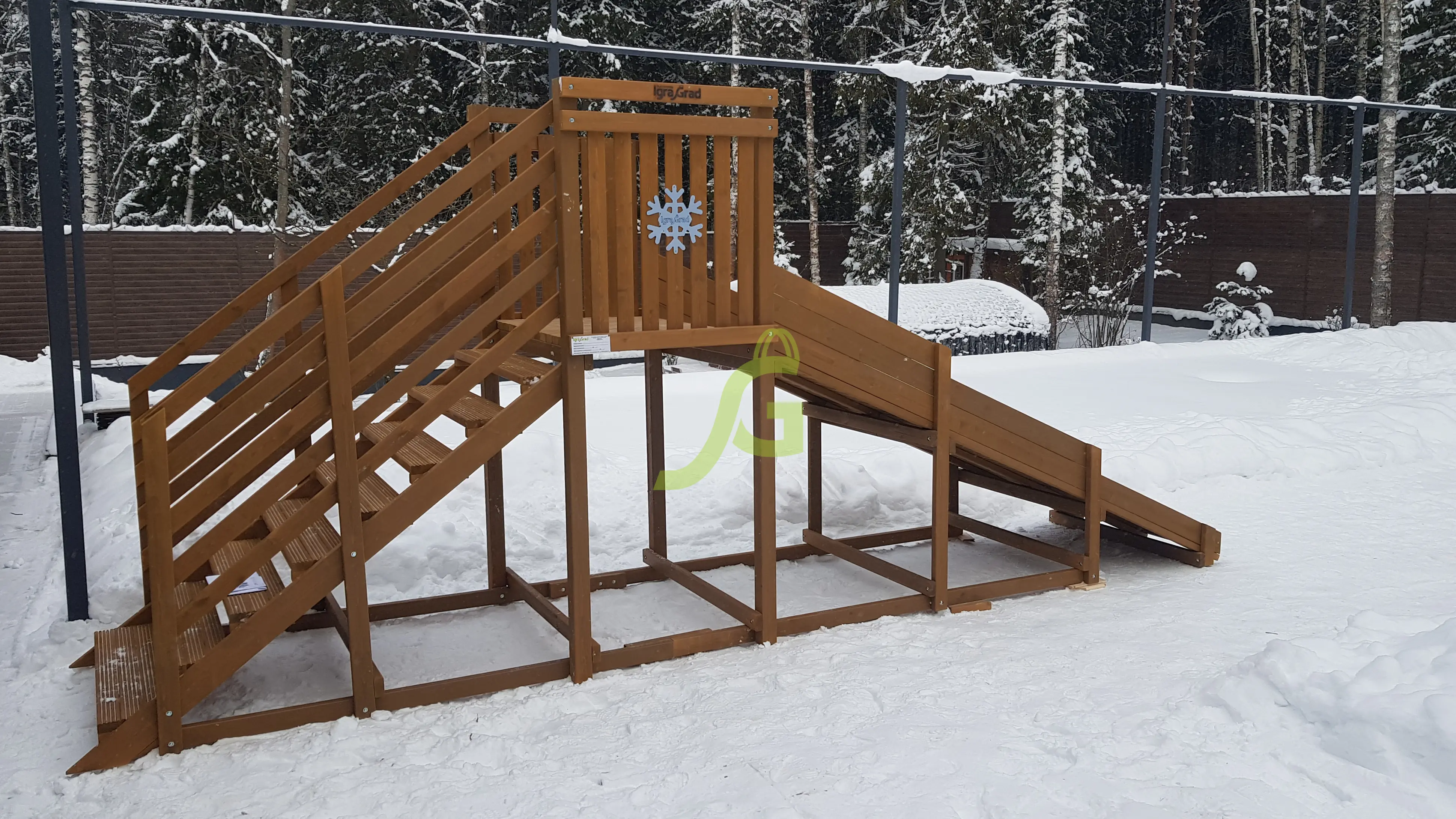 Даже ребята дошкольного возраста смогут самостоятельно взобраться наверх по ступенькам, держась за перила. Небольшая площадка в верхней части позволит детишкам удобно расположиться на ледянке или саночках.