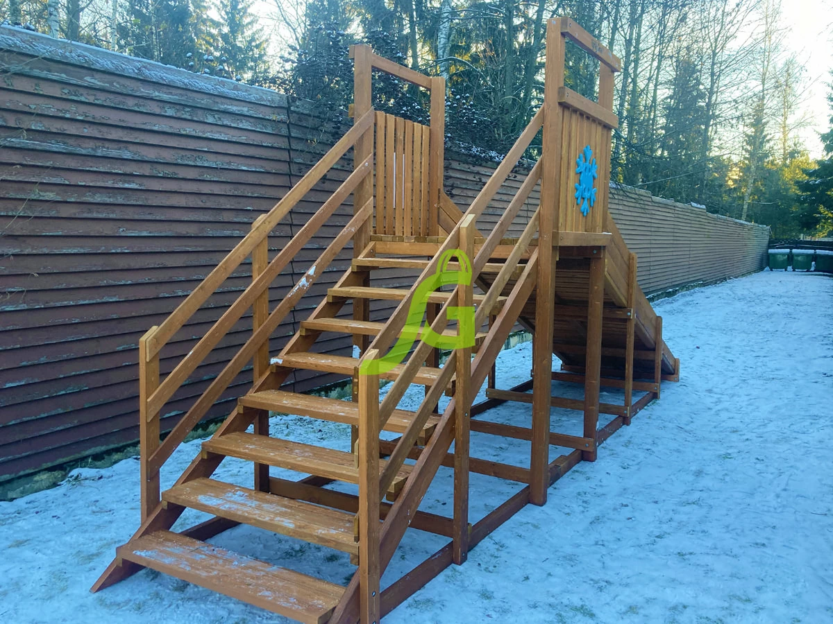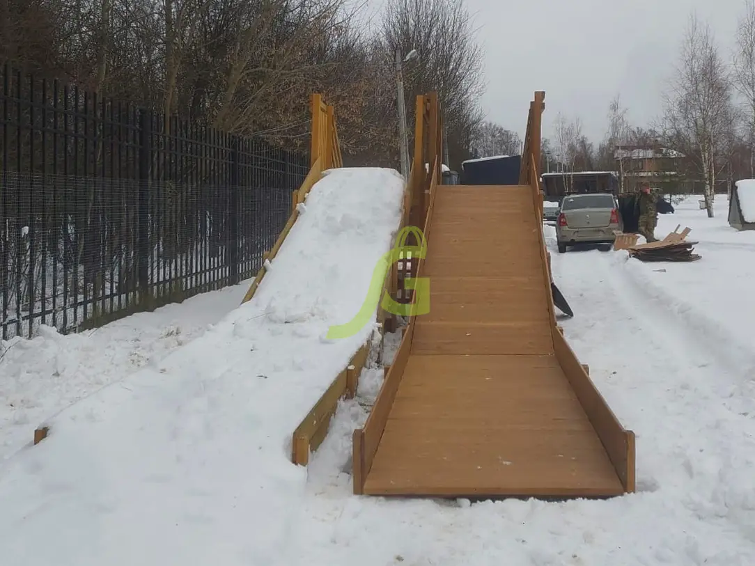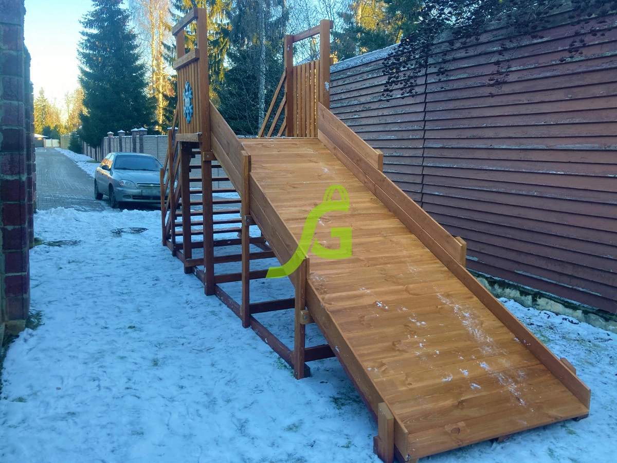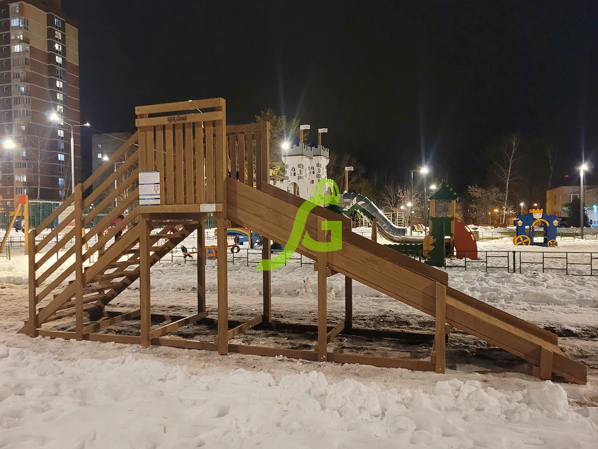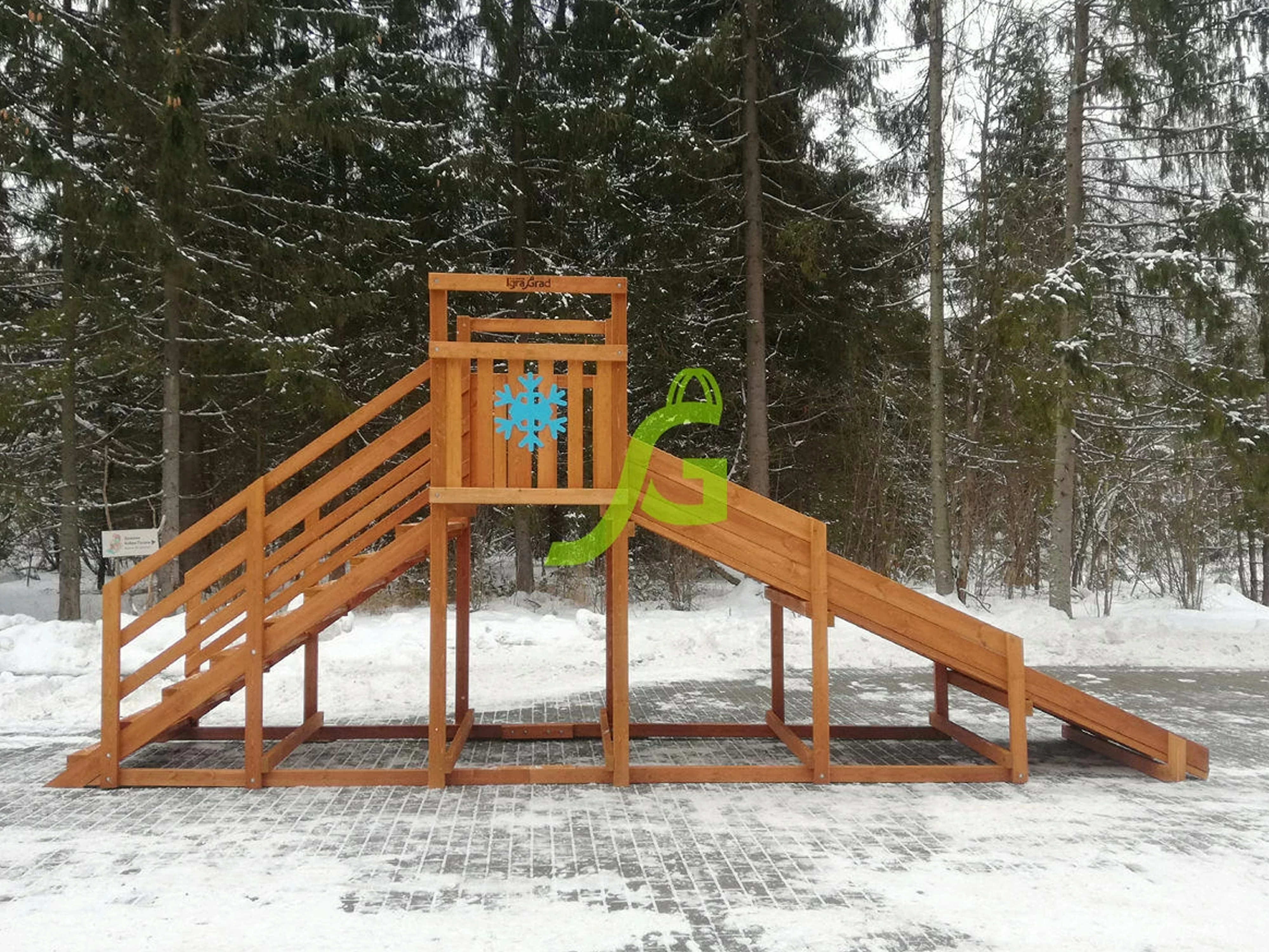 Даже ребята дошкольного возраста смогут самостоятельно взобраться наверх по ступенькам, держась за перила. Небольшая площадка в верхней части позволит детишкам удобно расположиться на ледянке или саночках.
