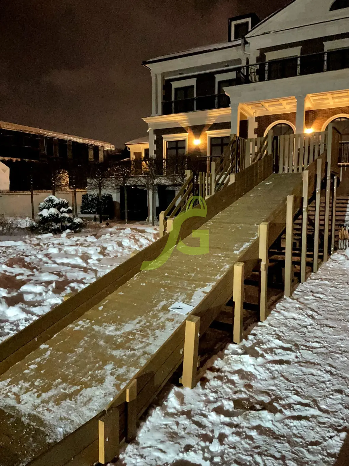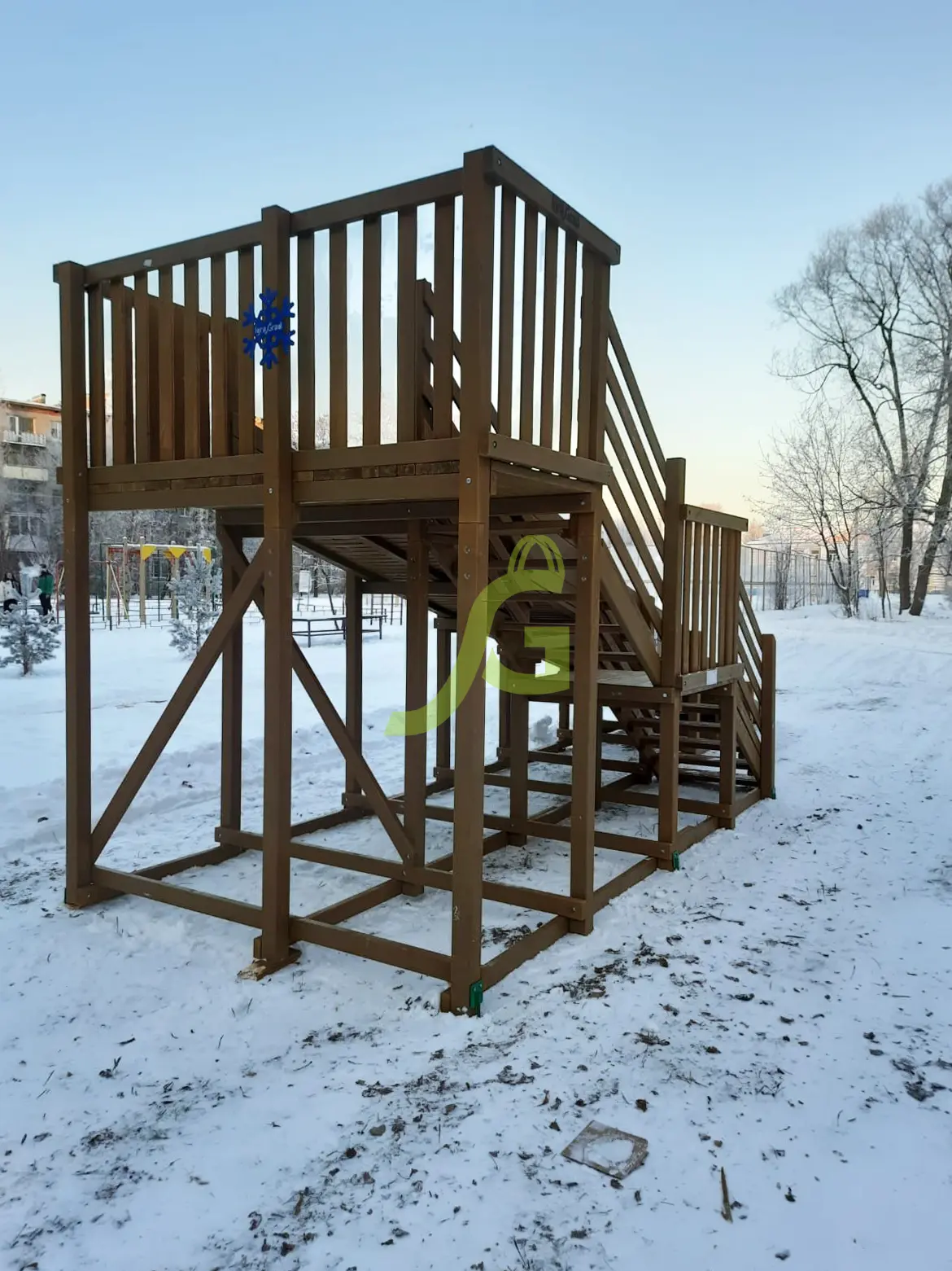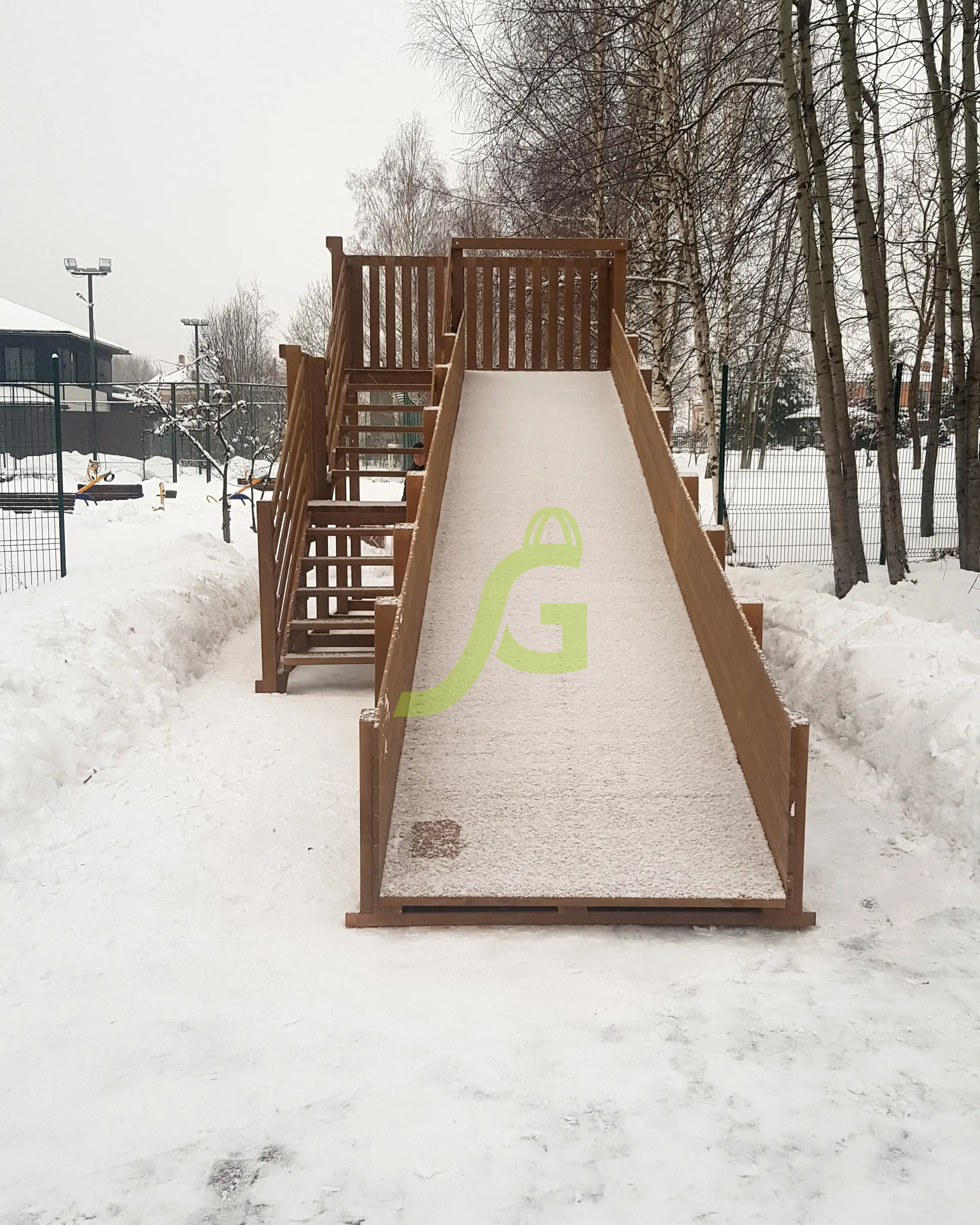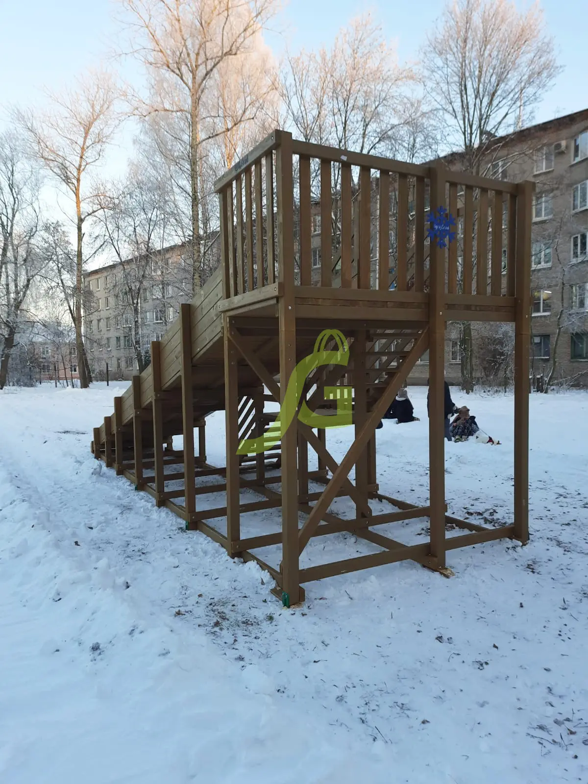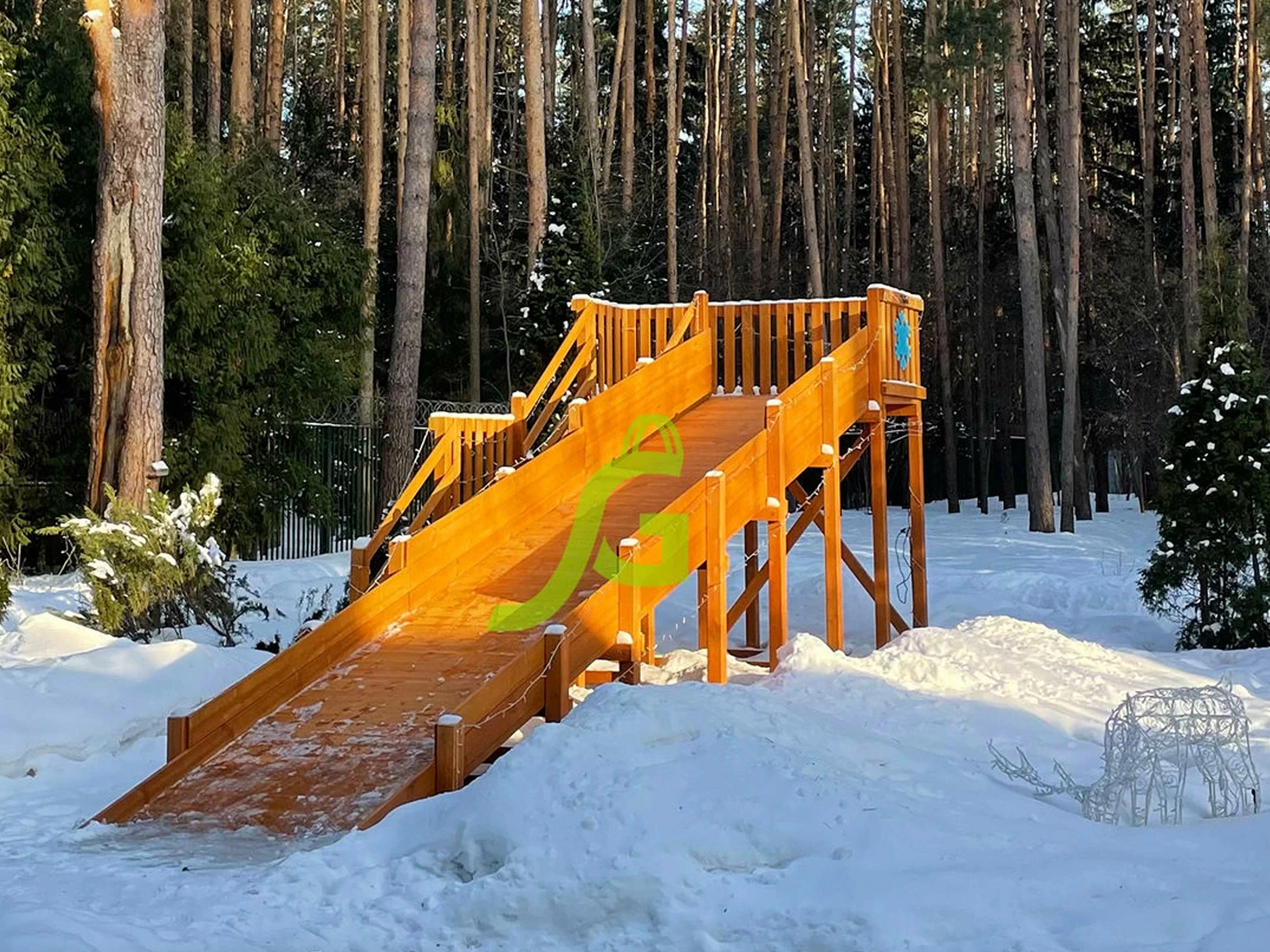 Для подъёма вверх конструкция оснащена лестницей и перилами. Рекомендуется каждый день очищать ступеньки от снега, чтобы на них не натаптывались ледышки, подвергающие детей опасности.